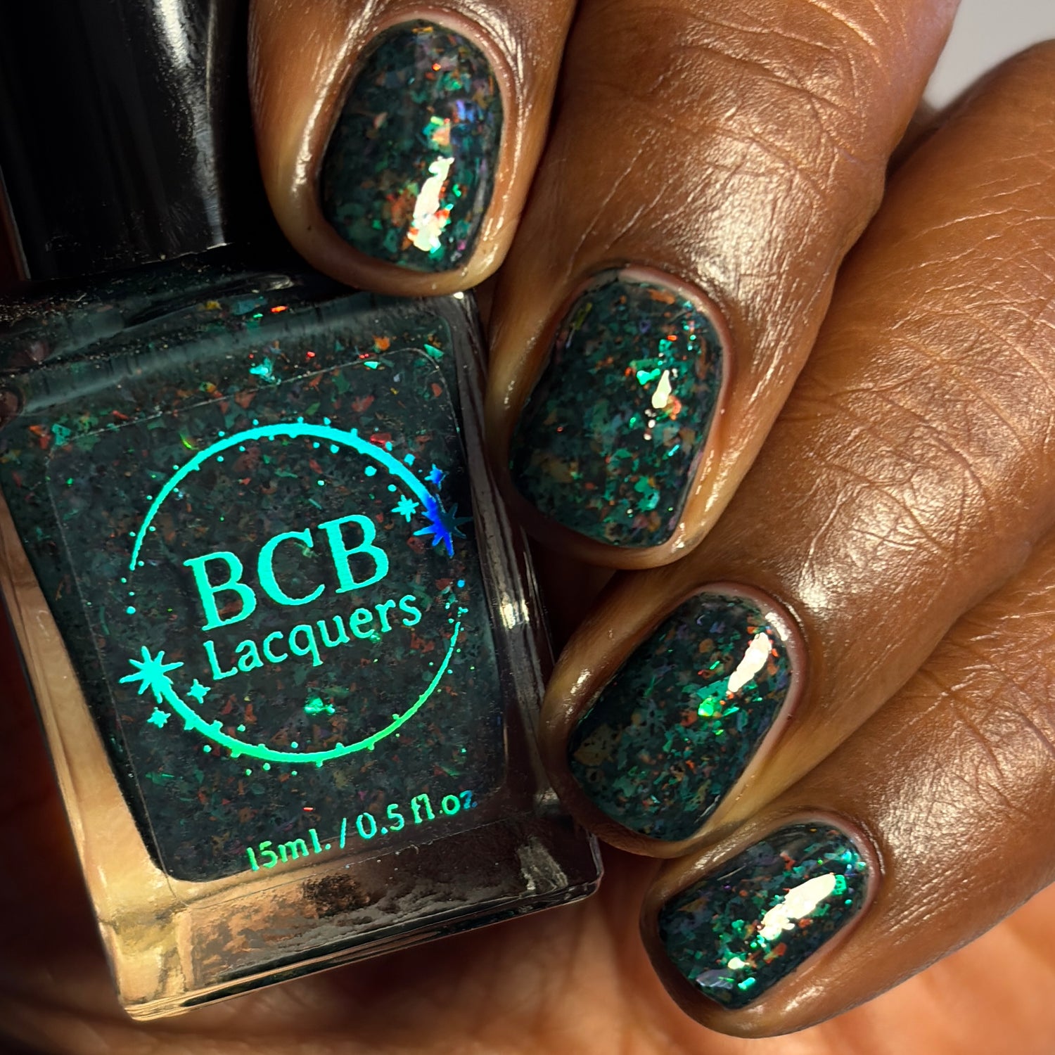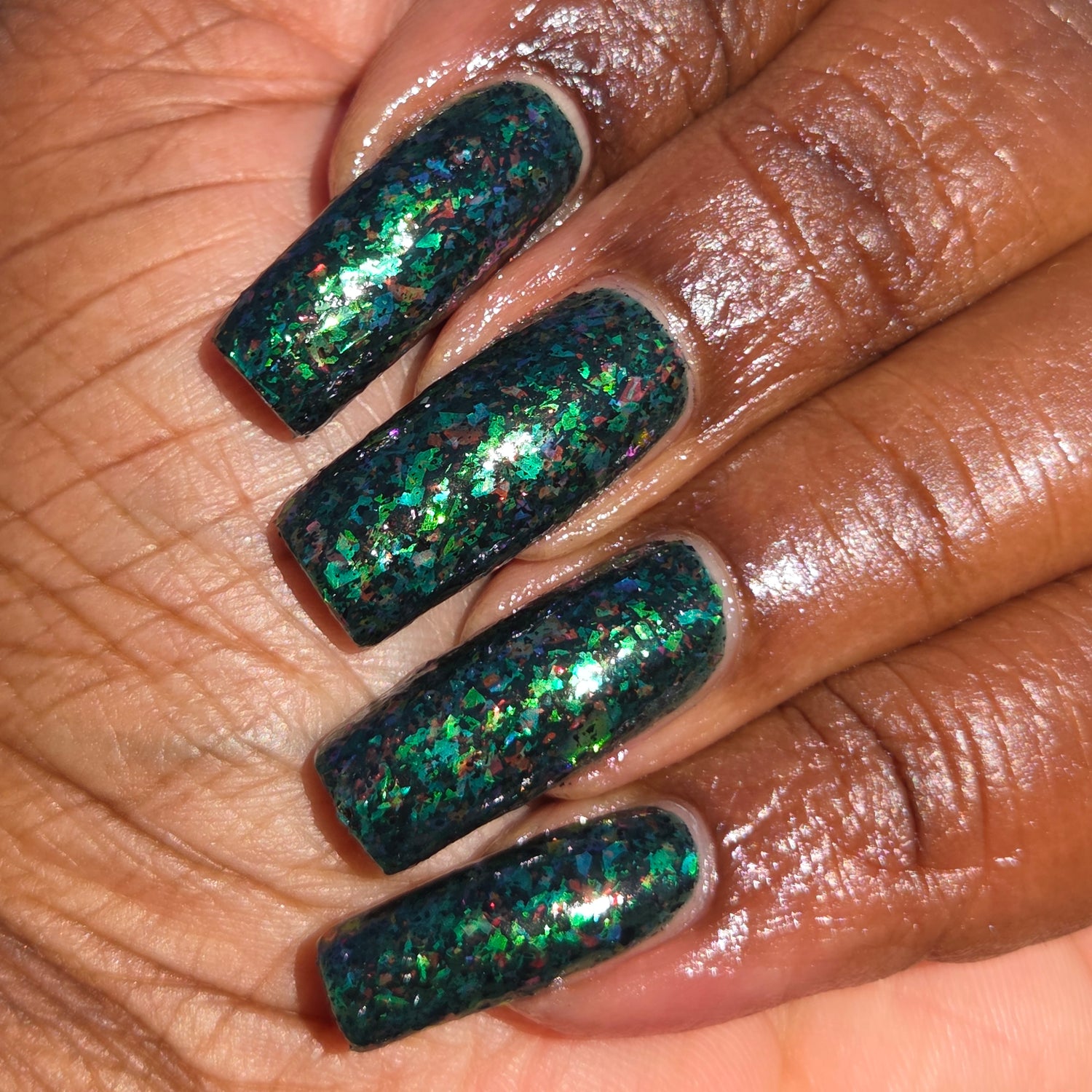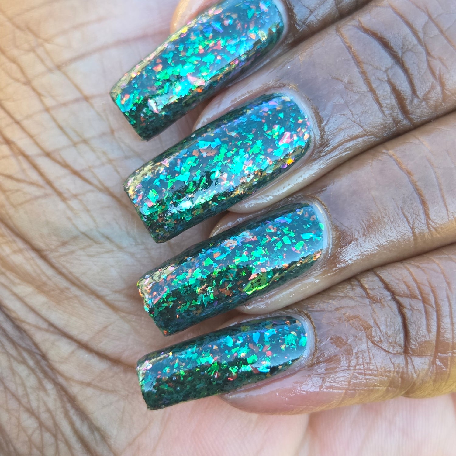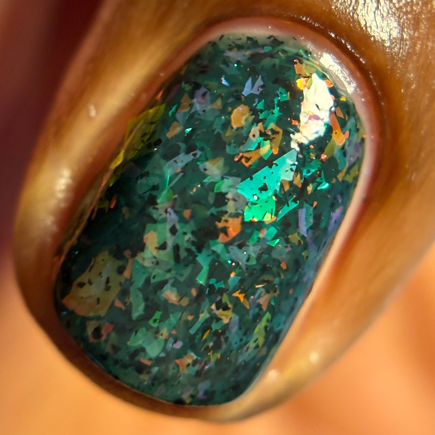 Alright Then, Keep Your Secrets: A tucson teal crelly with green/purple/pink glass flakes, red/orange/gold glass flakes and black flakes.