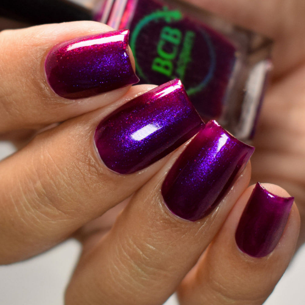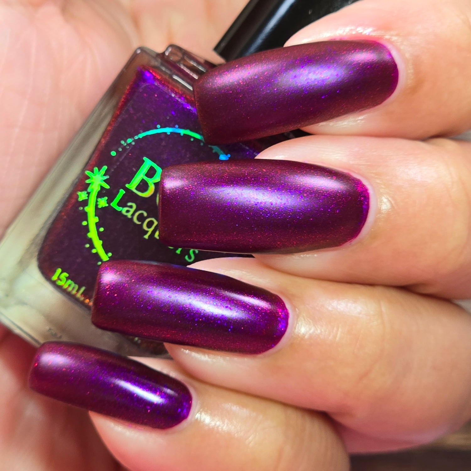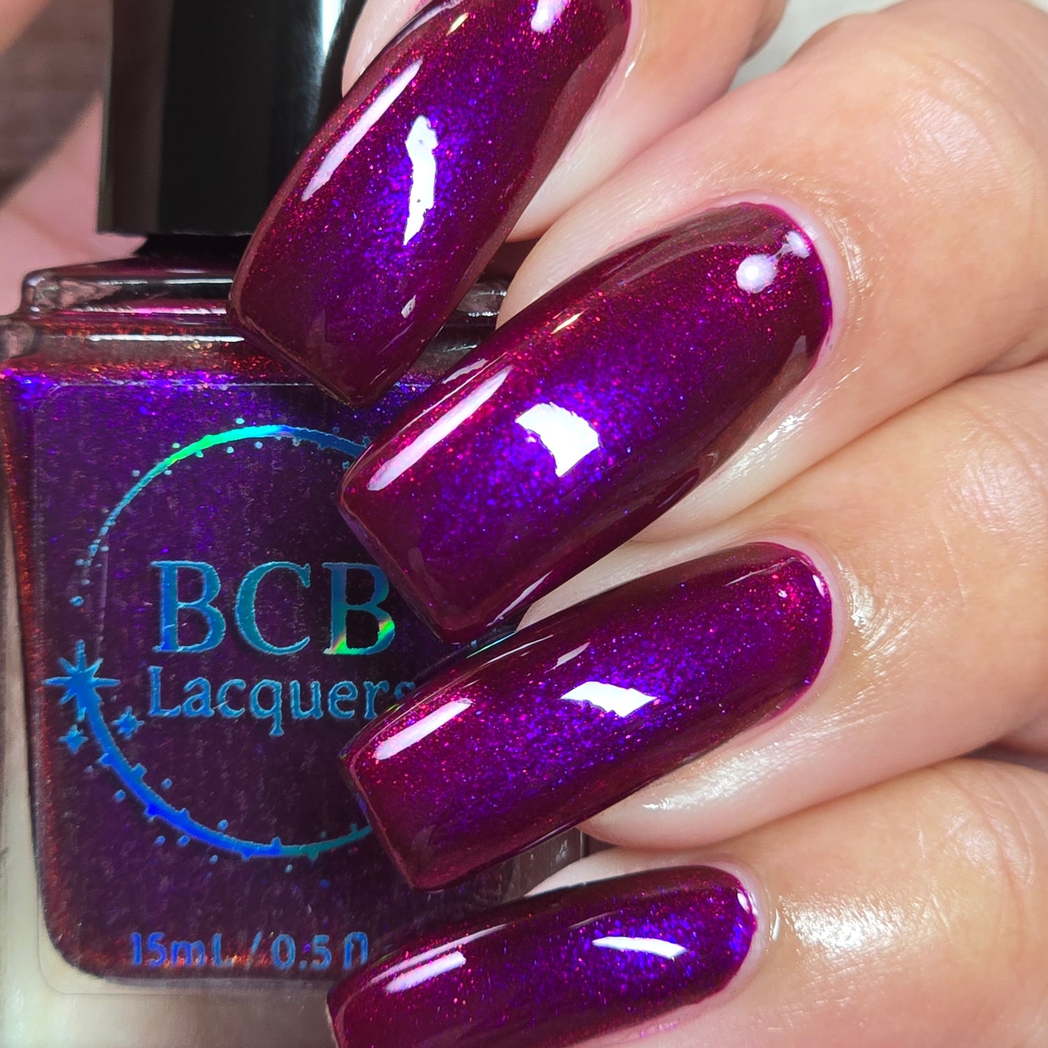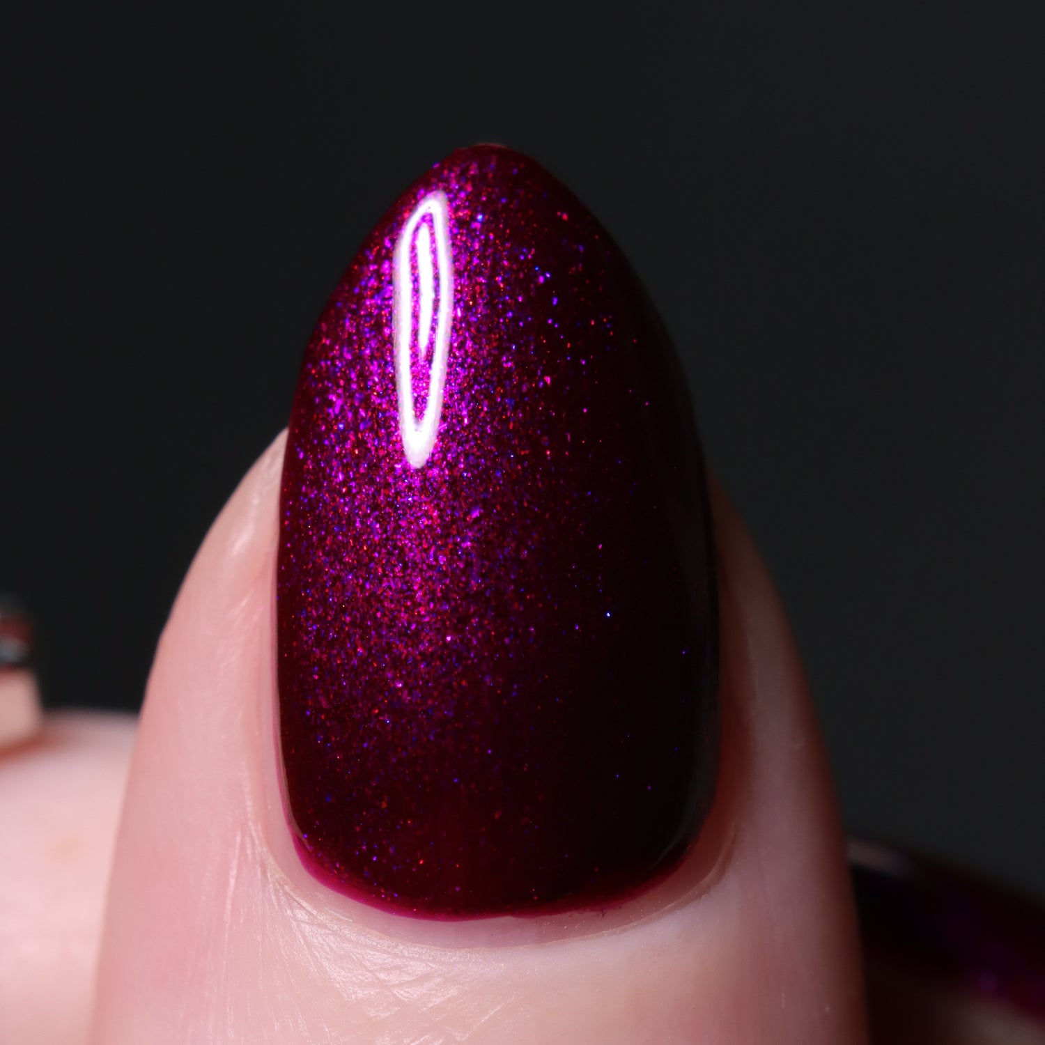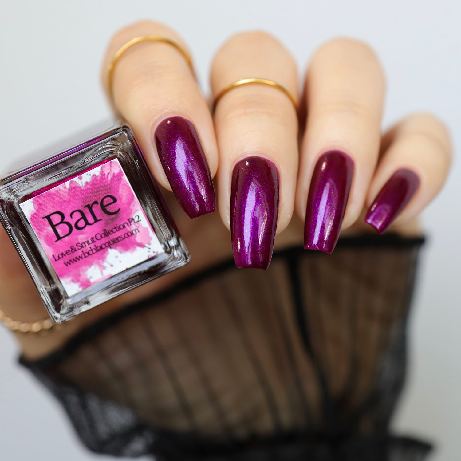 Bare: A deep maroon jelly with a strong pink/purple shifting shimmer.