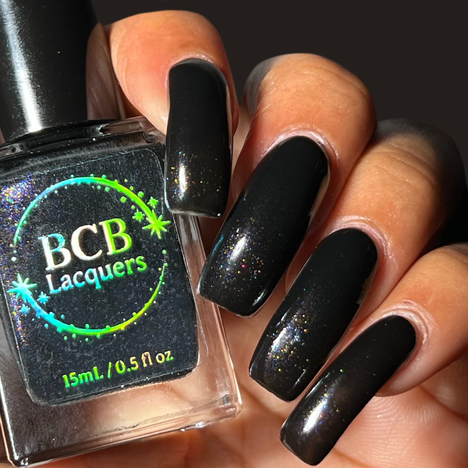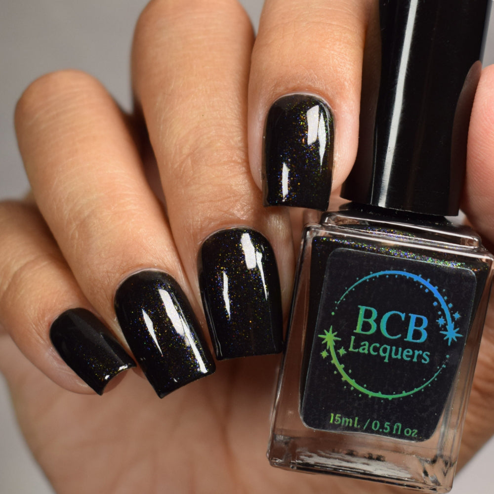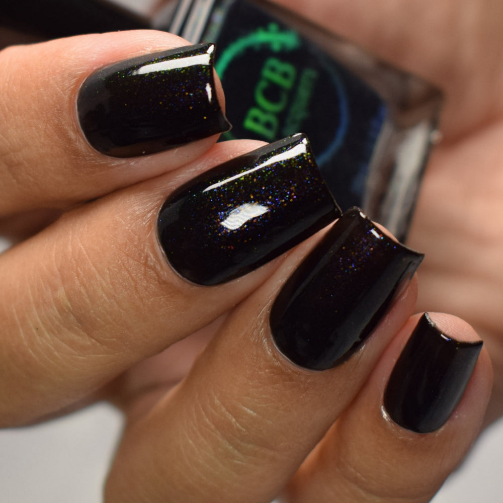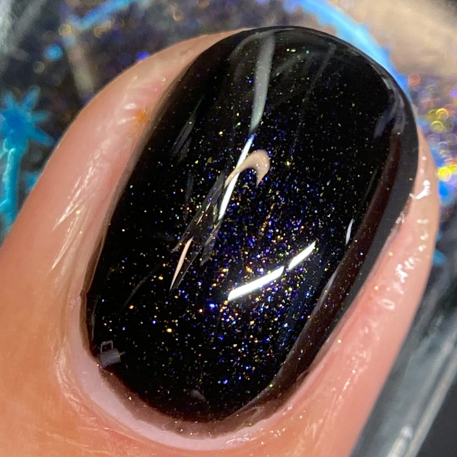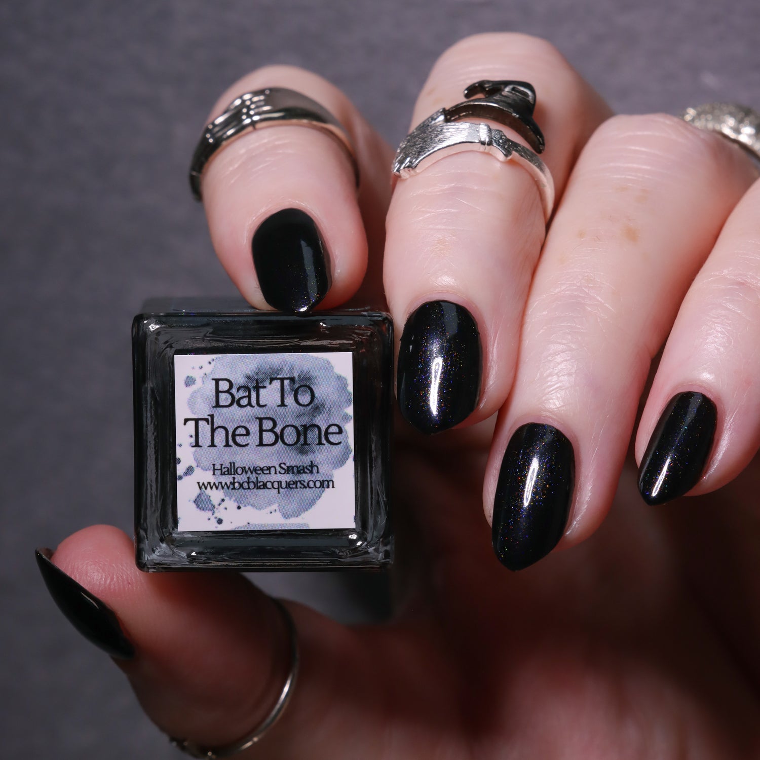 Bat To The Bone: A black jelly with a blue/purple shimmer and orange/gold/green shimmer.