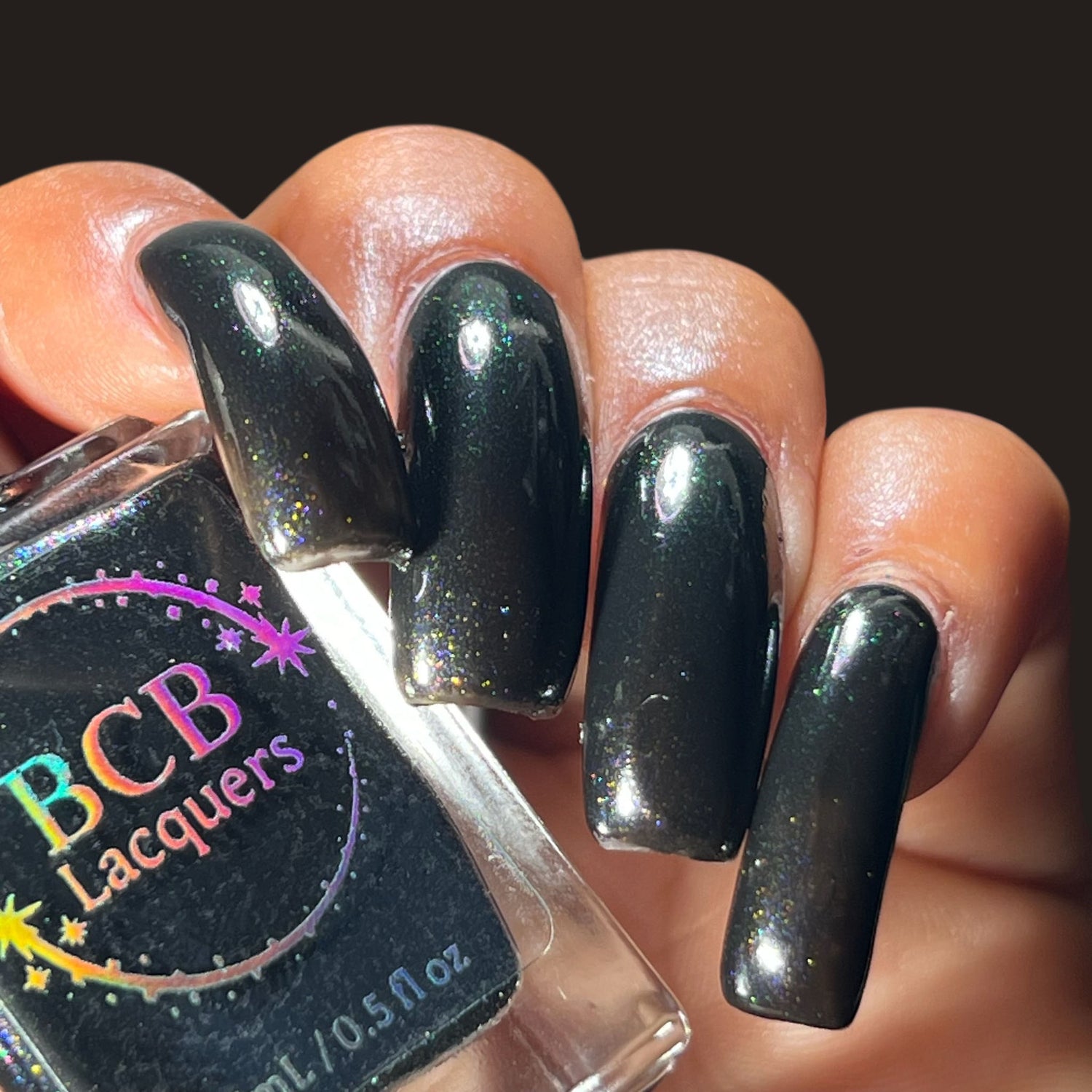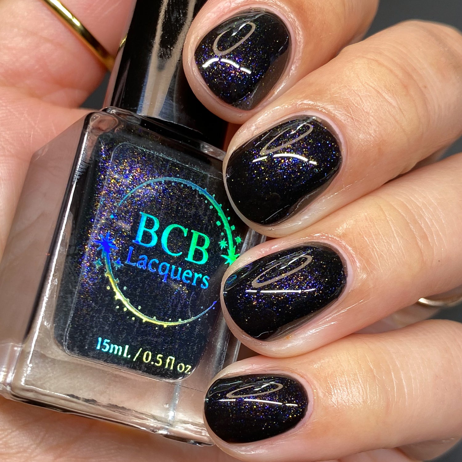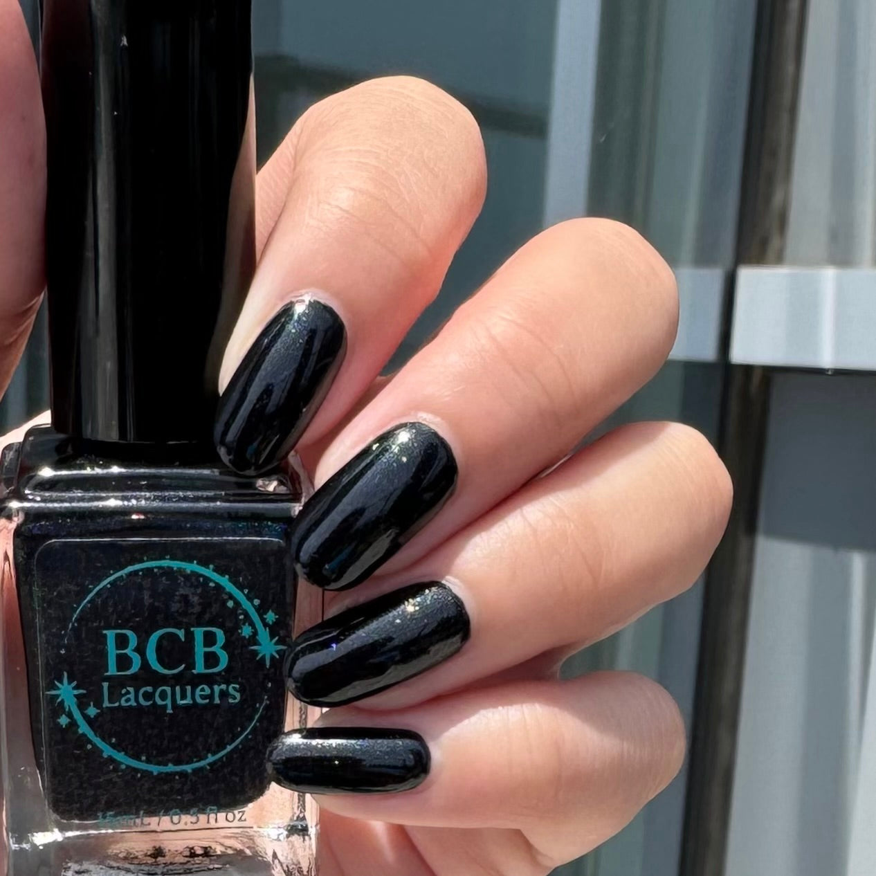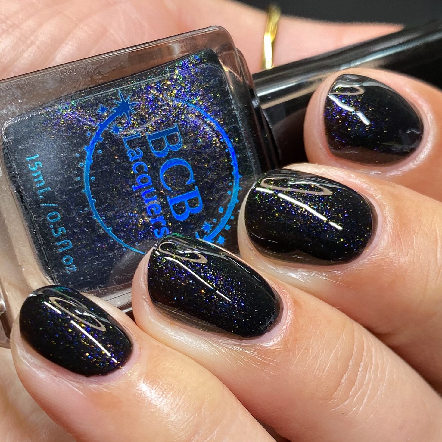 Bat To The Bone: A black jelly with a blue/purple shimmer and orange/gold/green shimmer.