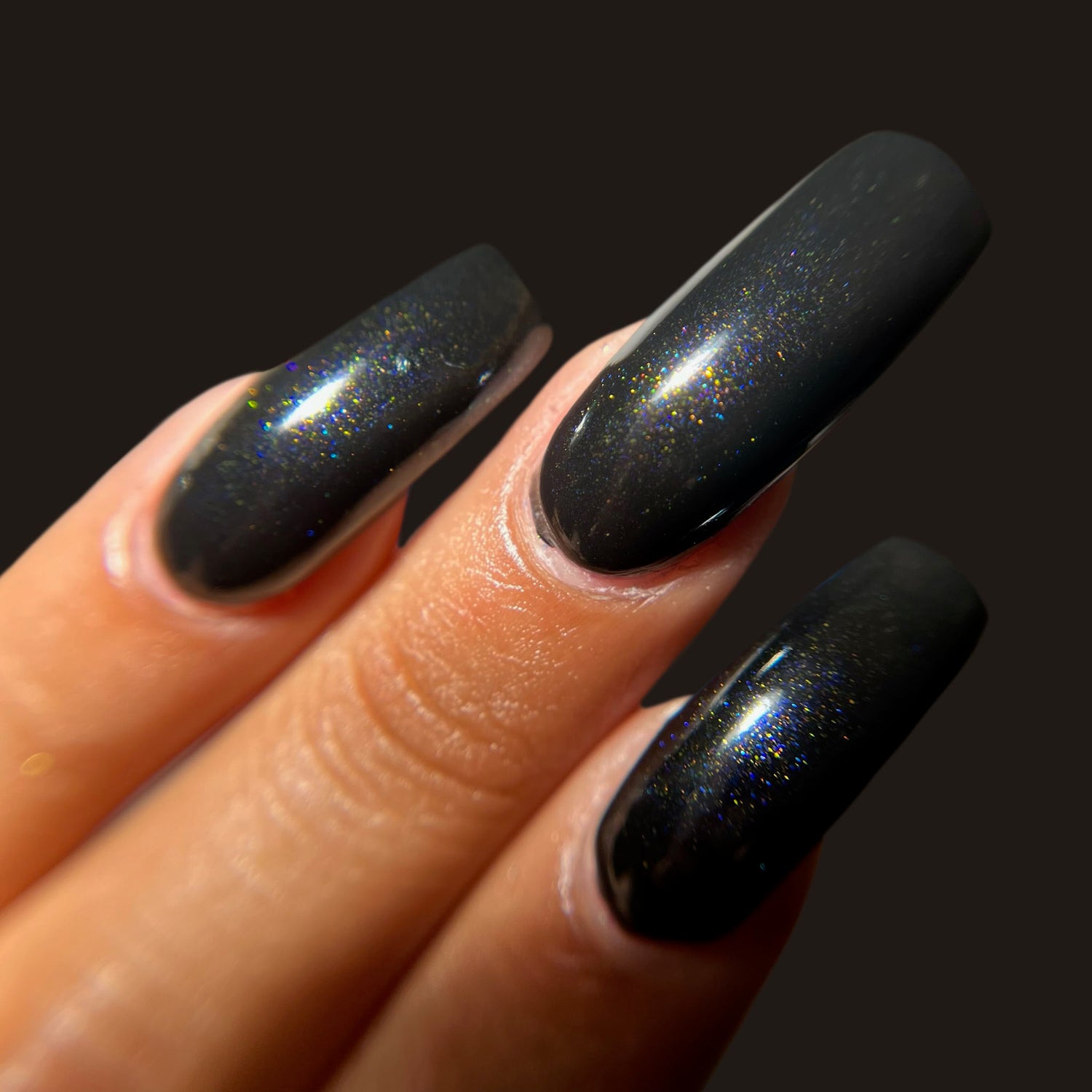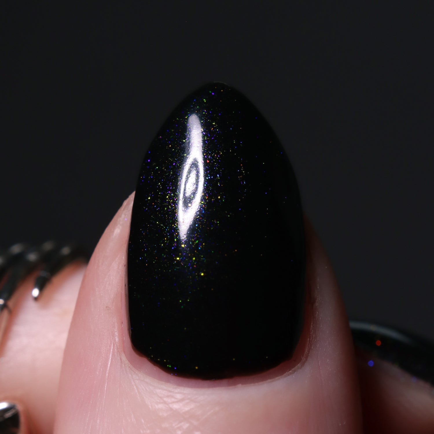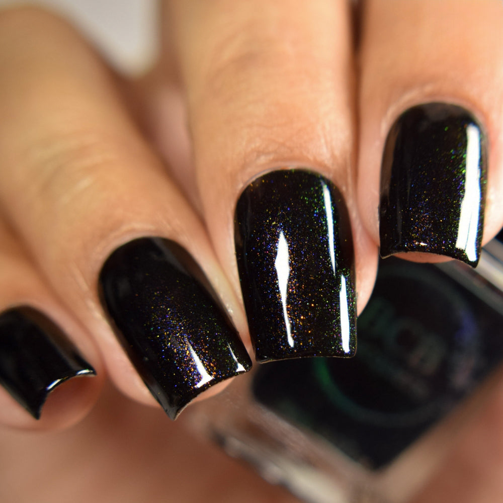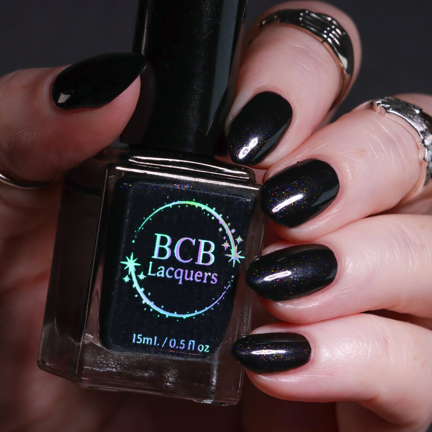 Bat To The Bone: A black jelly with a blue/purple shimmer and orange/gold/green shimmer.