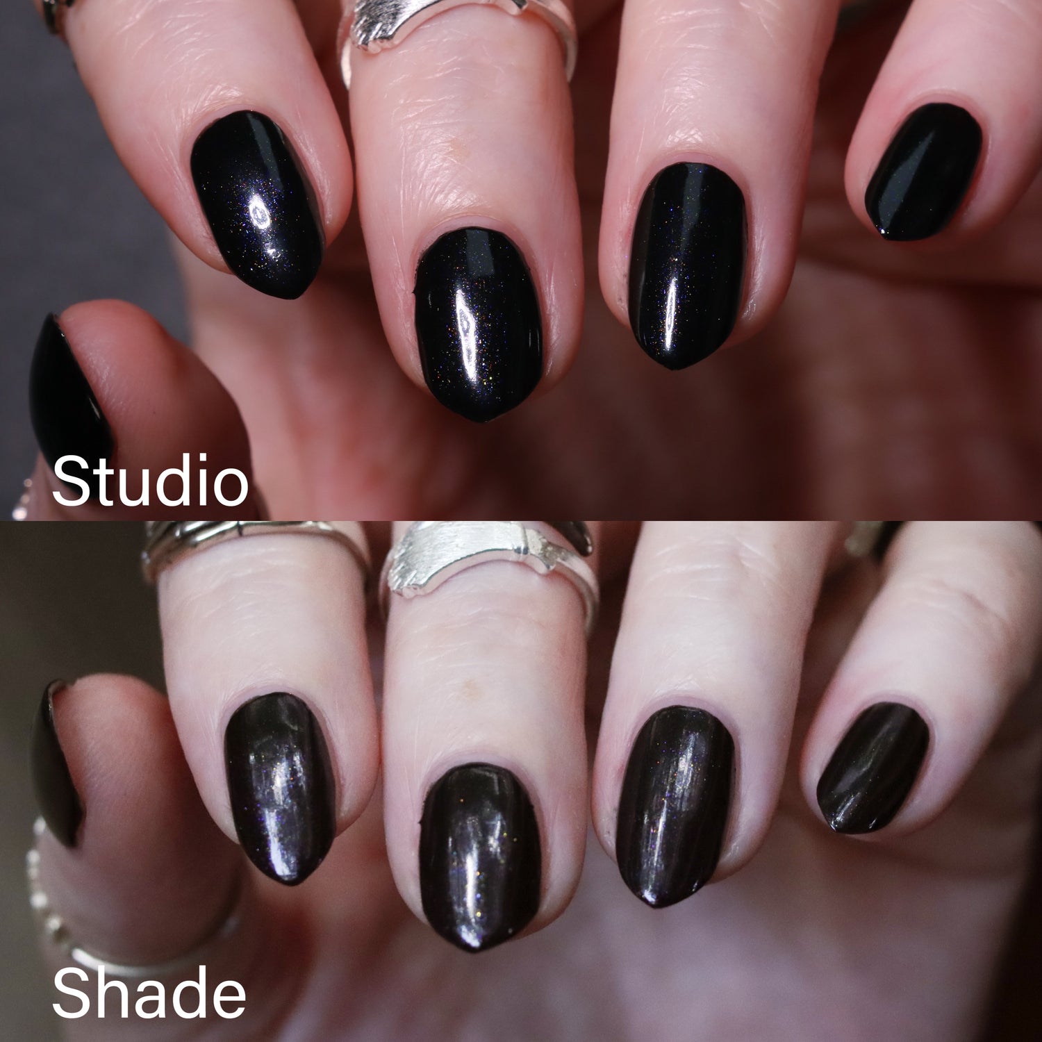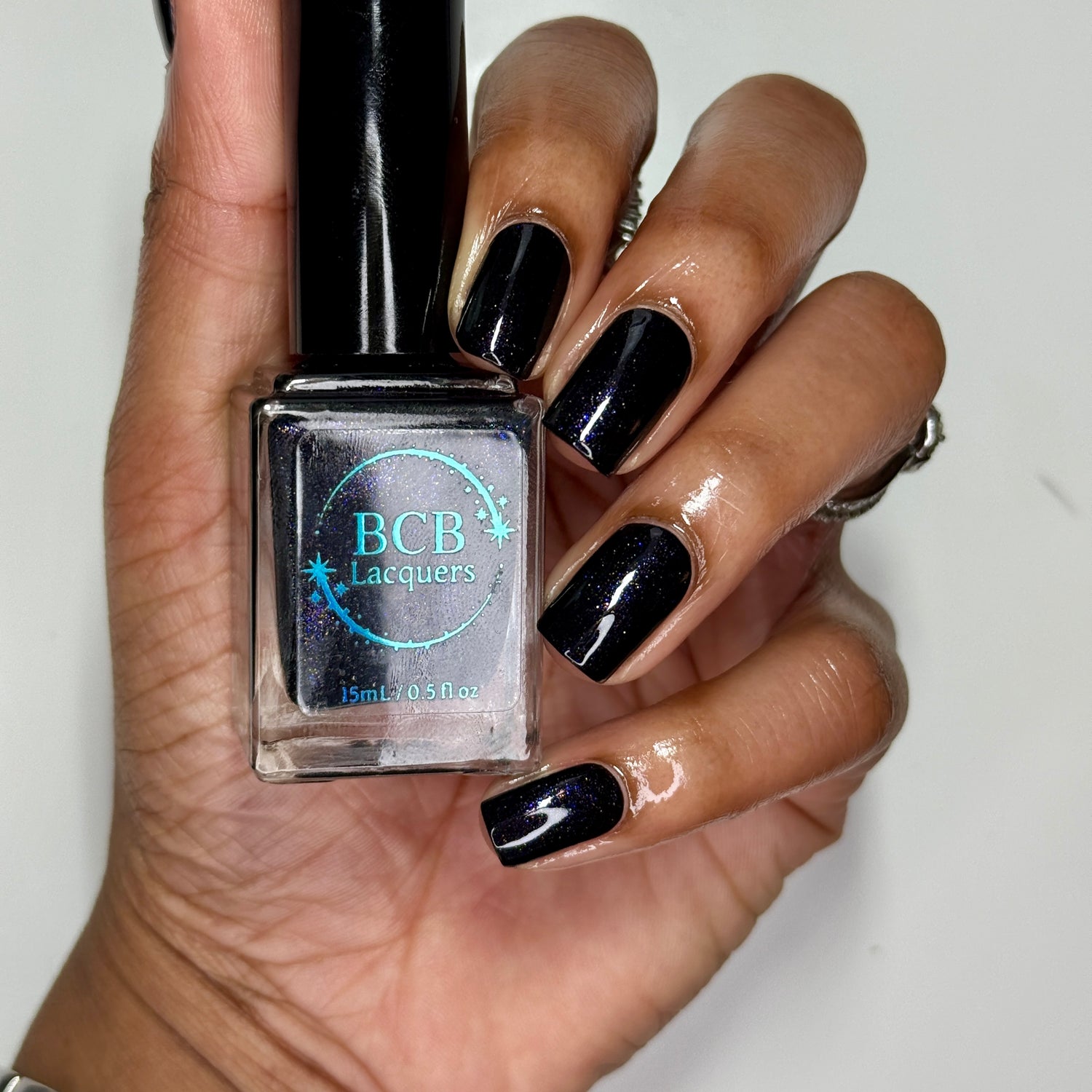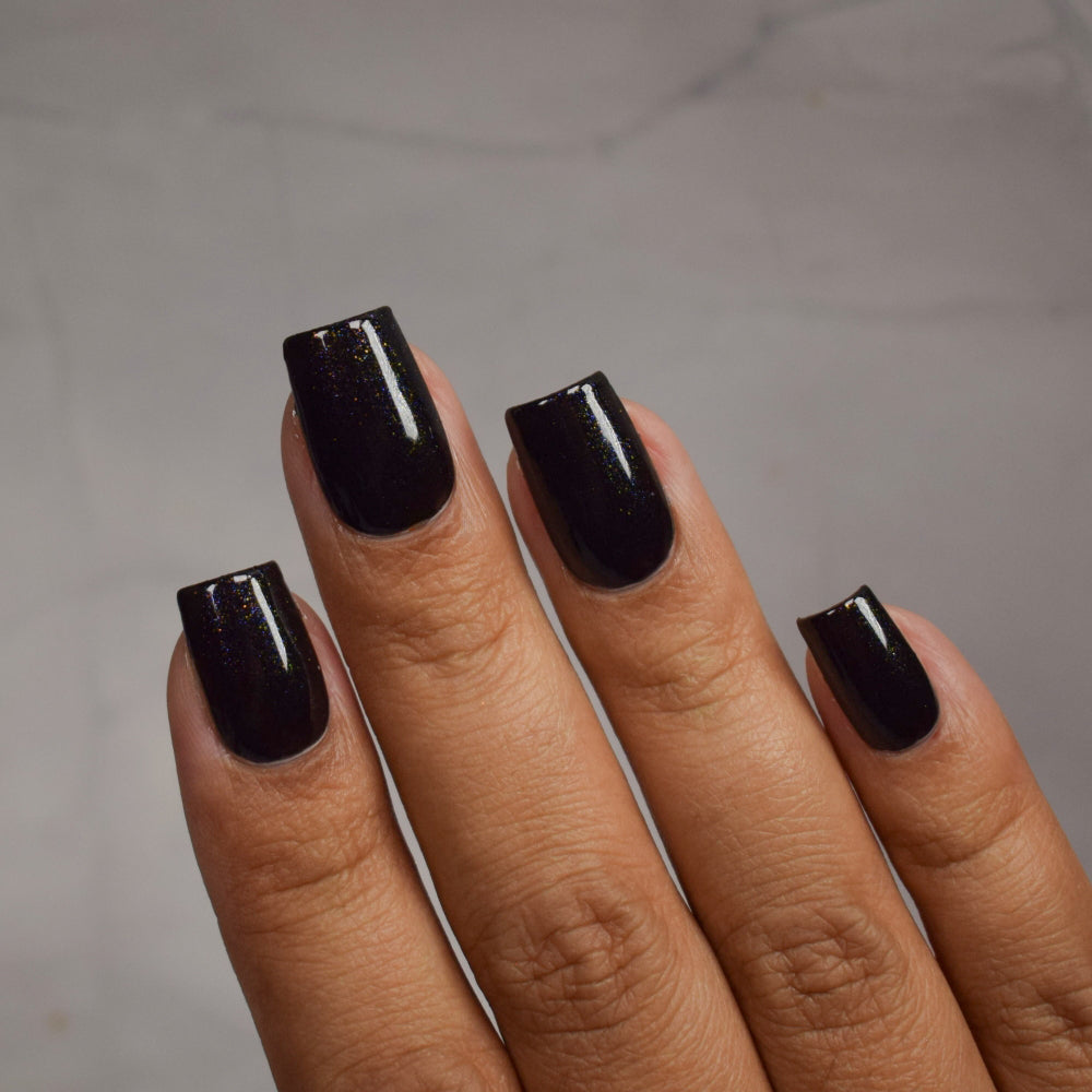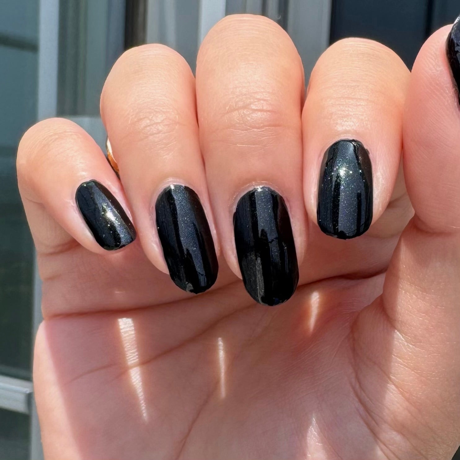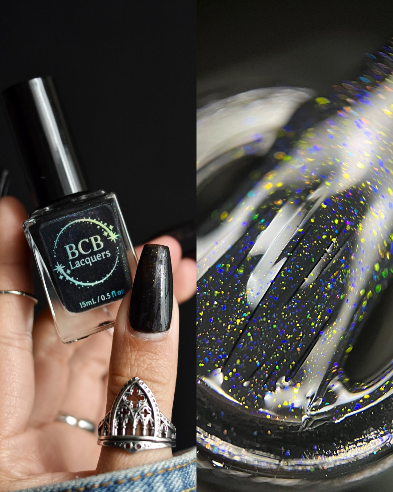 Bat To The Bone: A black jelly with a blue/purple shimmer and orange/gold/green shimmer.