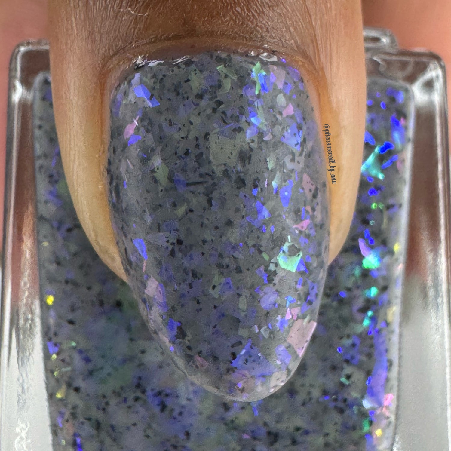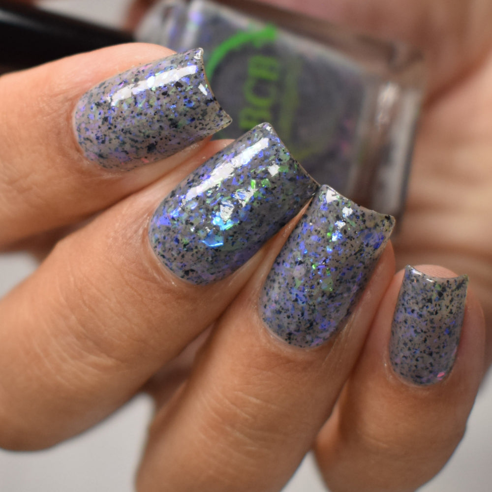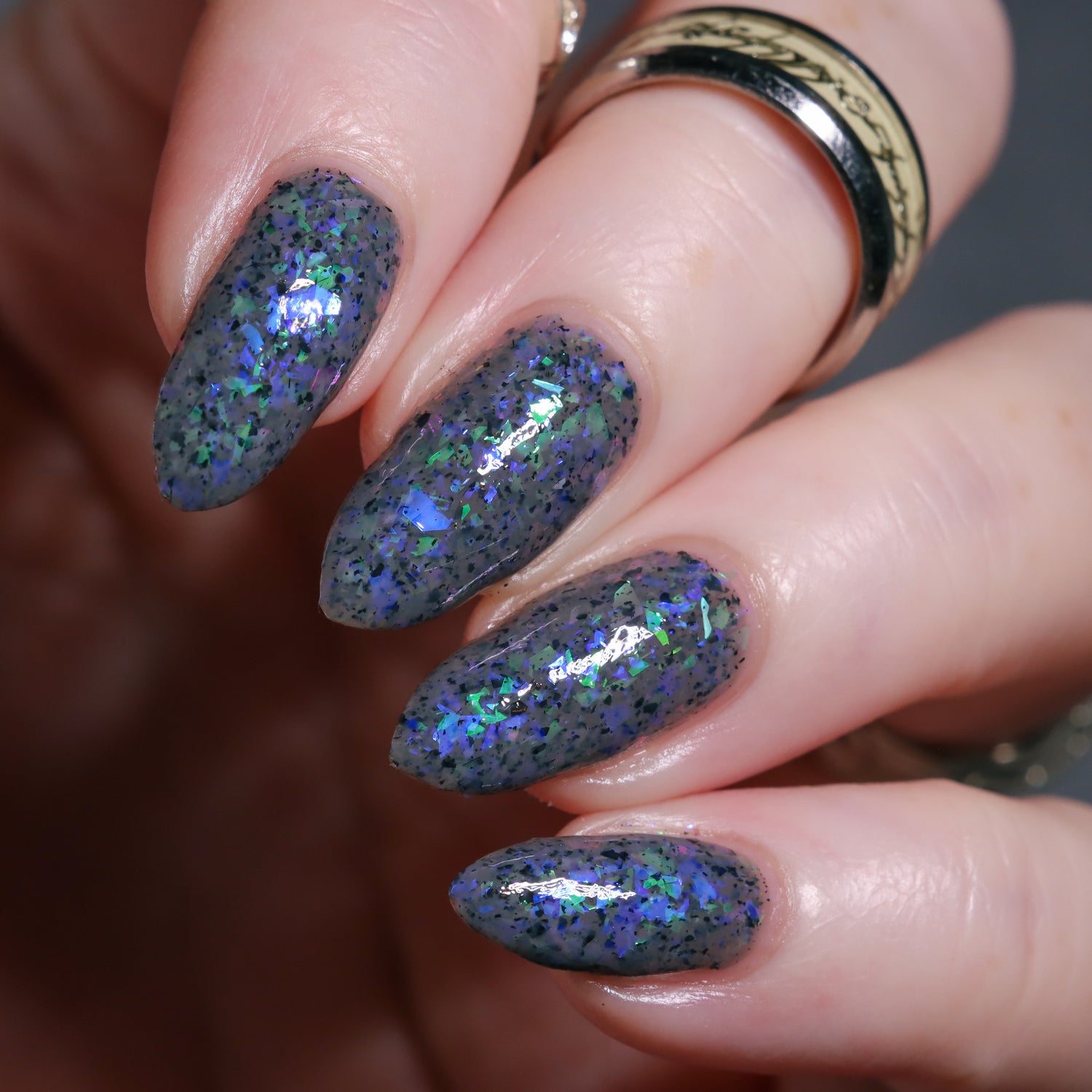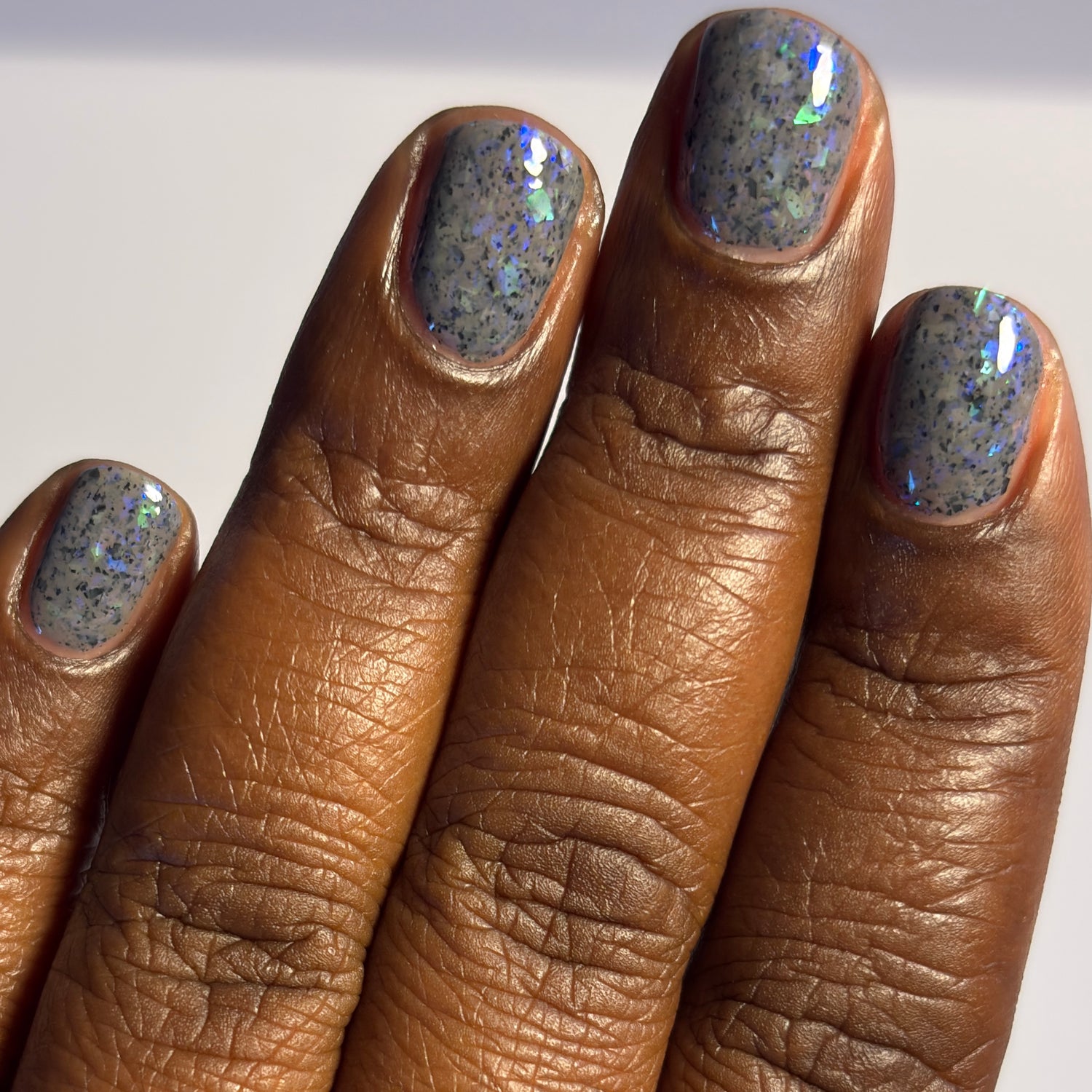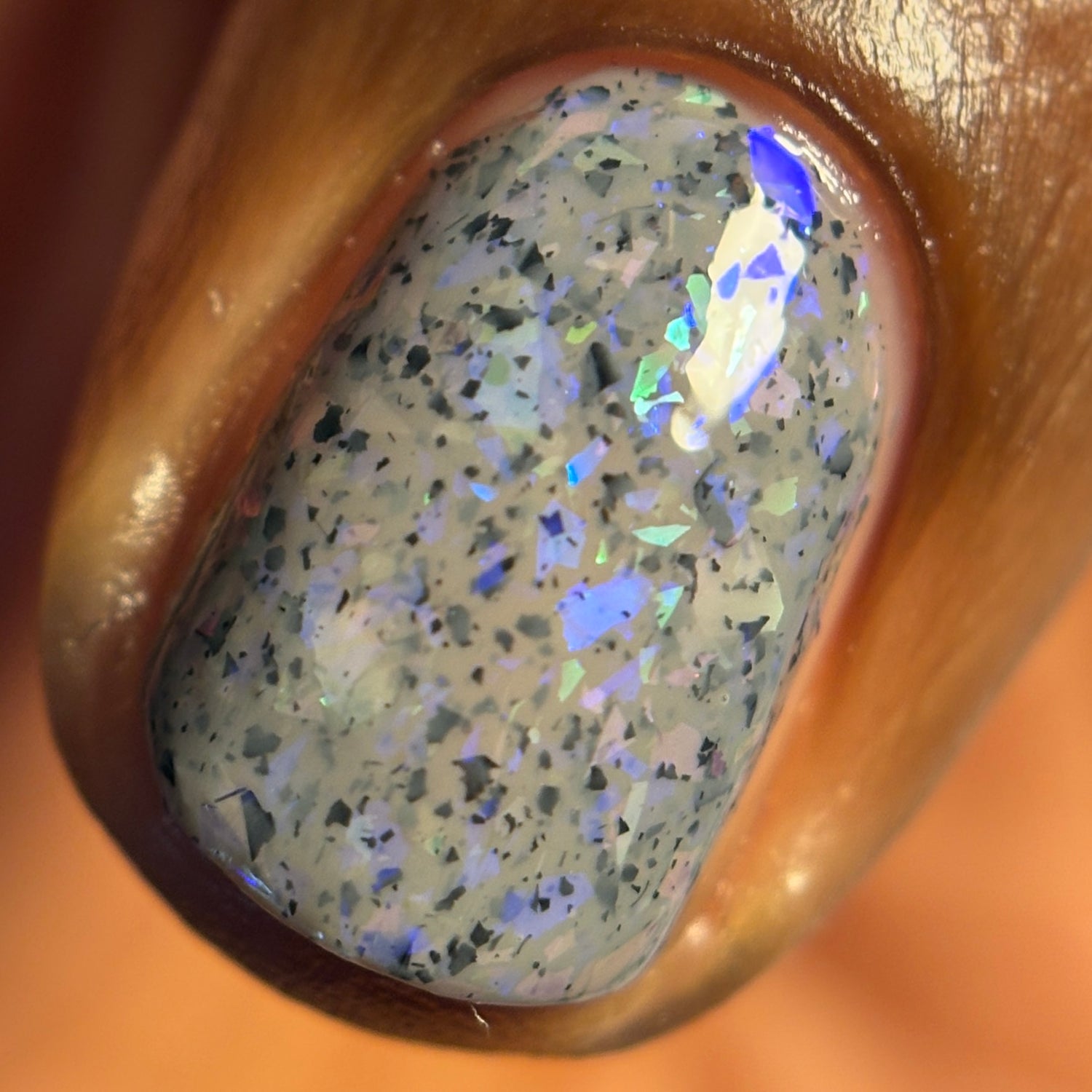 Even Darkness Must Pass: A gray crelly with green/blue/purple glass flakes, blue/purple glass flakes and black flakes.