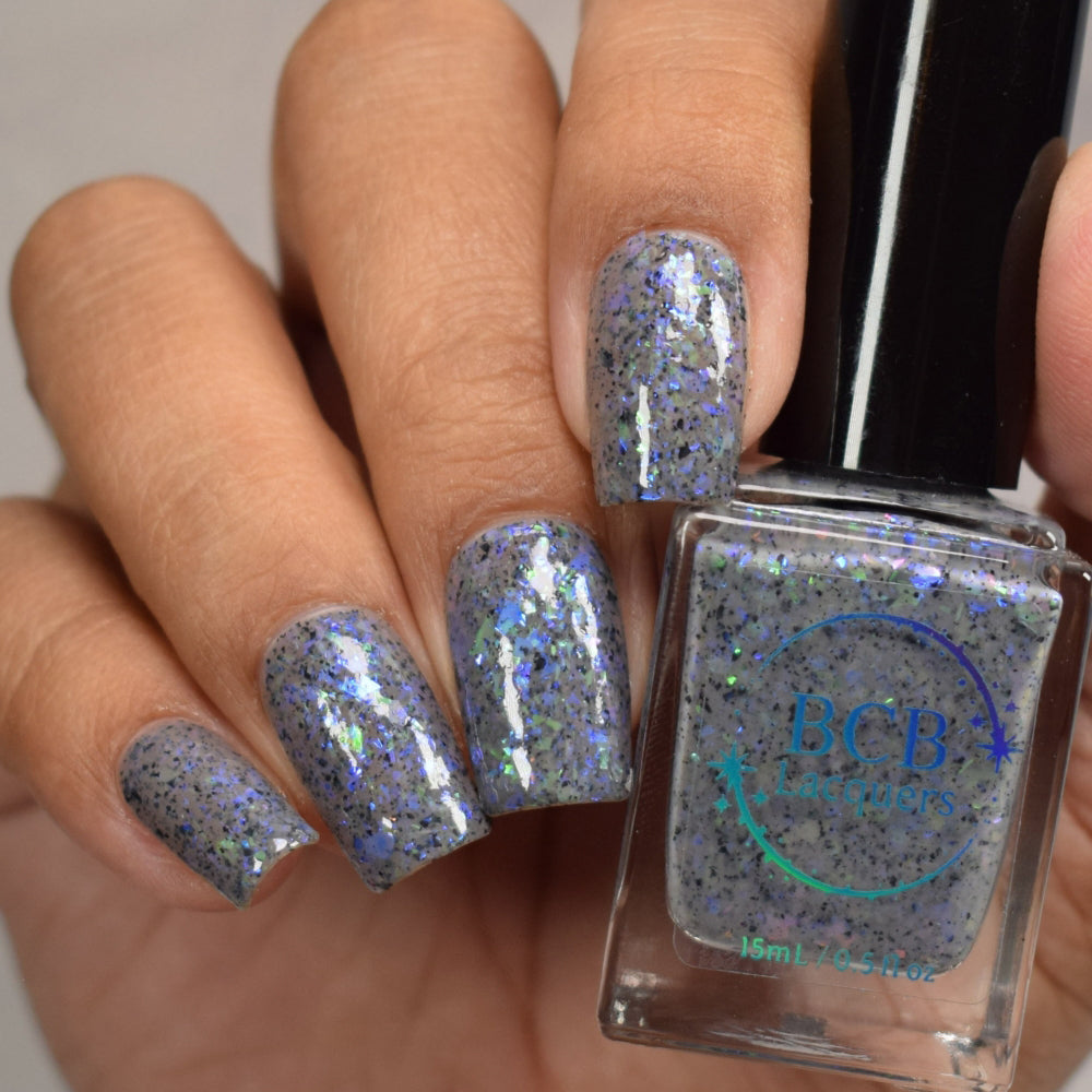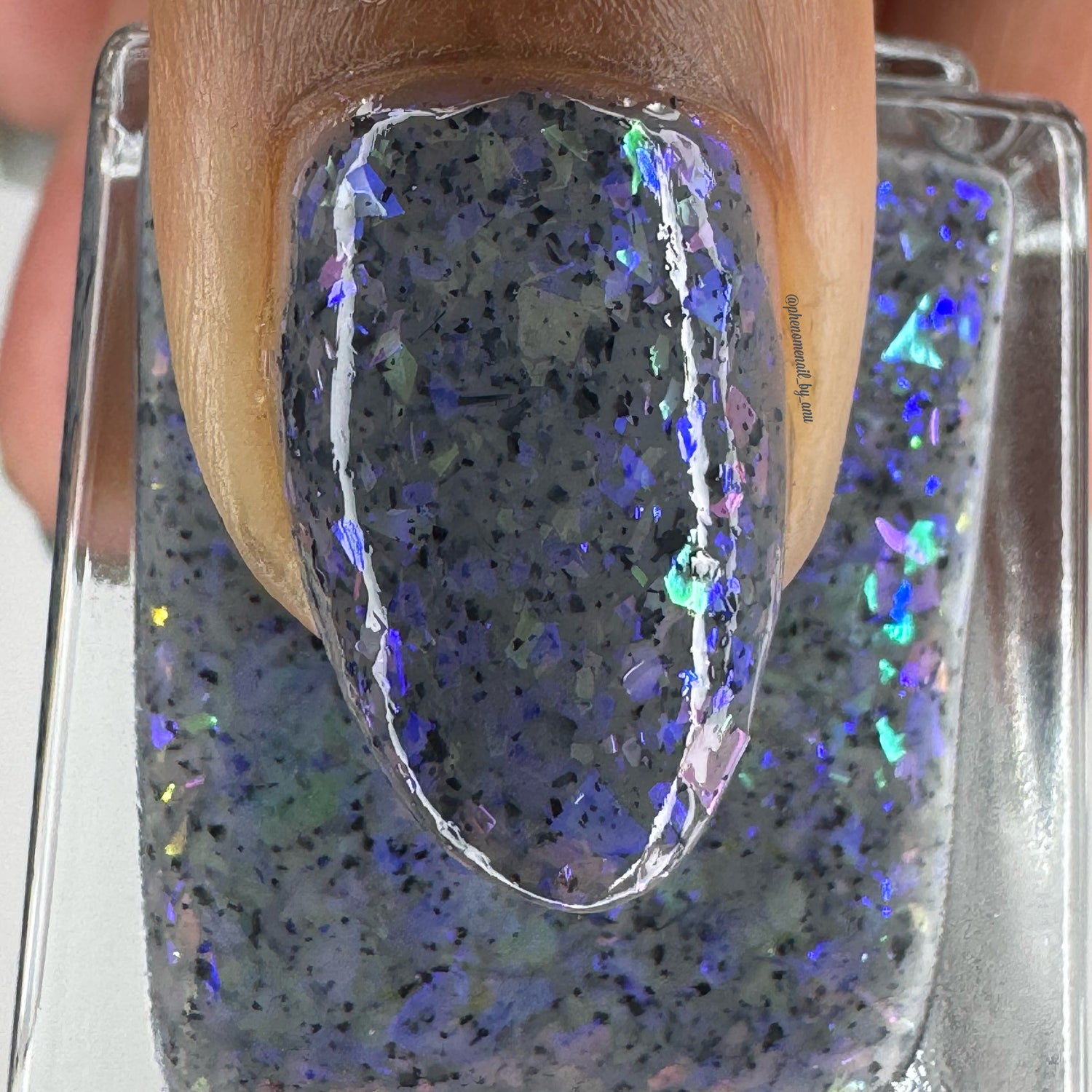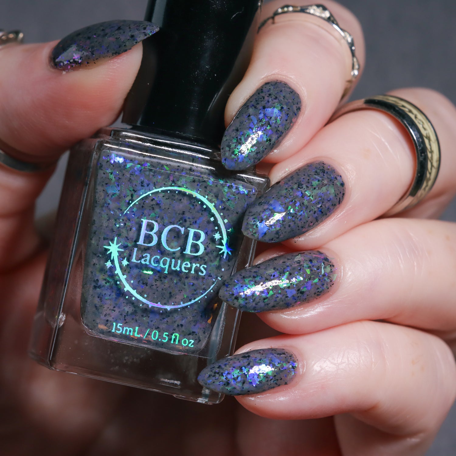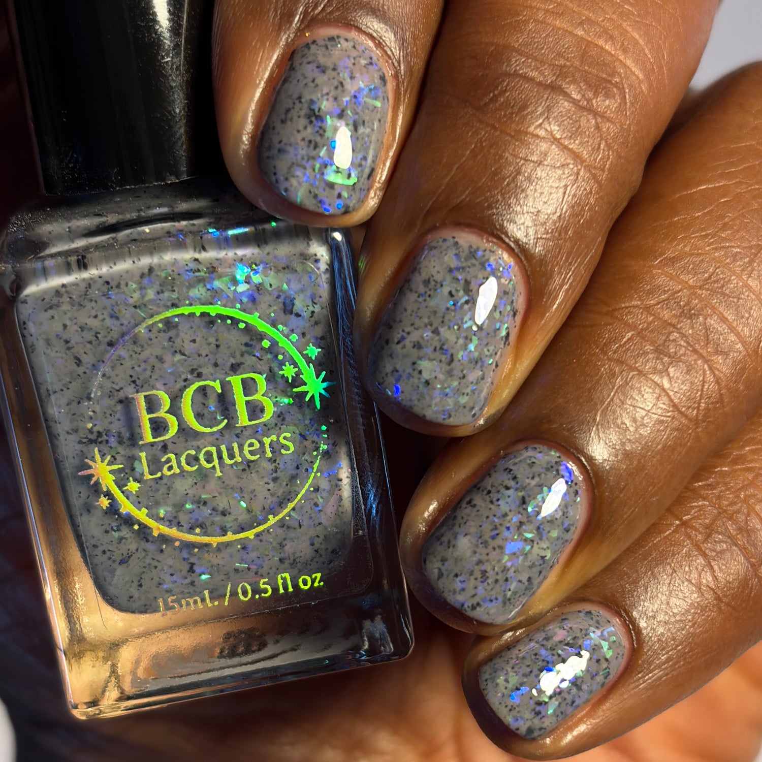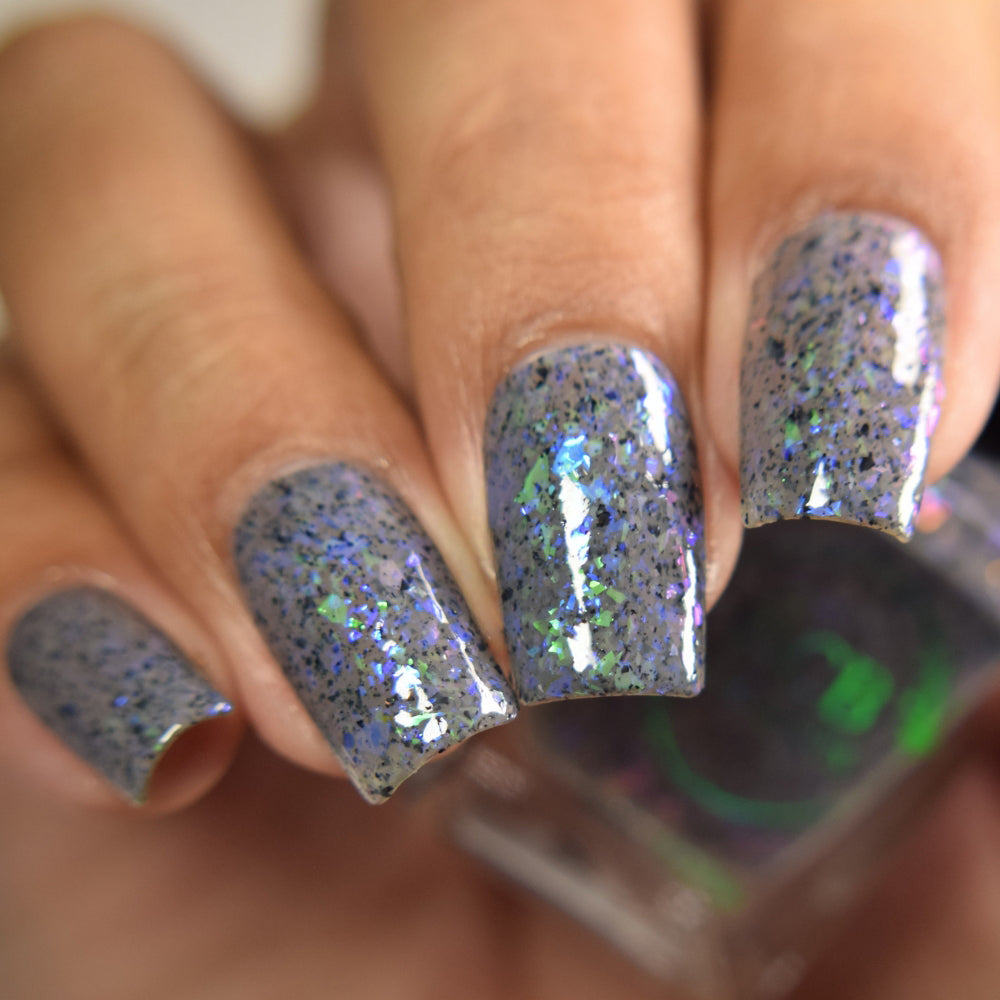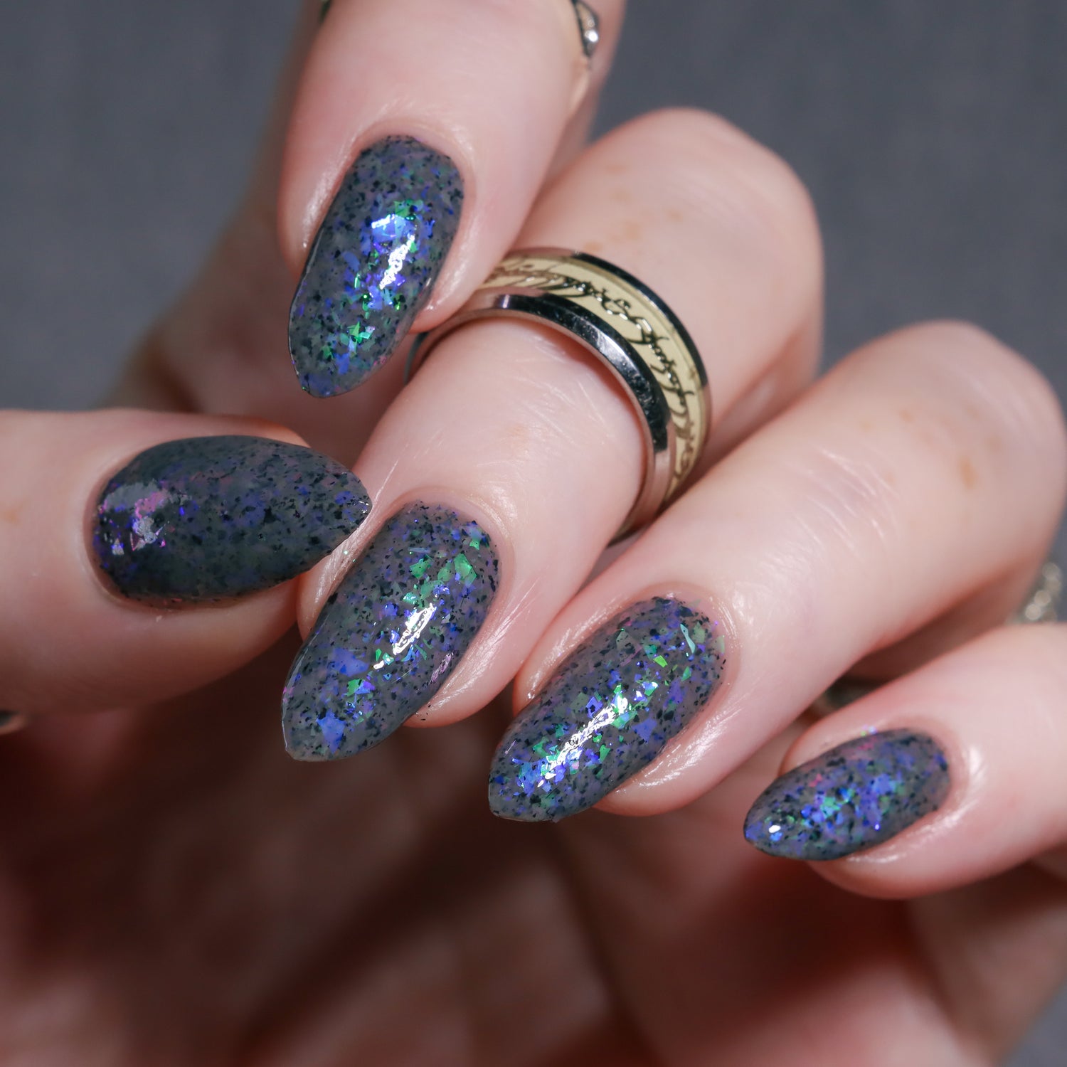 Even Darkness Must Pass: A gray crelly with green/blue/purple glass flakes, blue/purple glass flakes and black flakes.