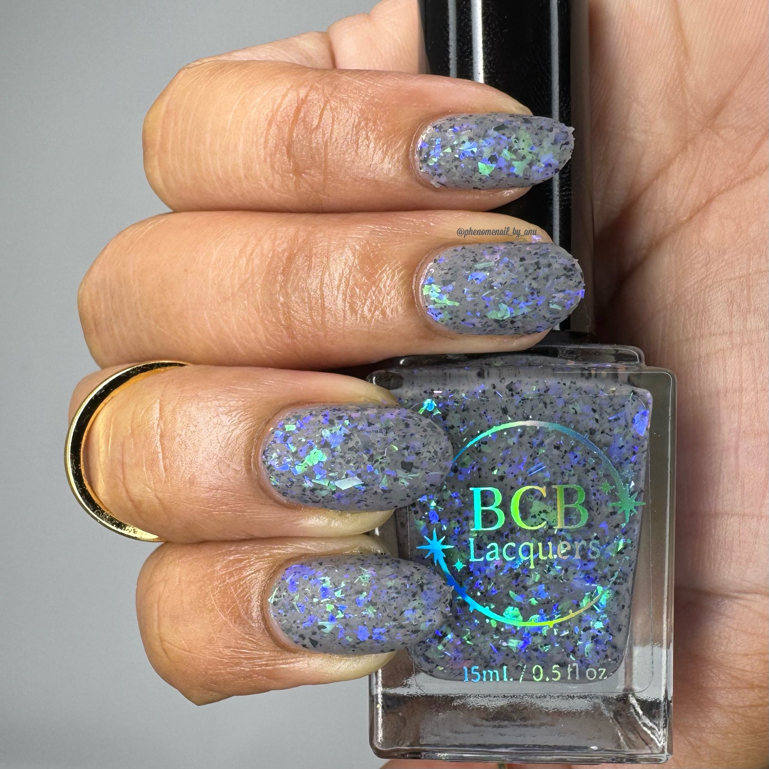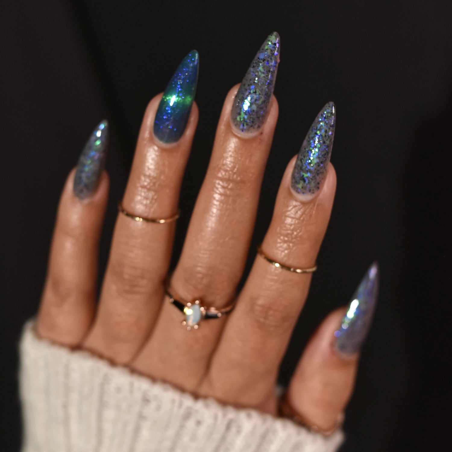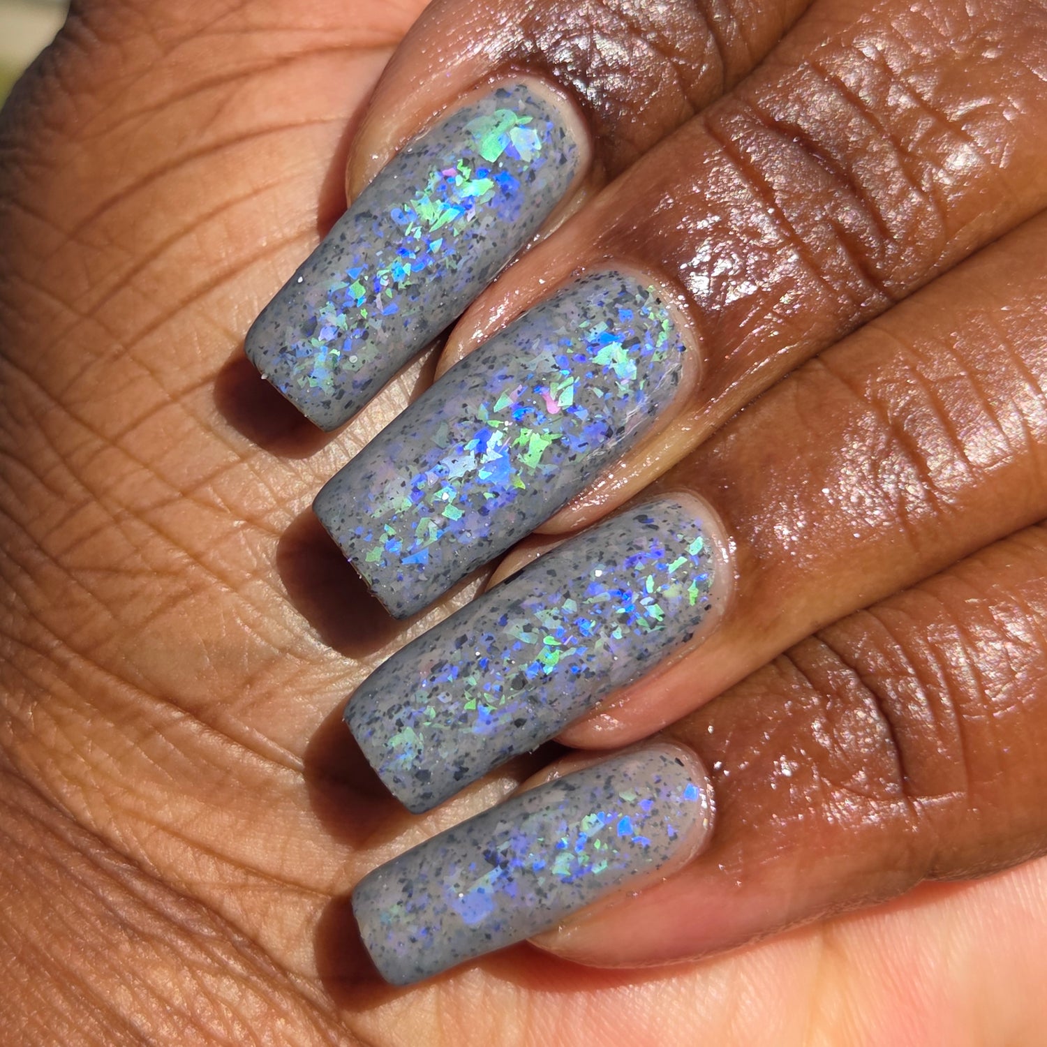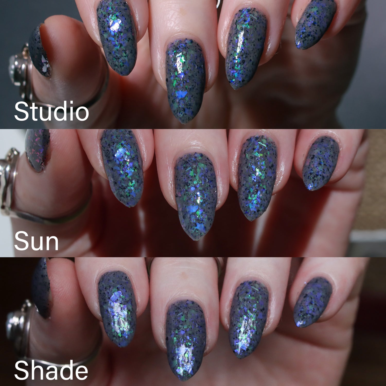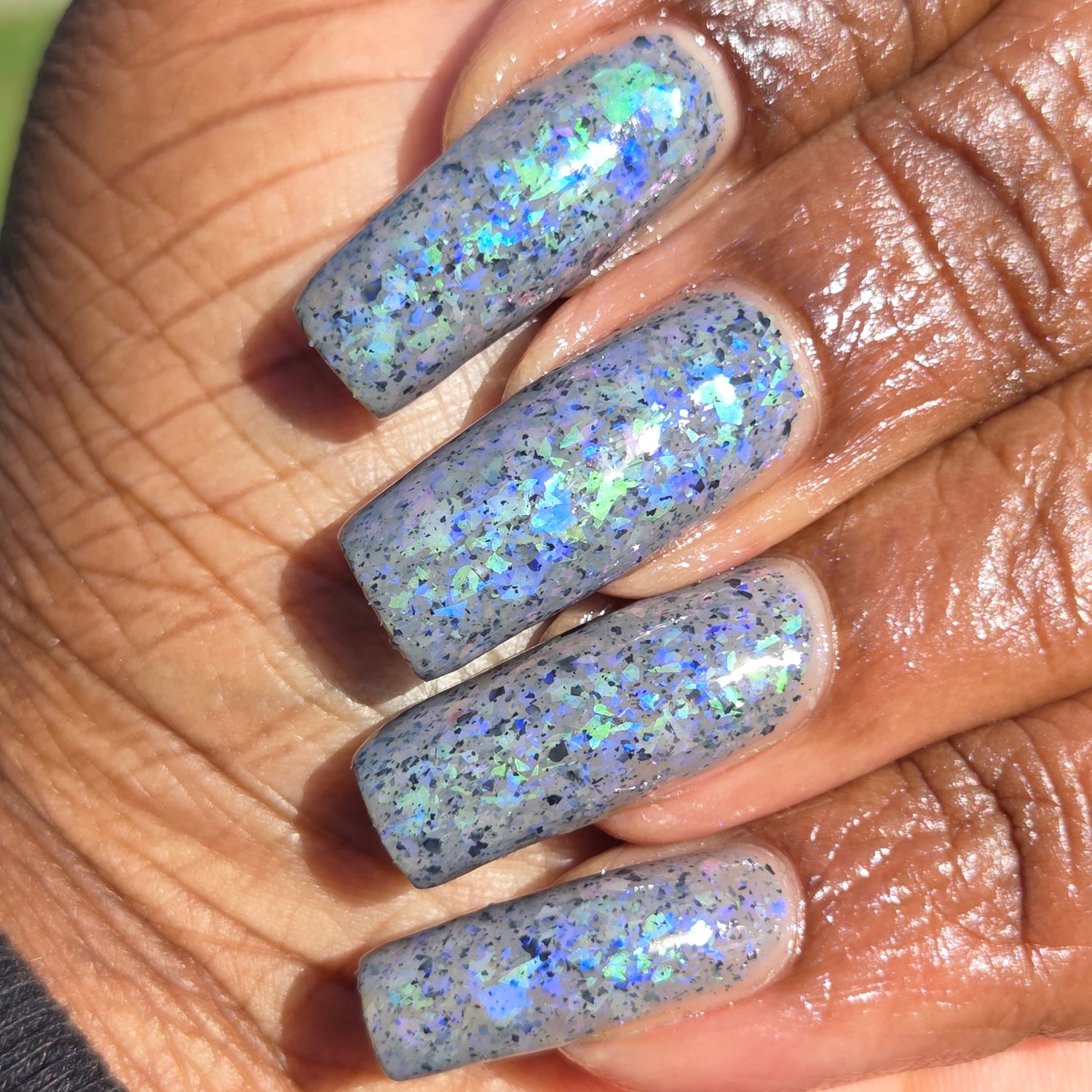 Even Darkness Must Pass: A gray crelly with green/blue/purple glass flakes, blue/purple glass flakes and black flakes.
