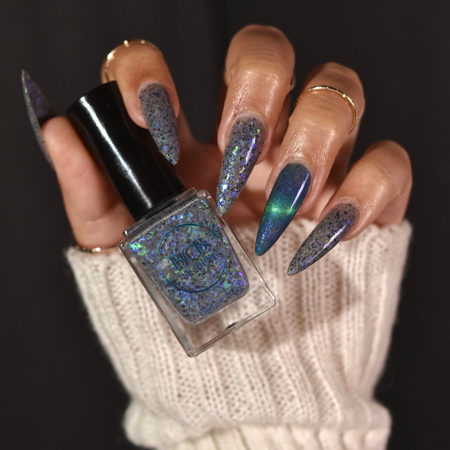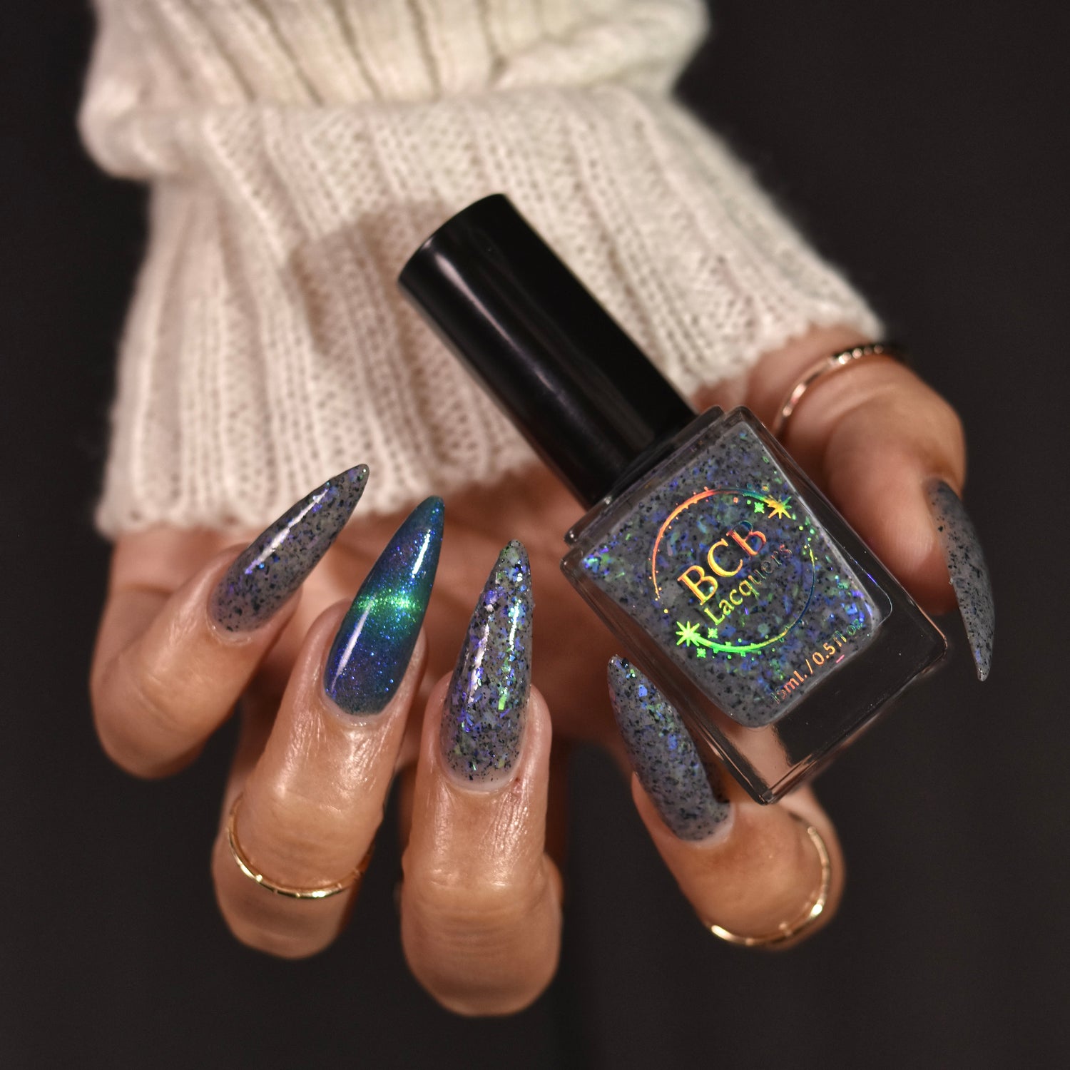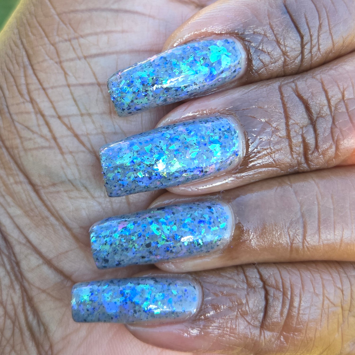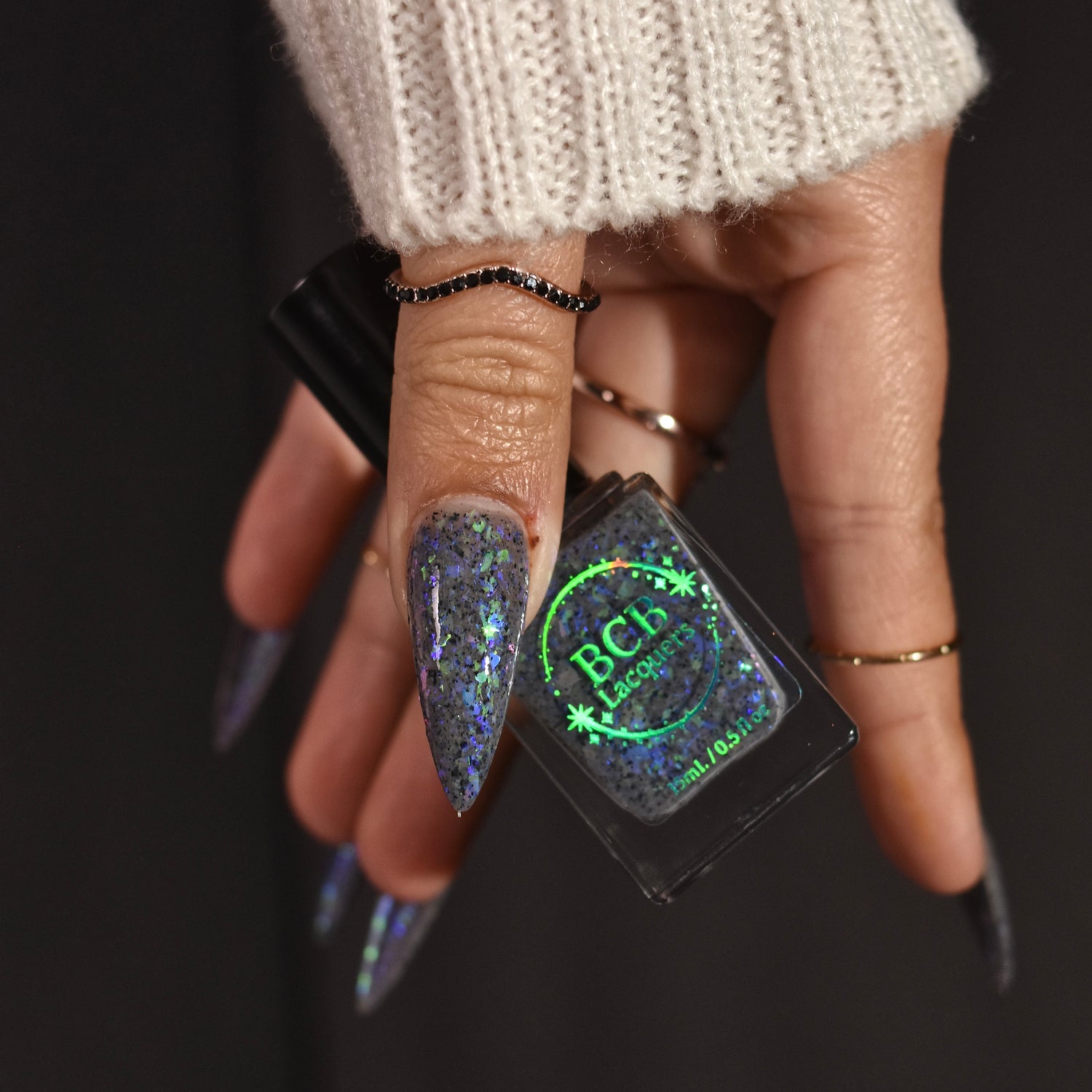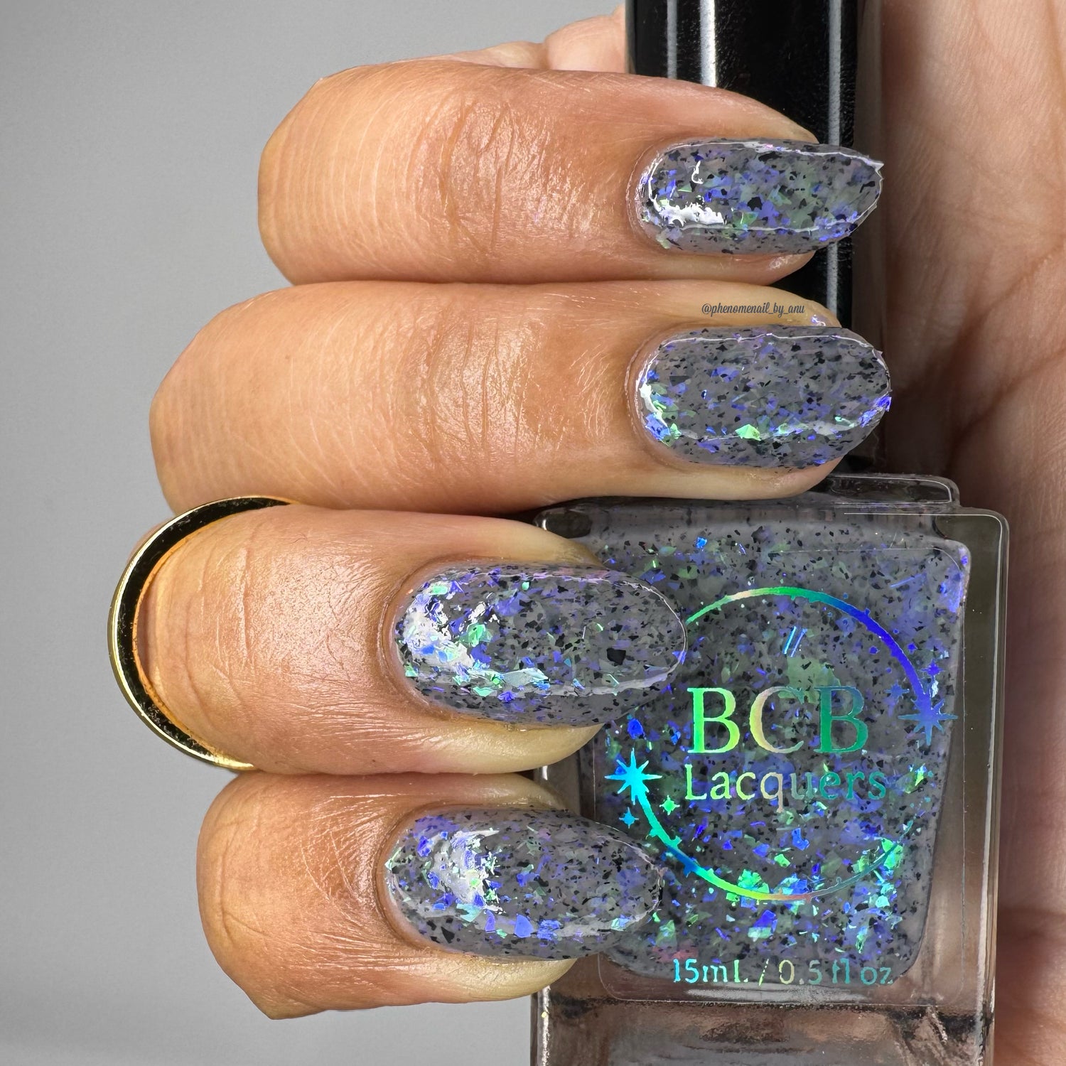 Even Darkness Must Pass: A gray crelly with green/blue/purple glass flakes, blue/purple glass flakes and black flakes.