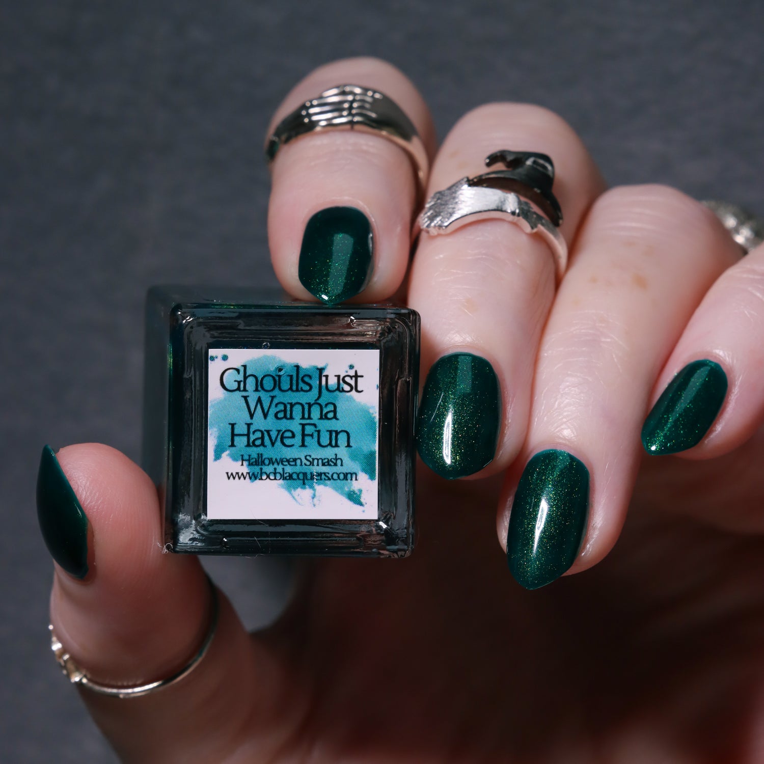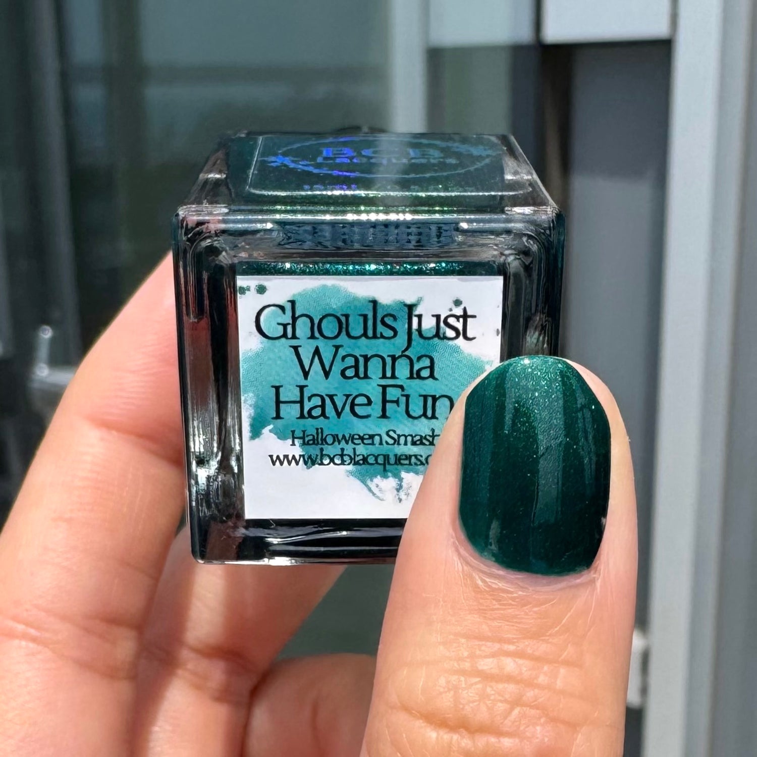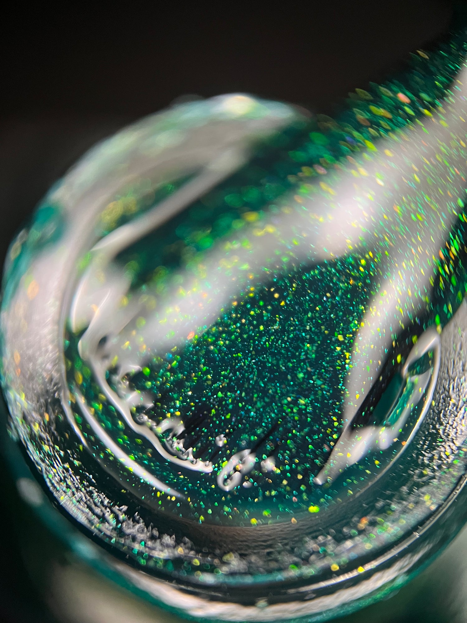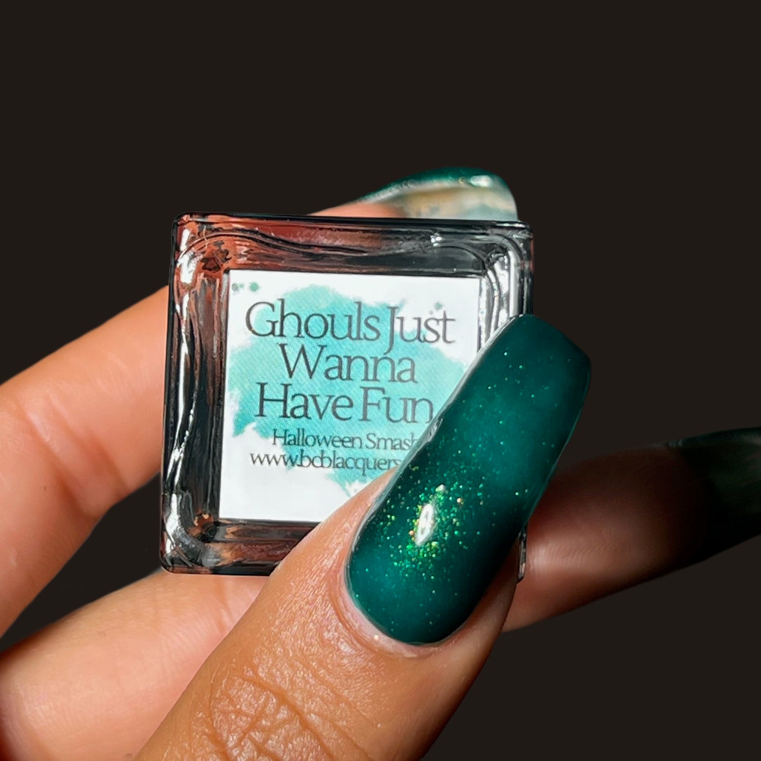 Ghouls Just Want To Have Fun: A teal jelly with green/blue shimmer and red/orange/gold shimmer.