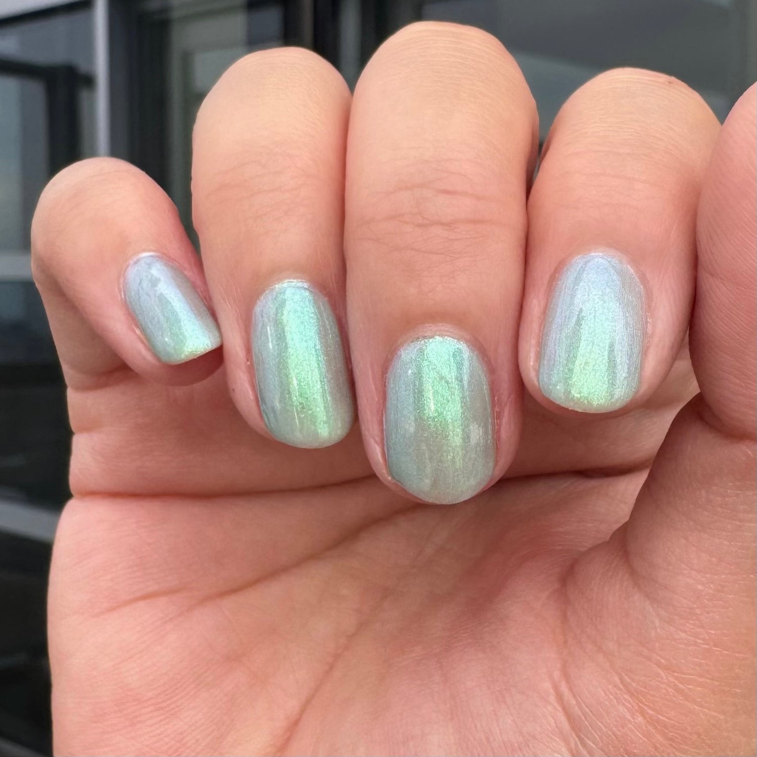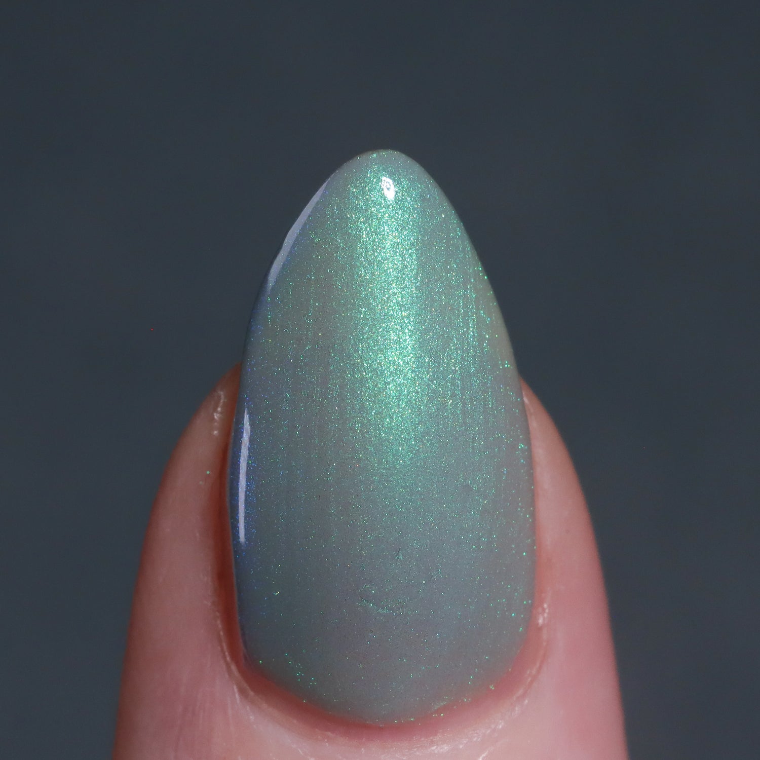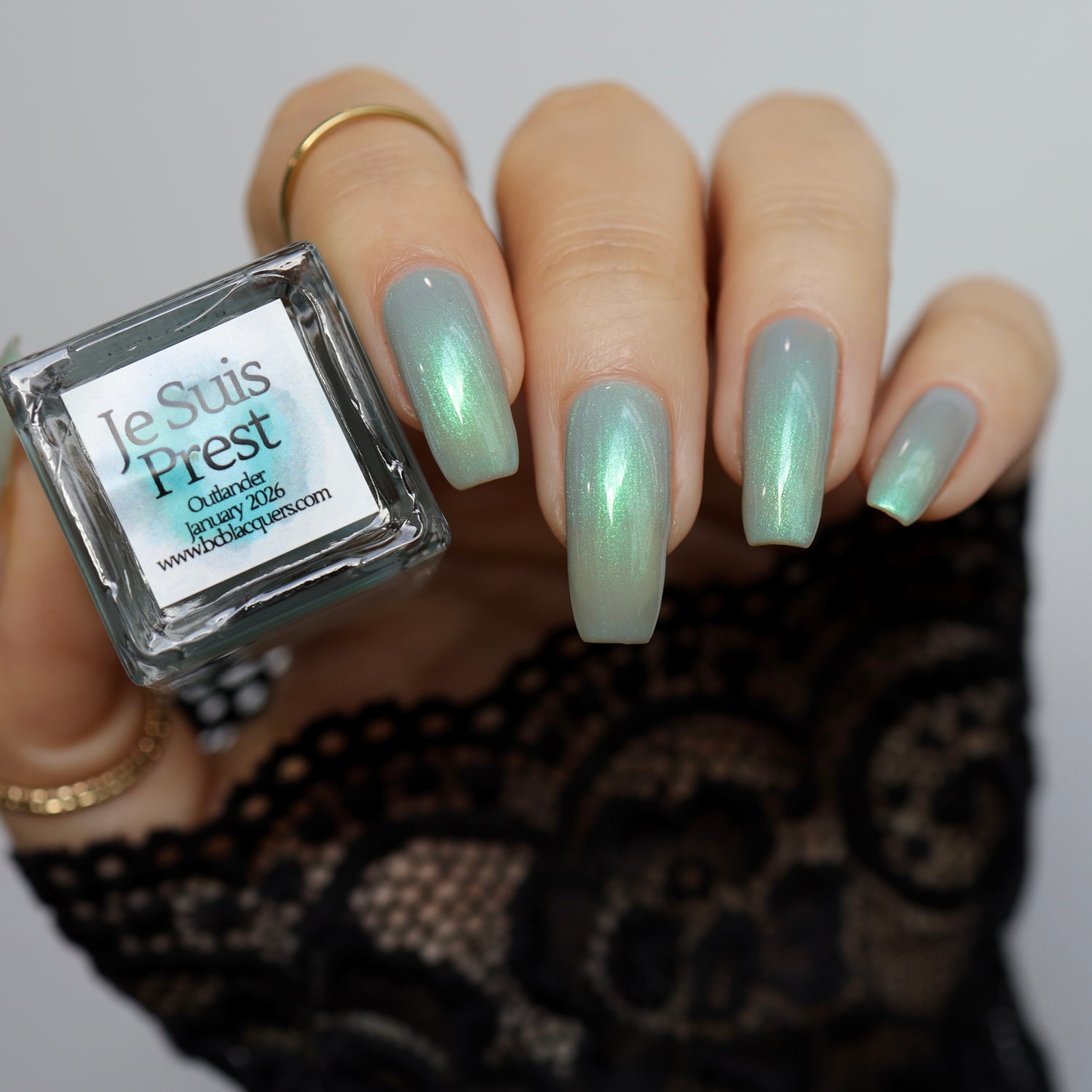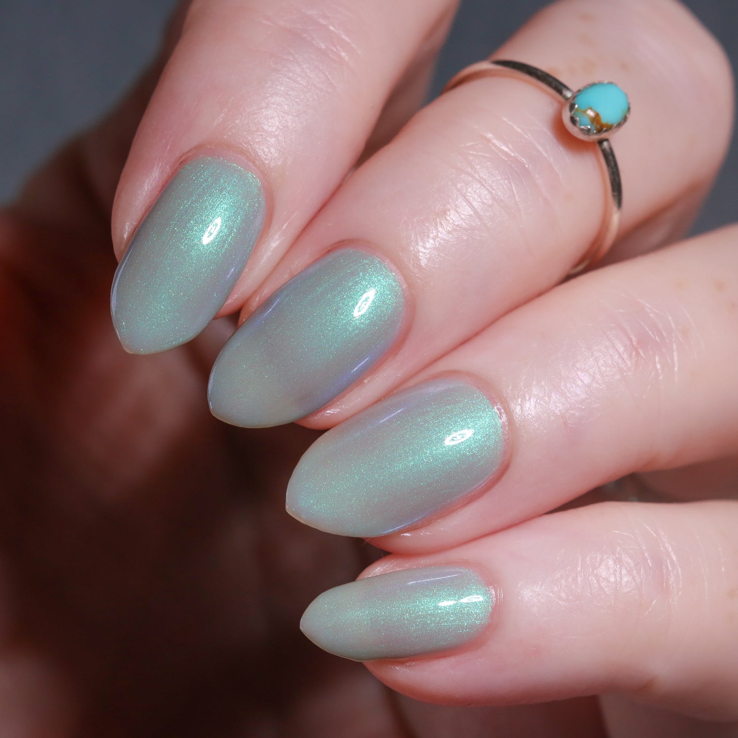 Je Suis Prest: A light grayed sage crelly with a strong green/blue shifting shimmer.