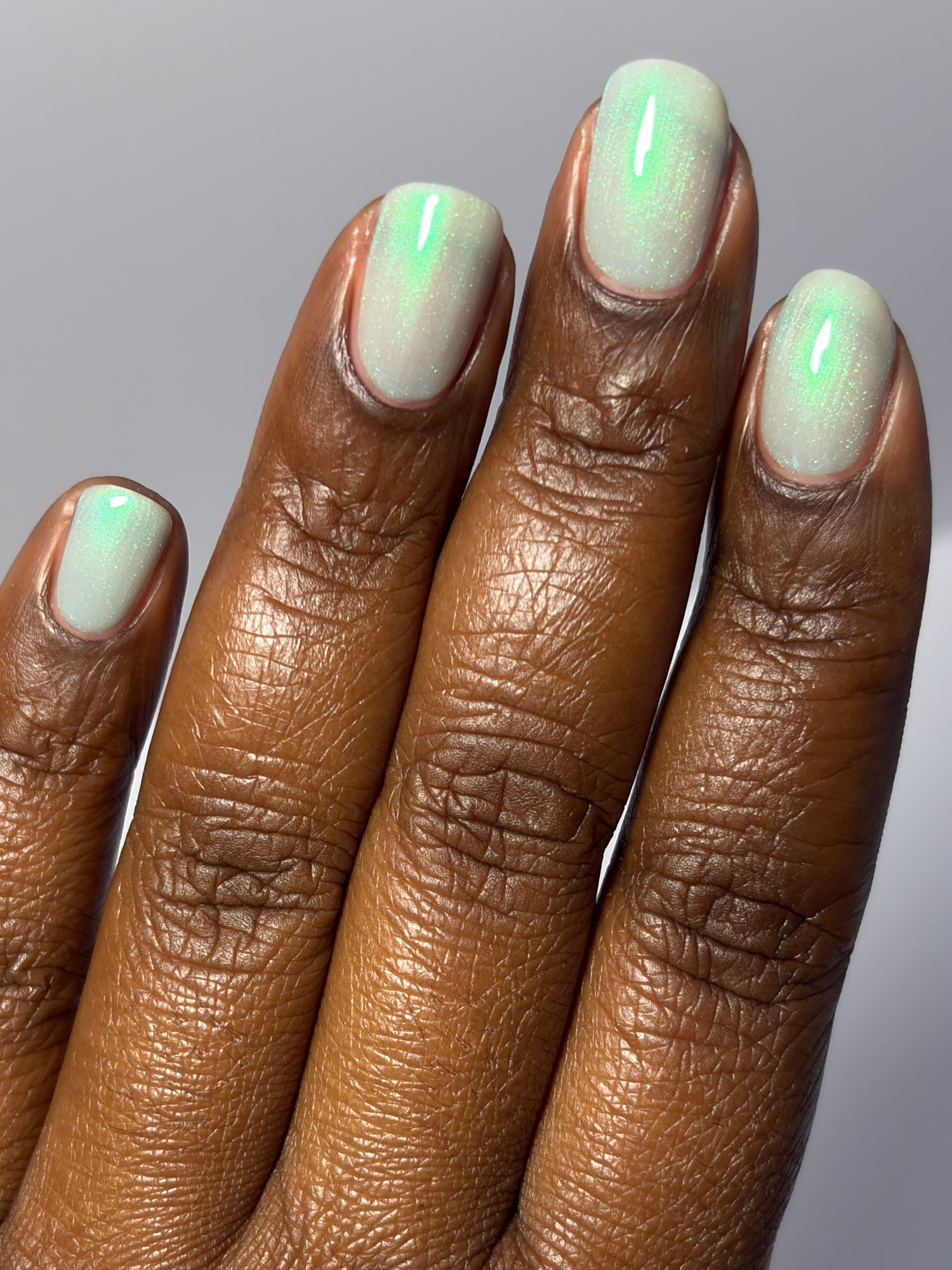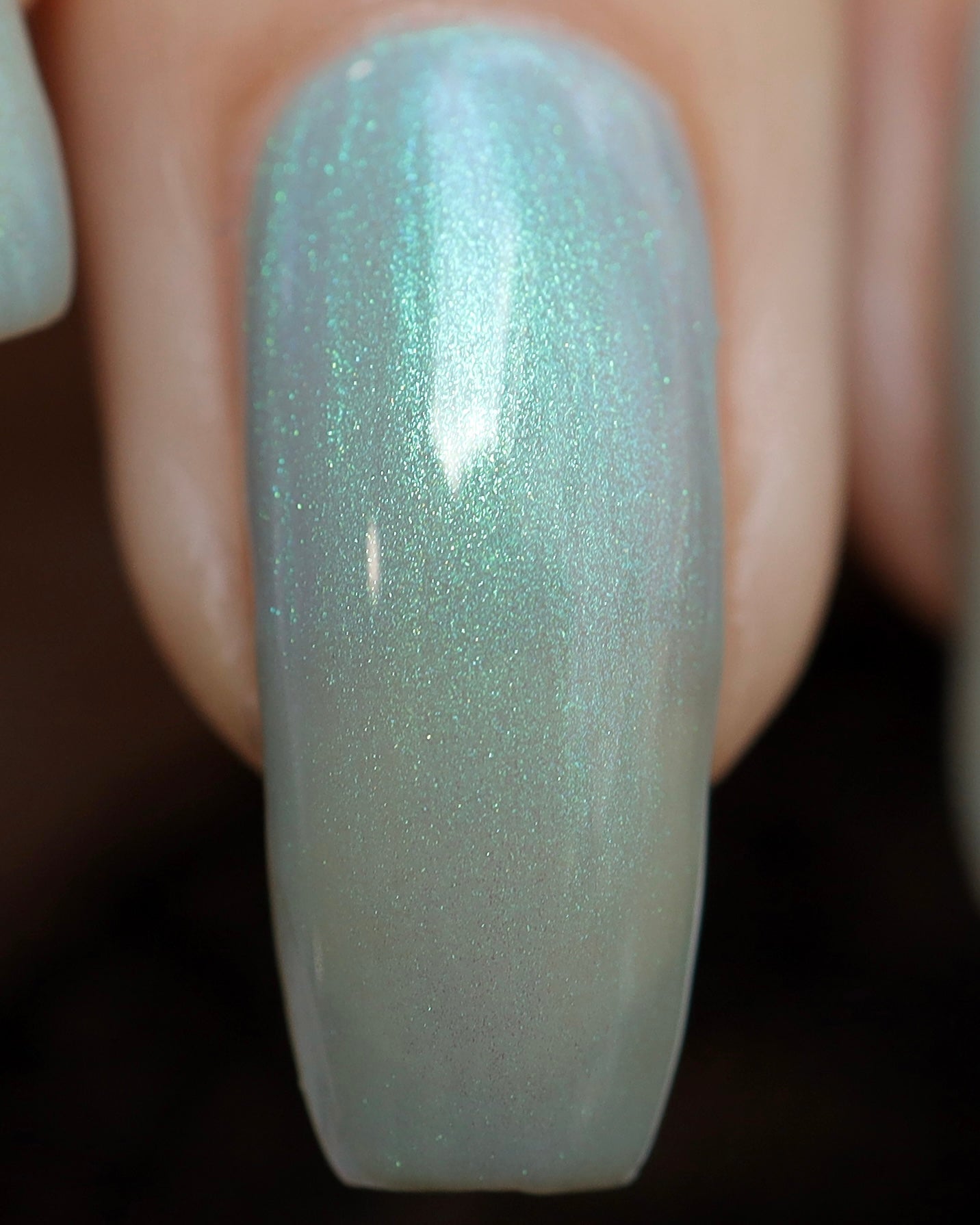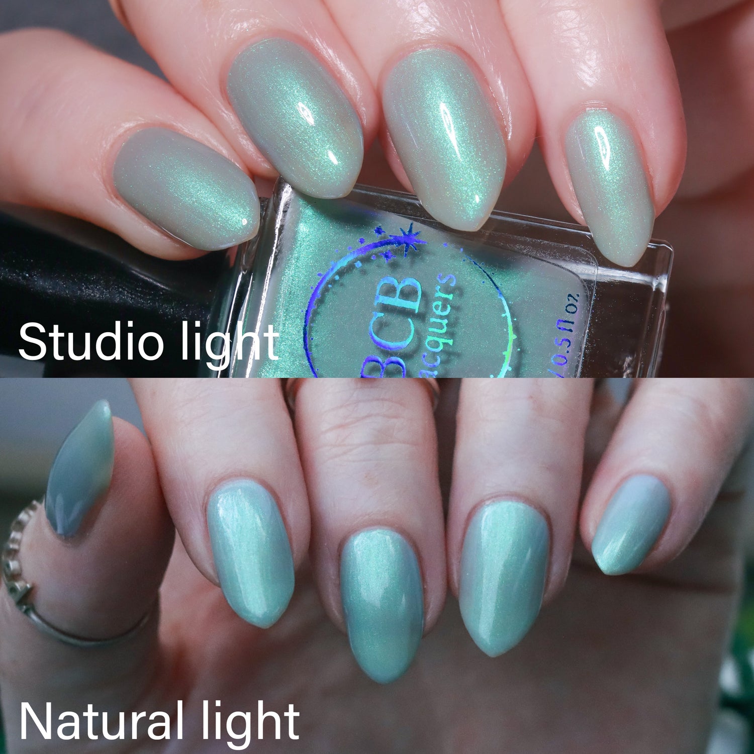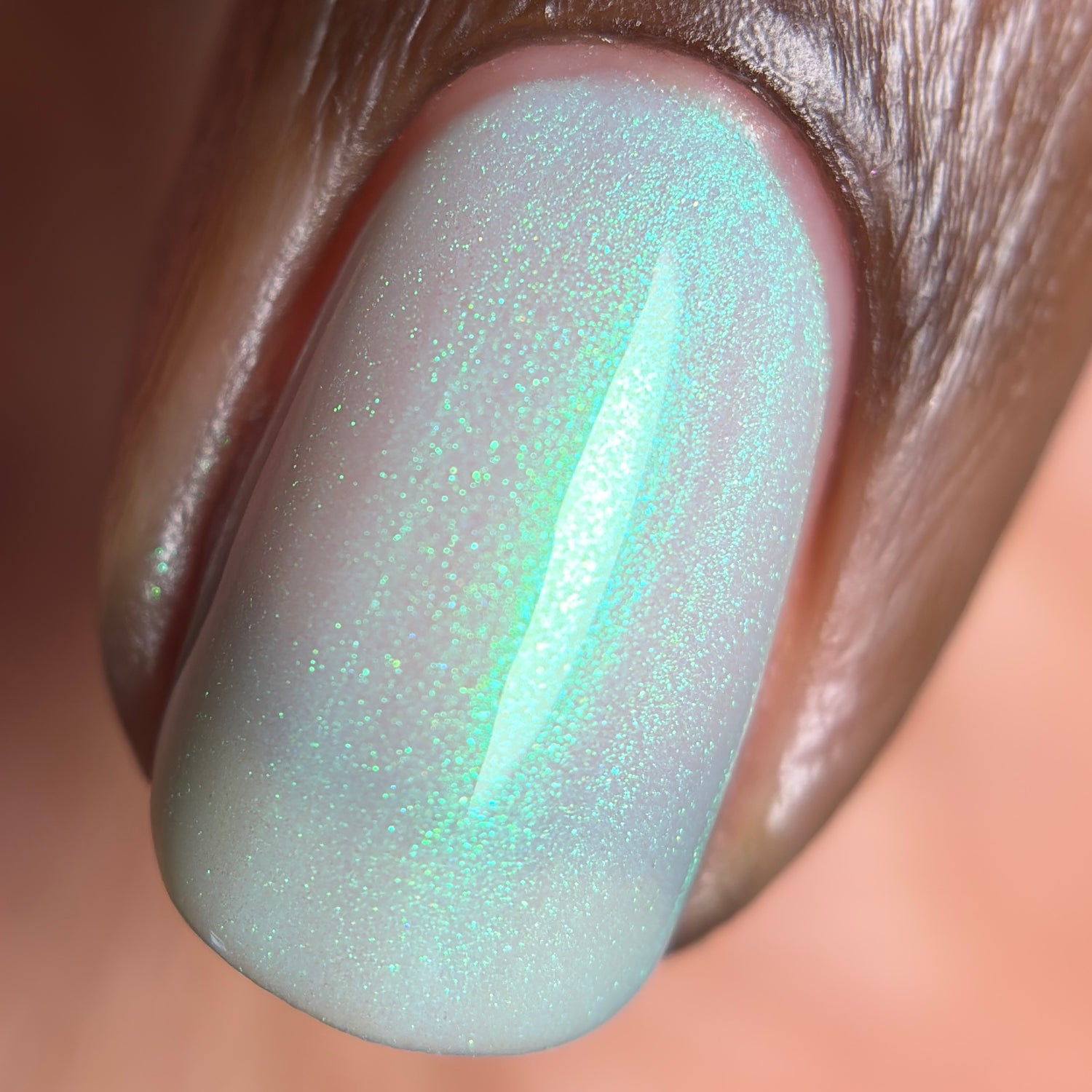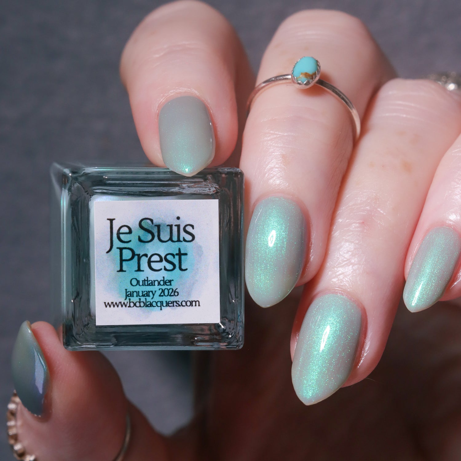 Je Suis Prest: A light grayed sage crelly with a strong green/blue shifting shimmer.