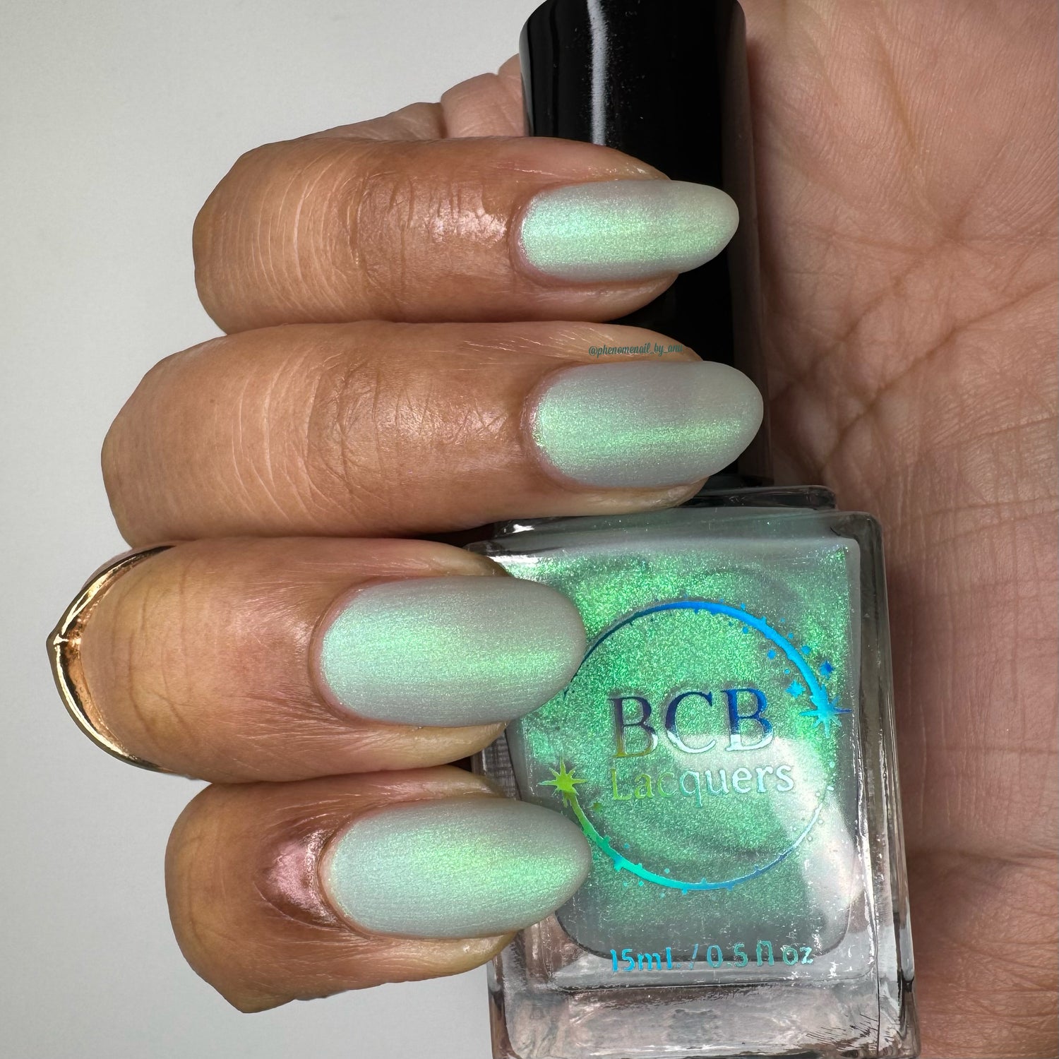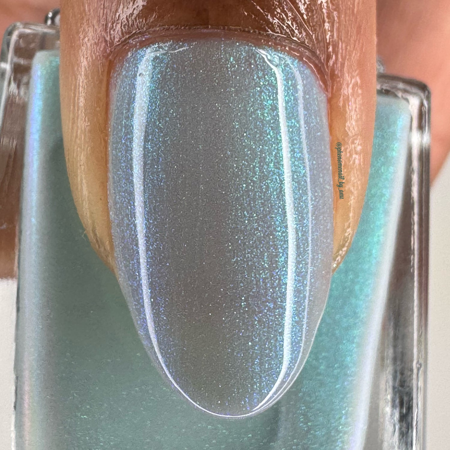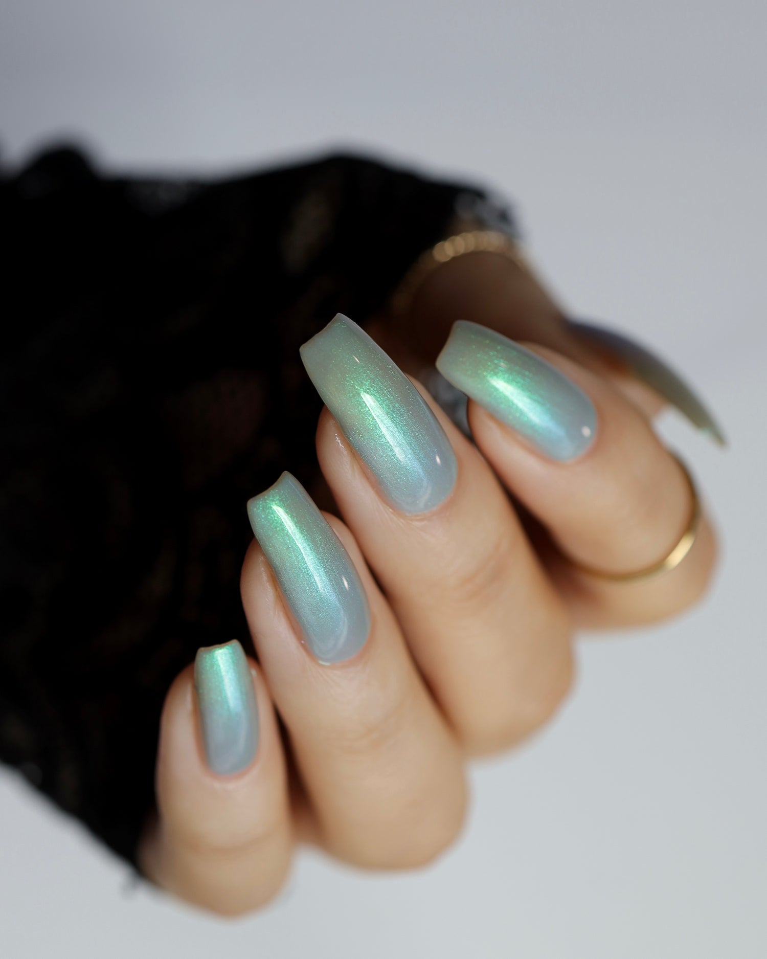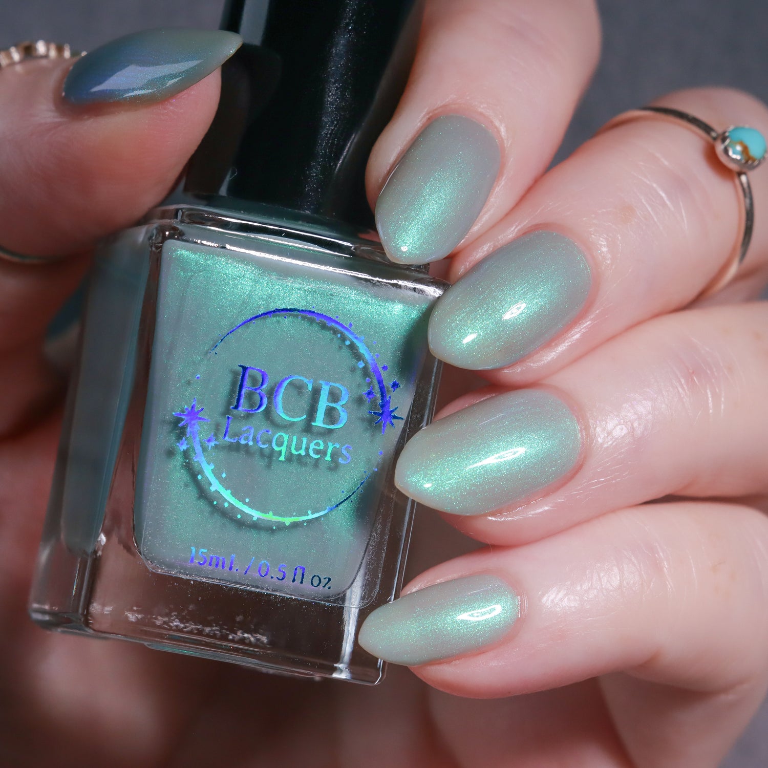 Je Suis Prest: A light grayed sage crelly with a strong green/blue shifting shimmer.