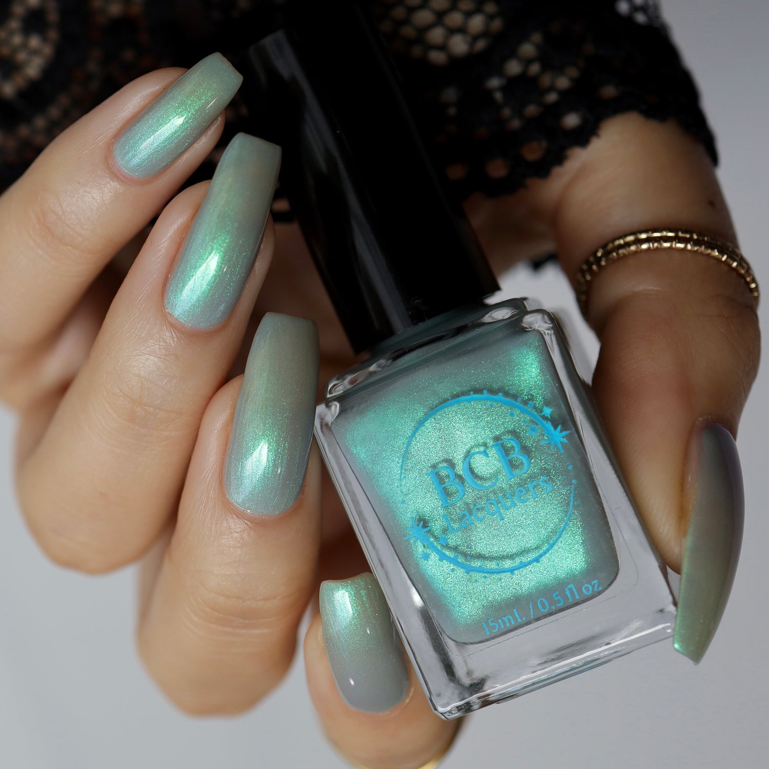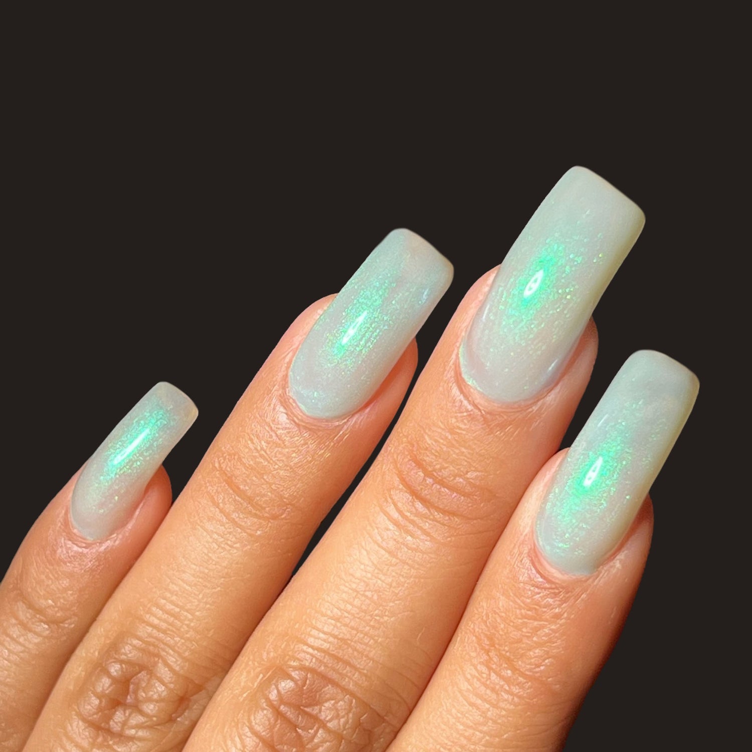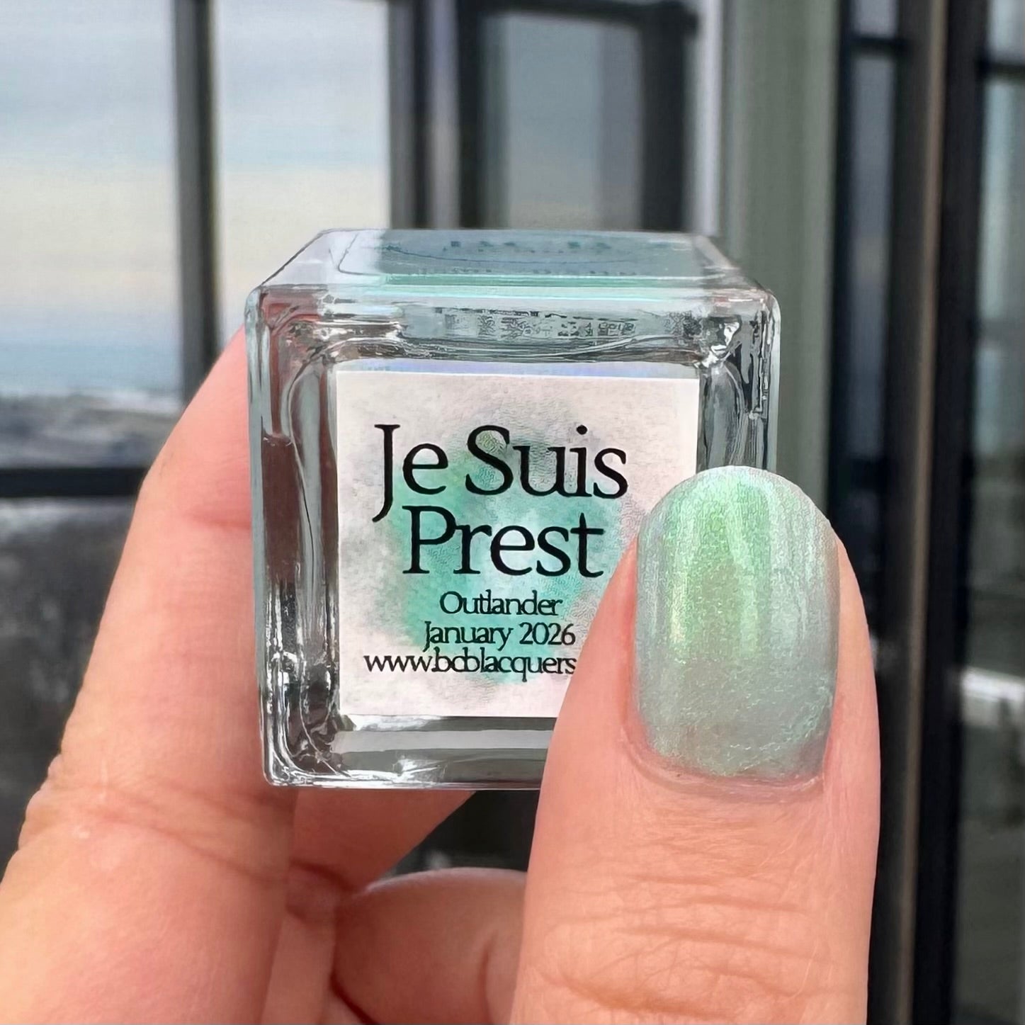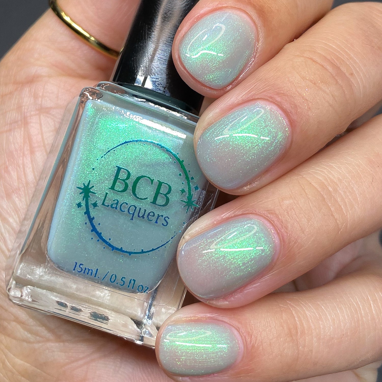 Je Suis Prest: A light grayed sage crelly with a strong green/blue shifting shimmer.