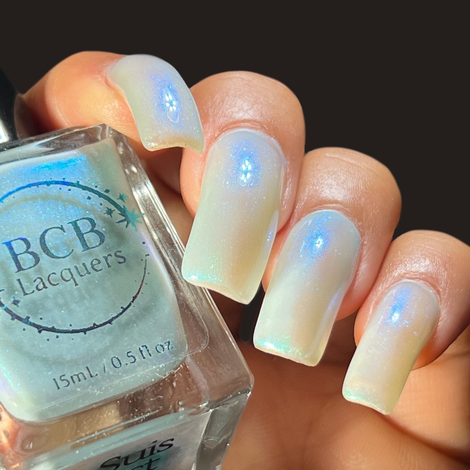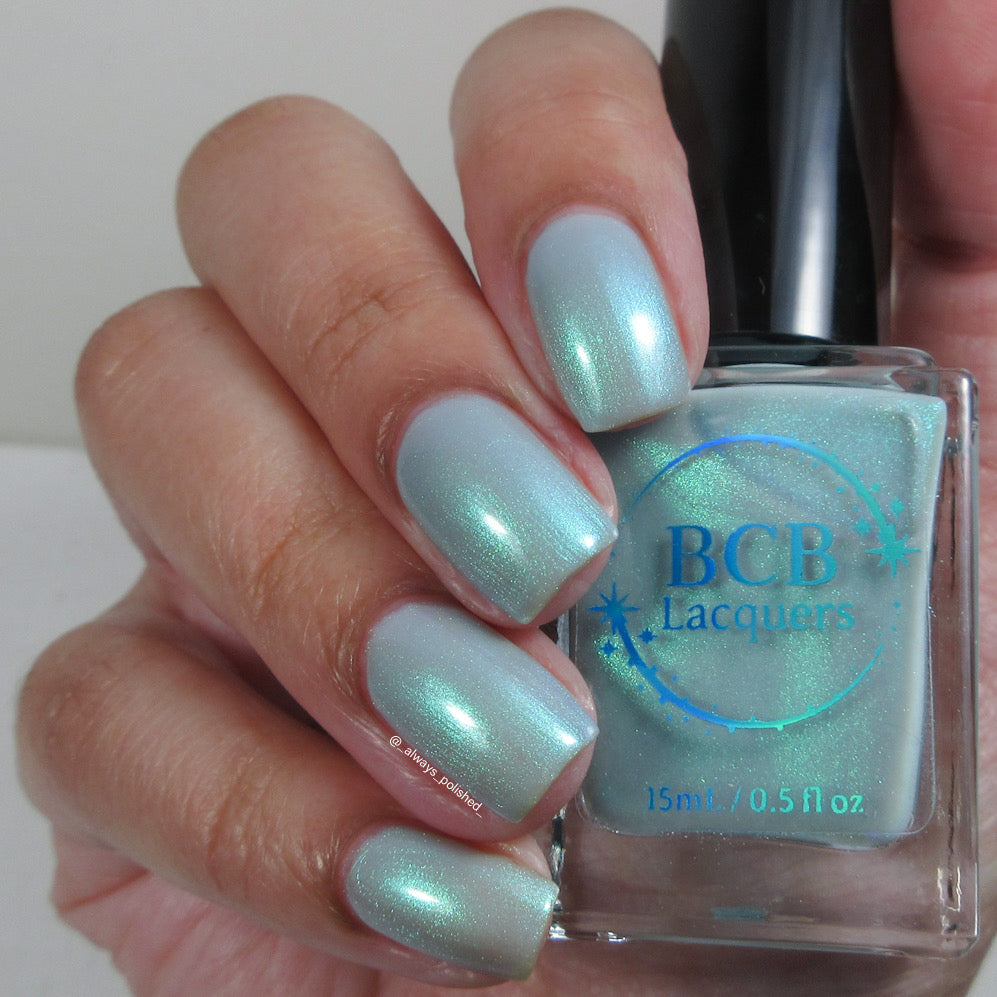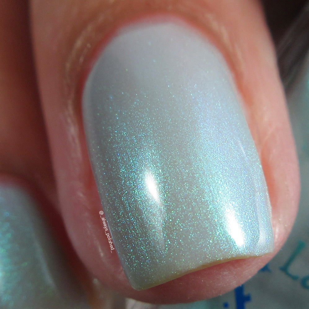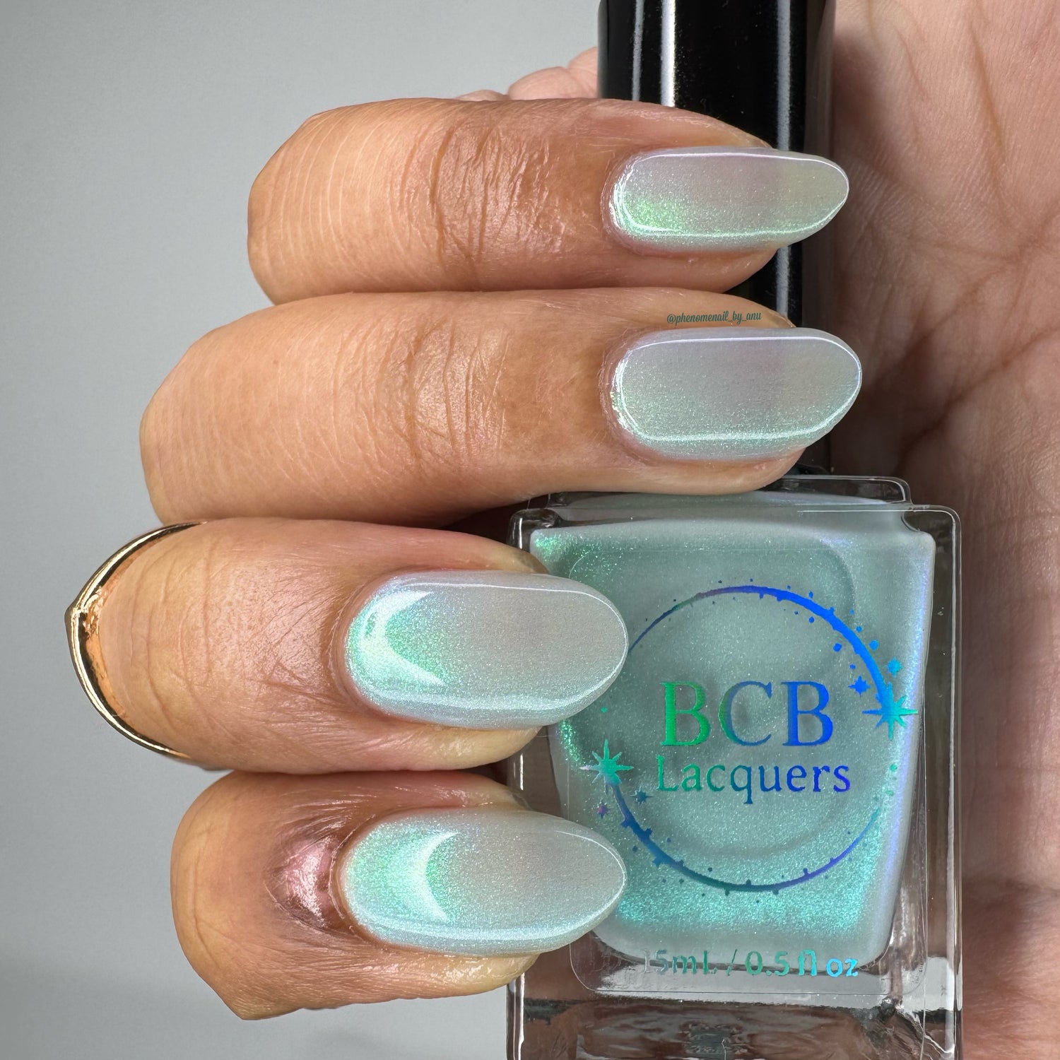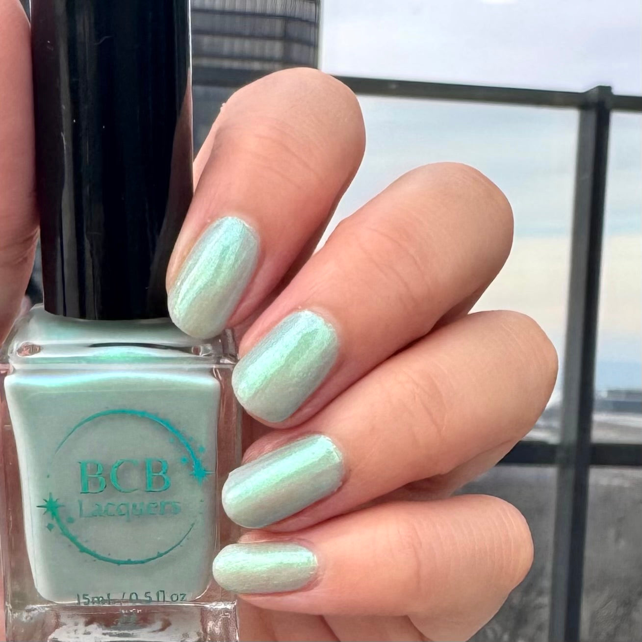 Je Suis Prest: A light grayed sage crelly with a strong green/blue shifting shimmer.