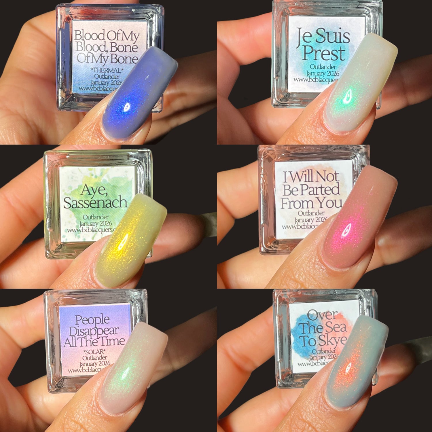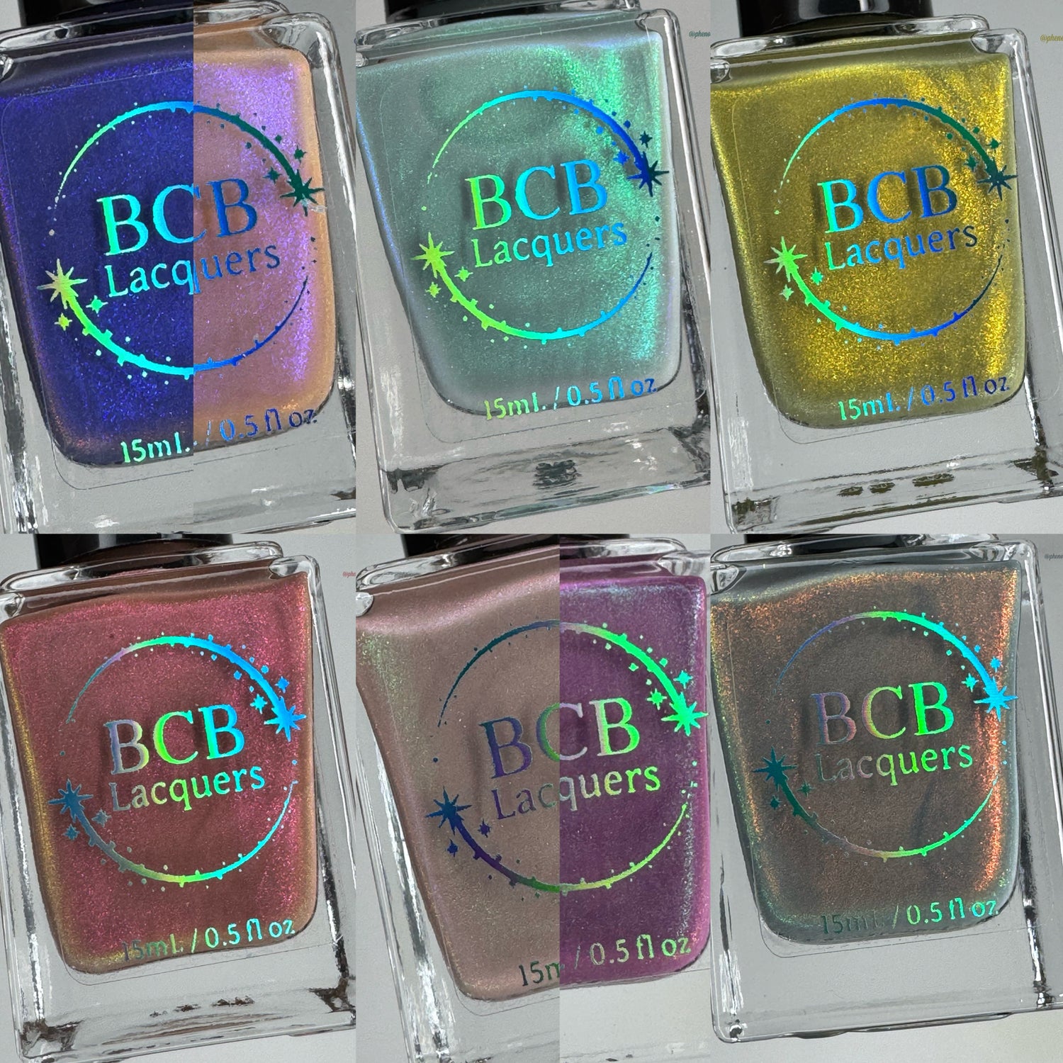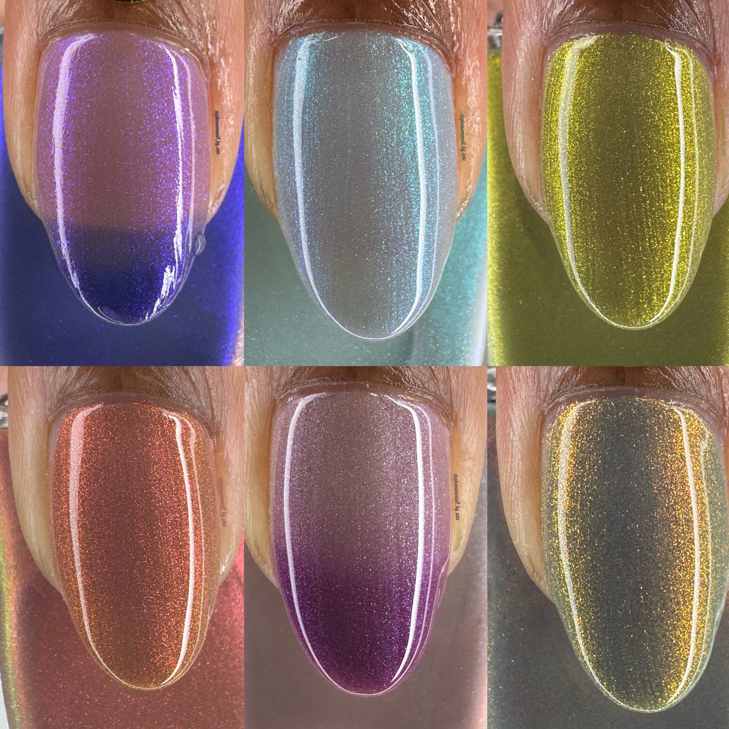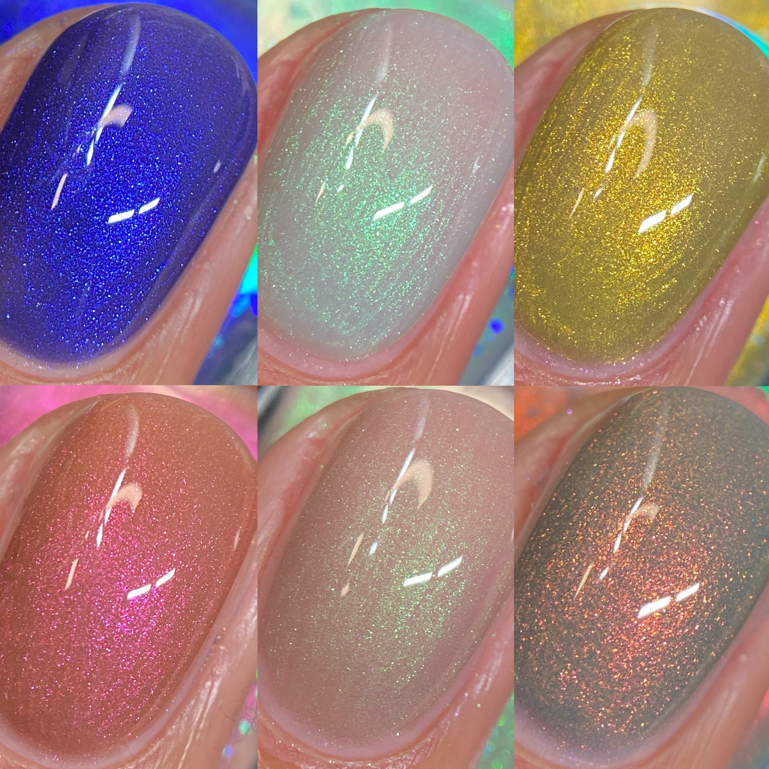 • Over The Sea To Skye: A light smokey blue crelly with a strong red/orange/gold/green shifting shimmer.