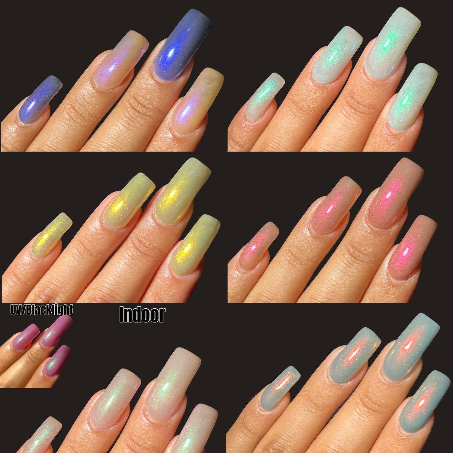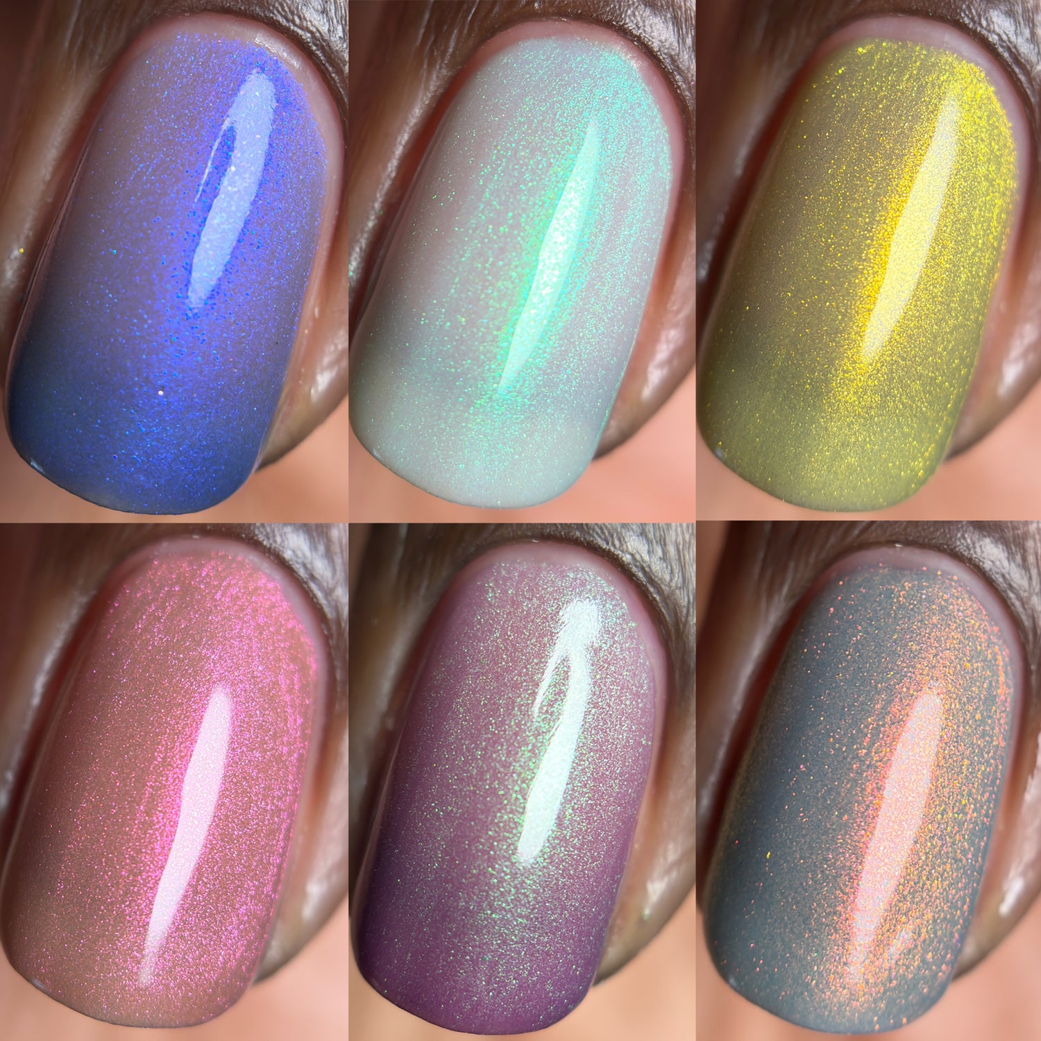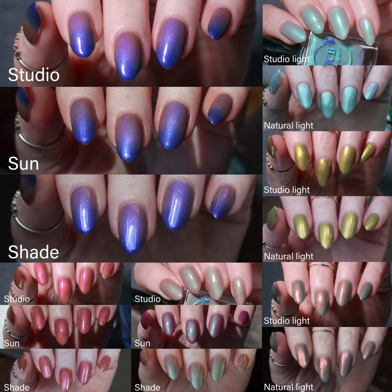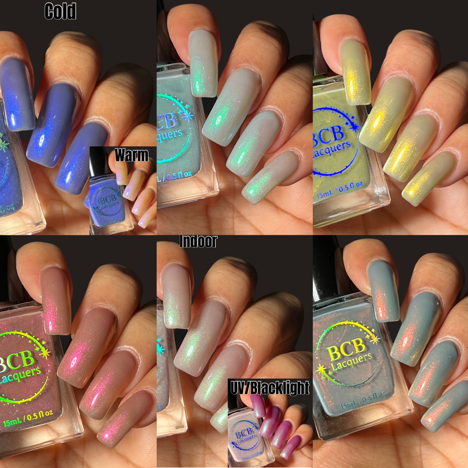 • People Disappear All The Time - *SOLAR*: A pale pink taupe(indoor) to a bright mauve purple(outdoor/UV Light) with a strong green/pink shifting shimmer.