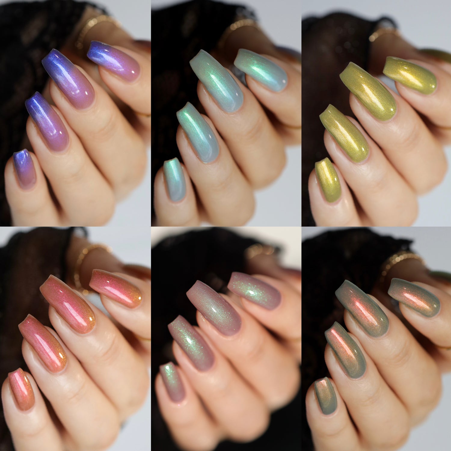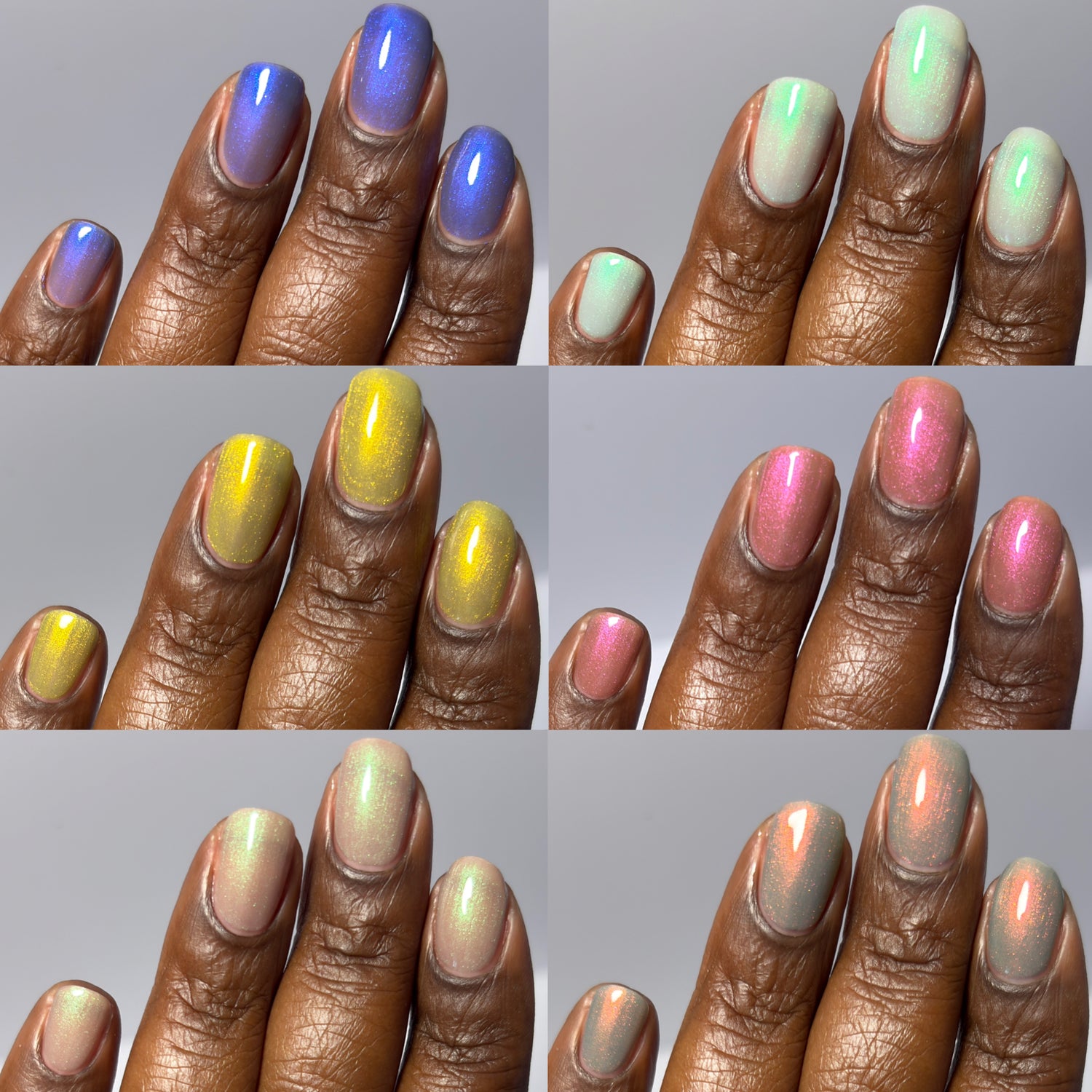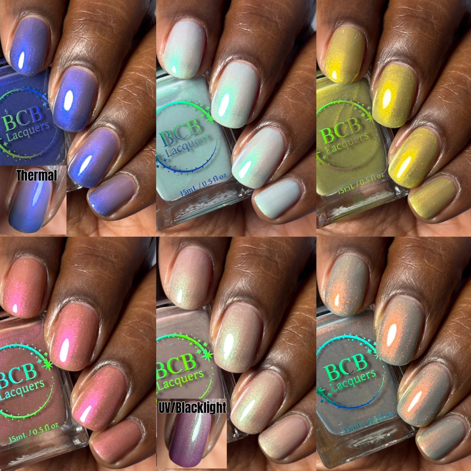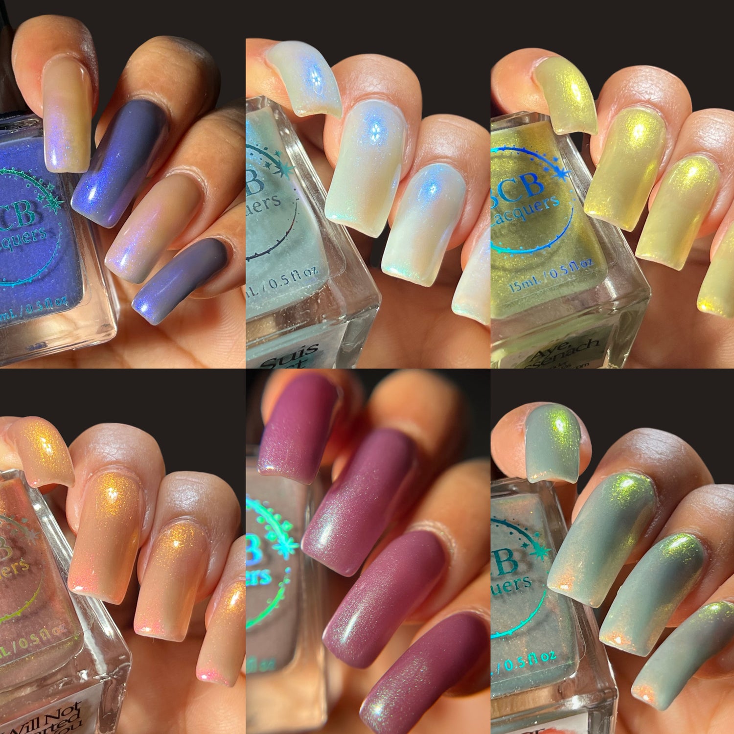 • People Disappear All The Time - *SOLAR*: A pale pink taupe(indoor) to a bright mauve purple(outdoor/UV Light) with a strong green/pink shifting shimmer.