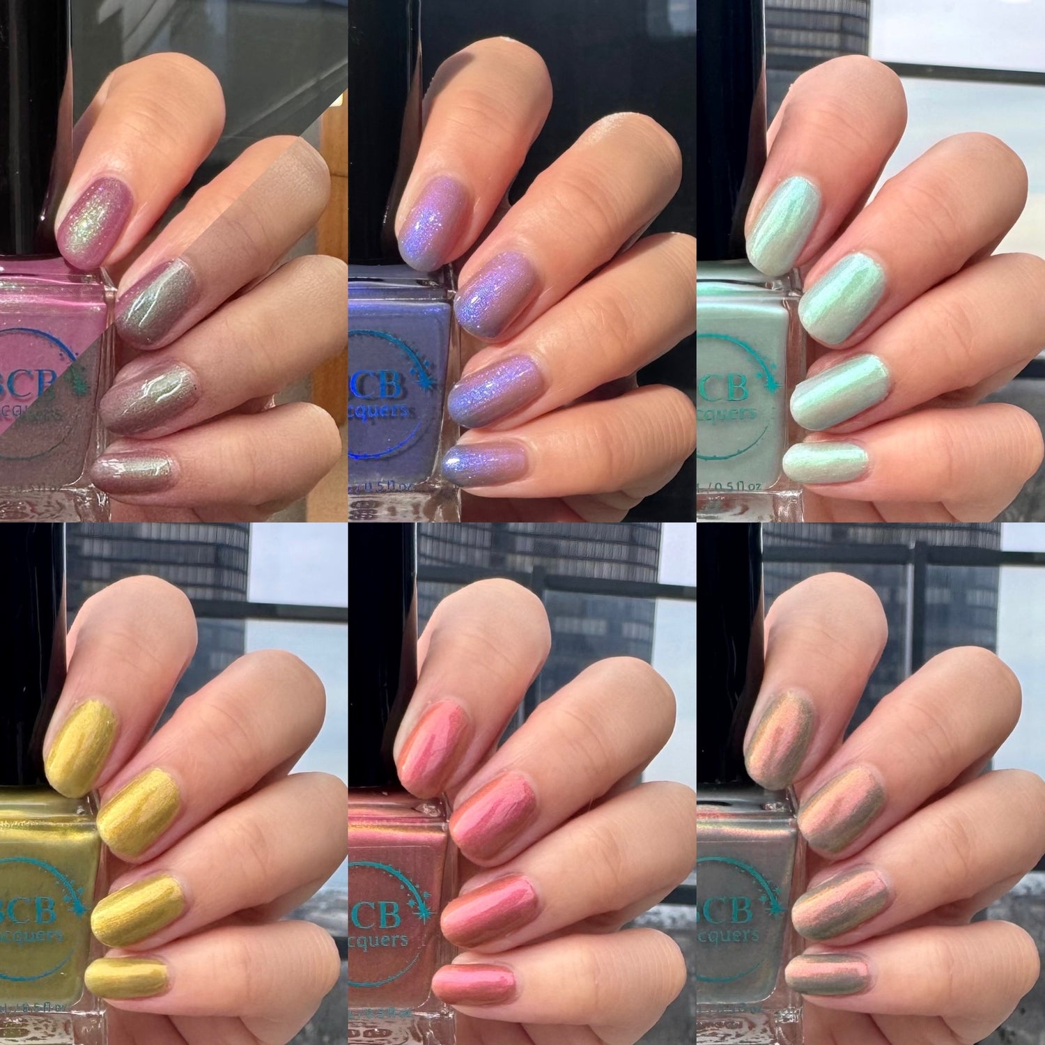 • Je Suis Prest: A light grayed sage crelly with a strong green/blue shifting shimmer.