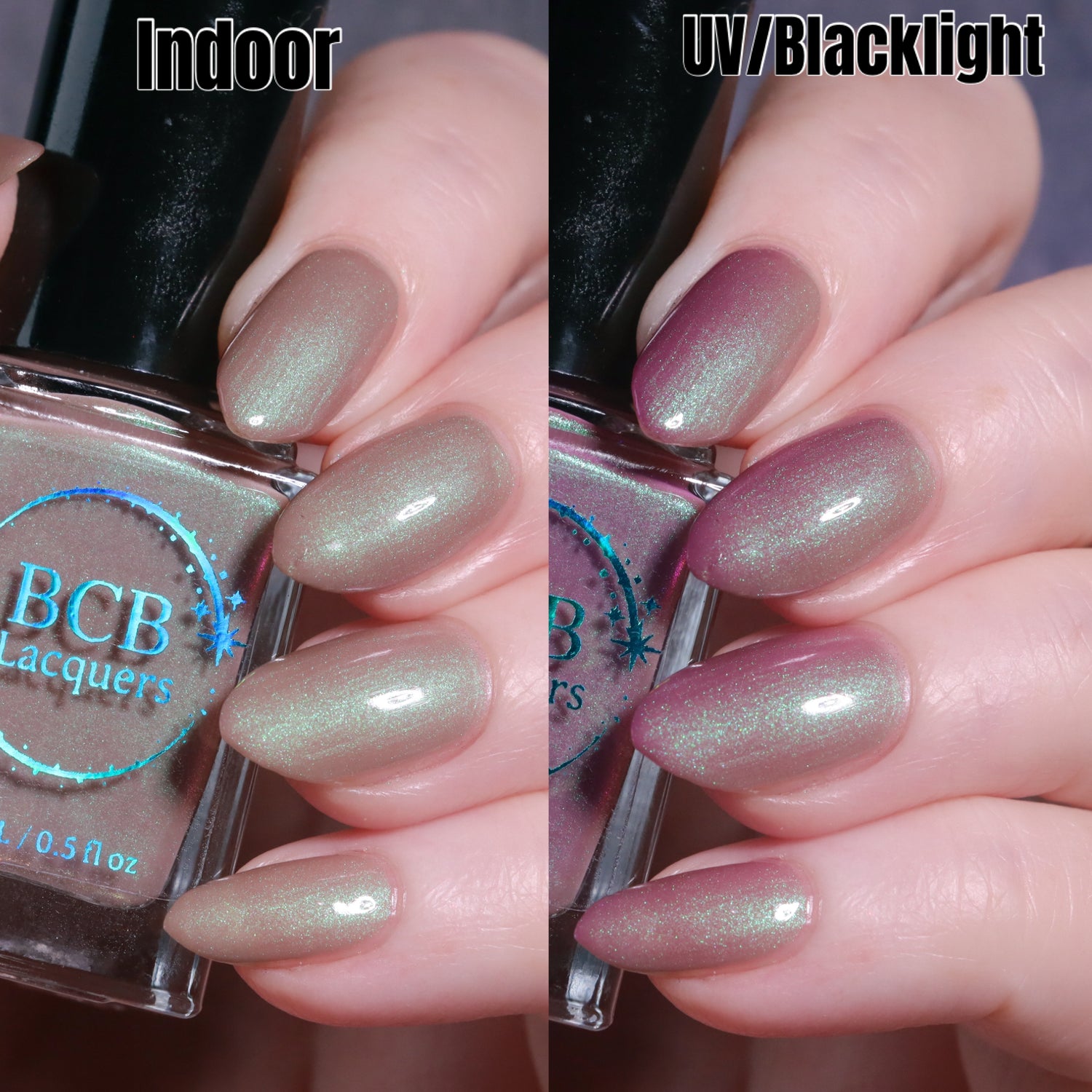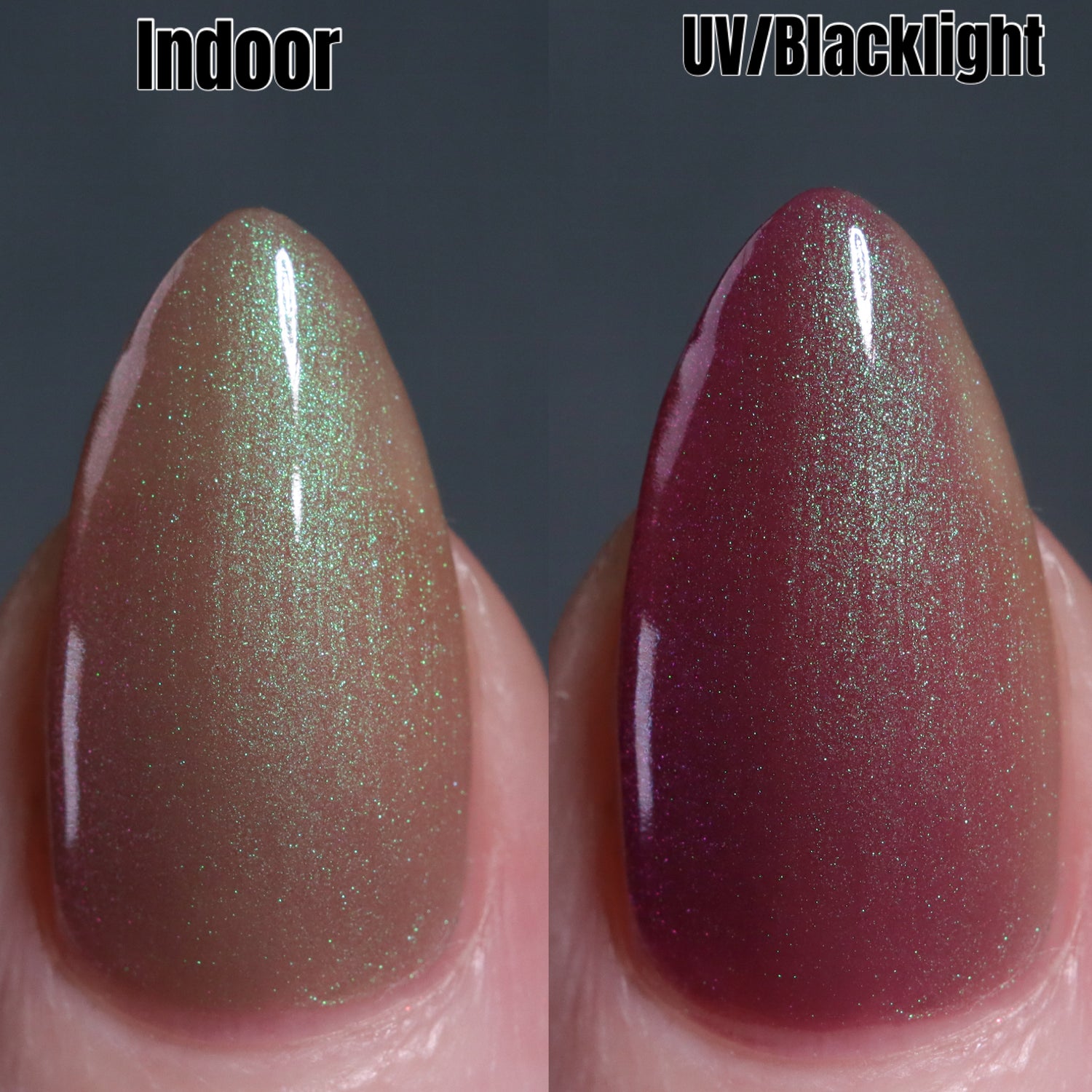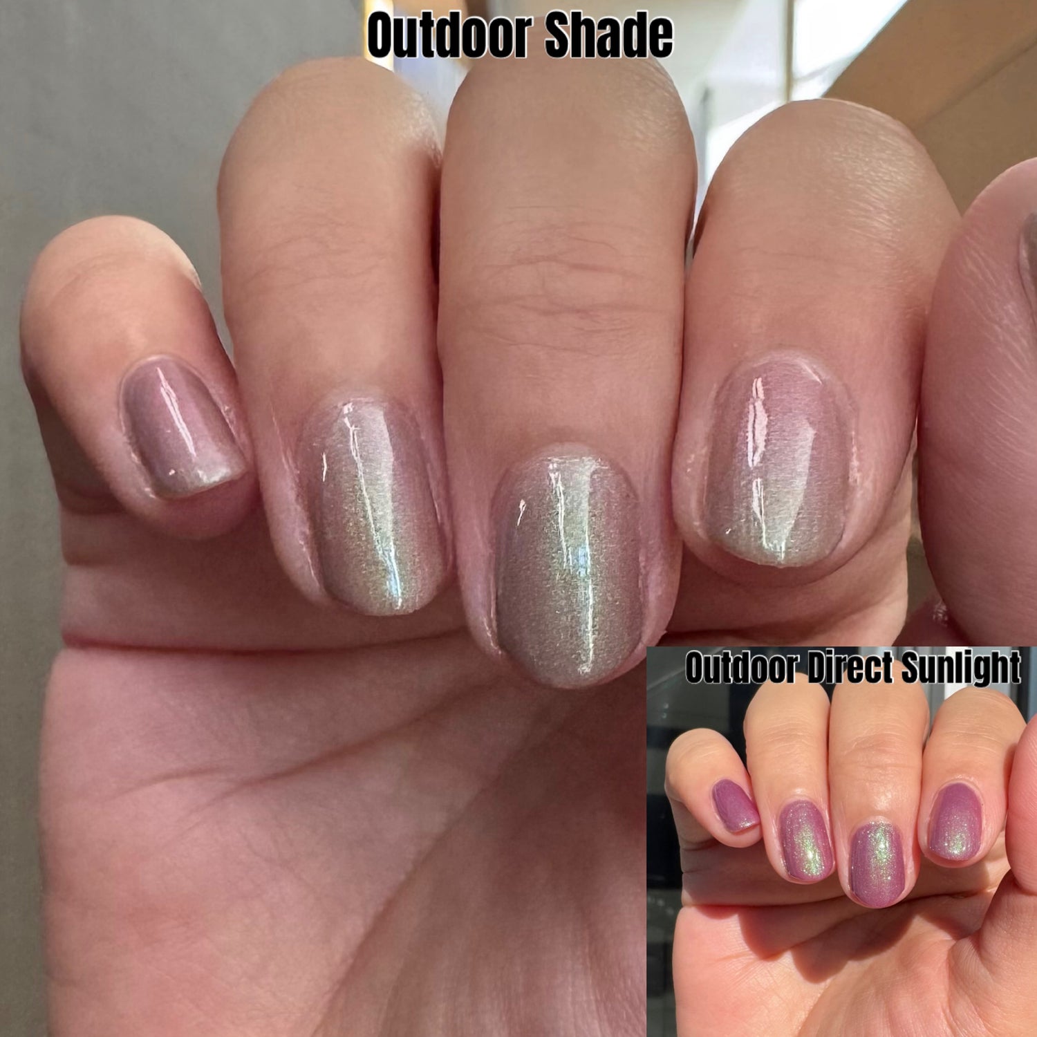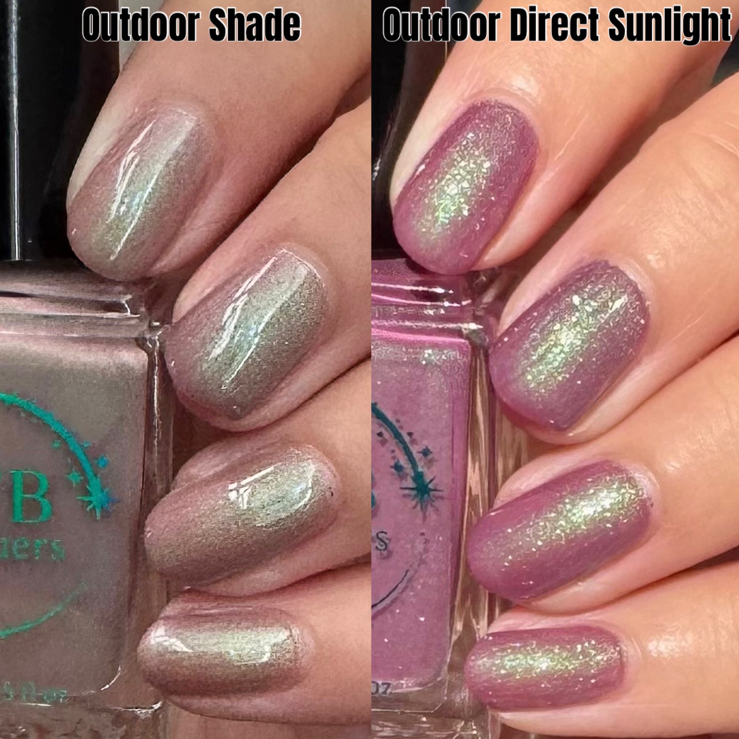 People Disappear All The Time - *SOLAR*: A pale pink taupe(indoor) to a bright mauve purple(outdoor/UV Light) with a strong green/pink shifting shimmer.