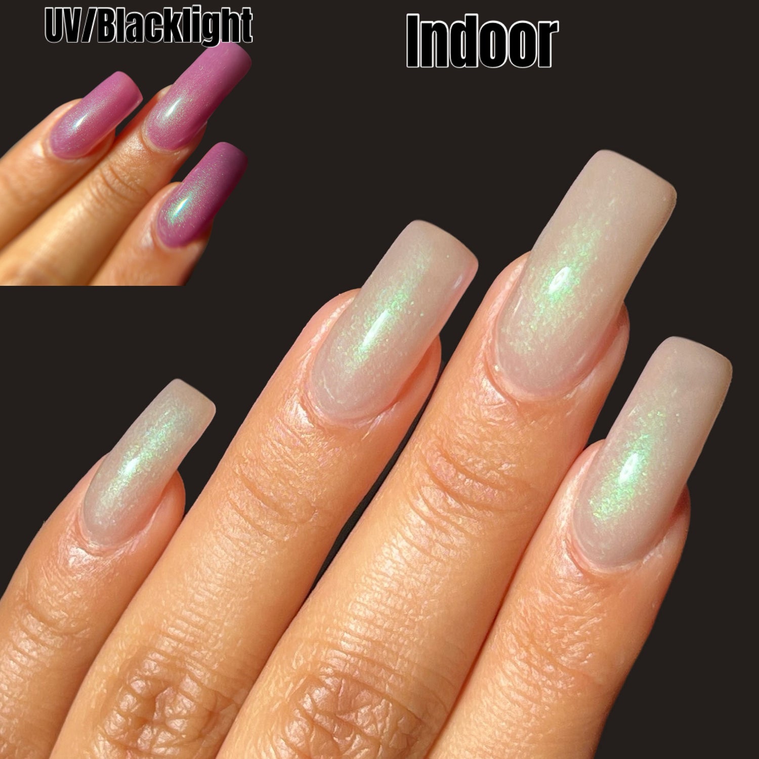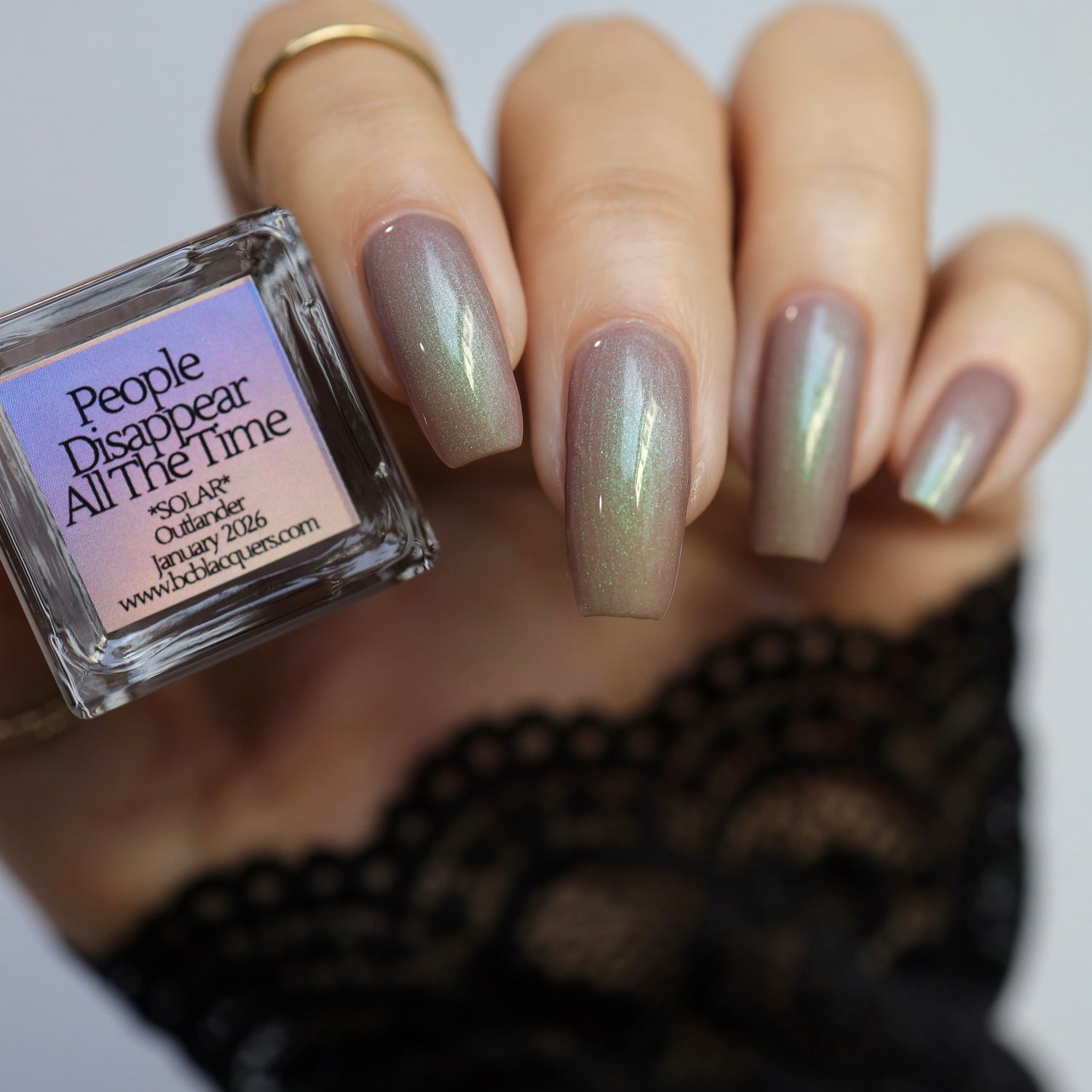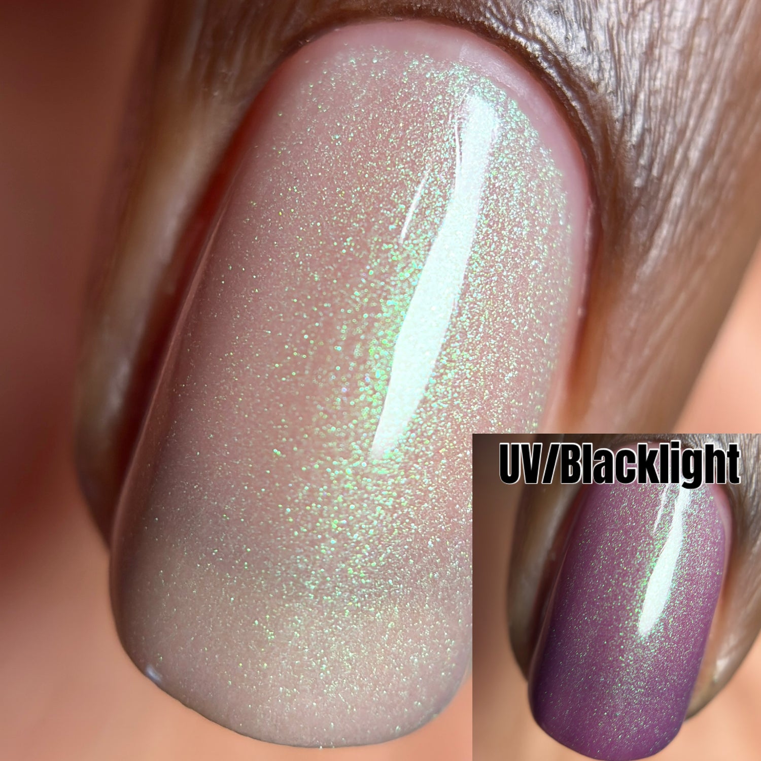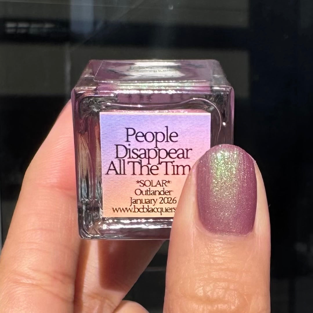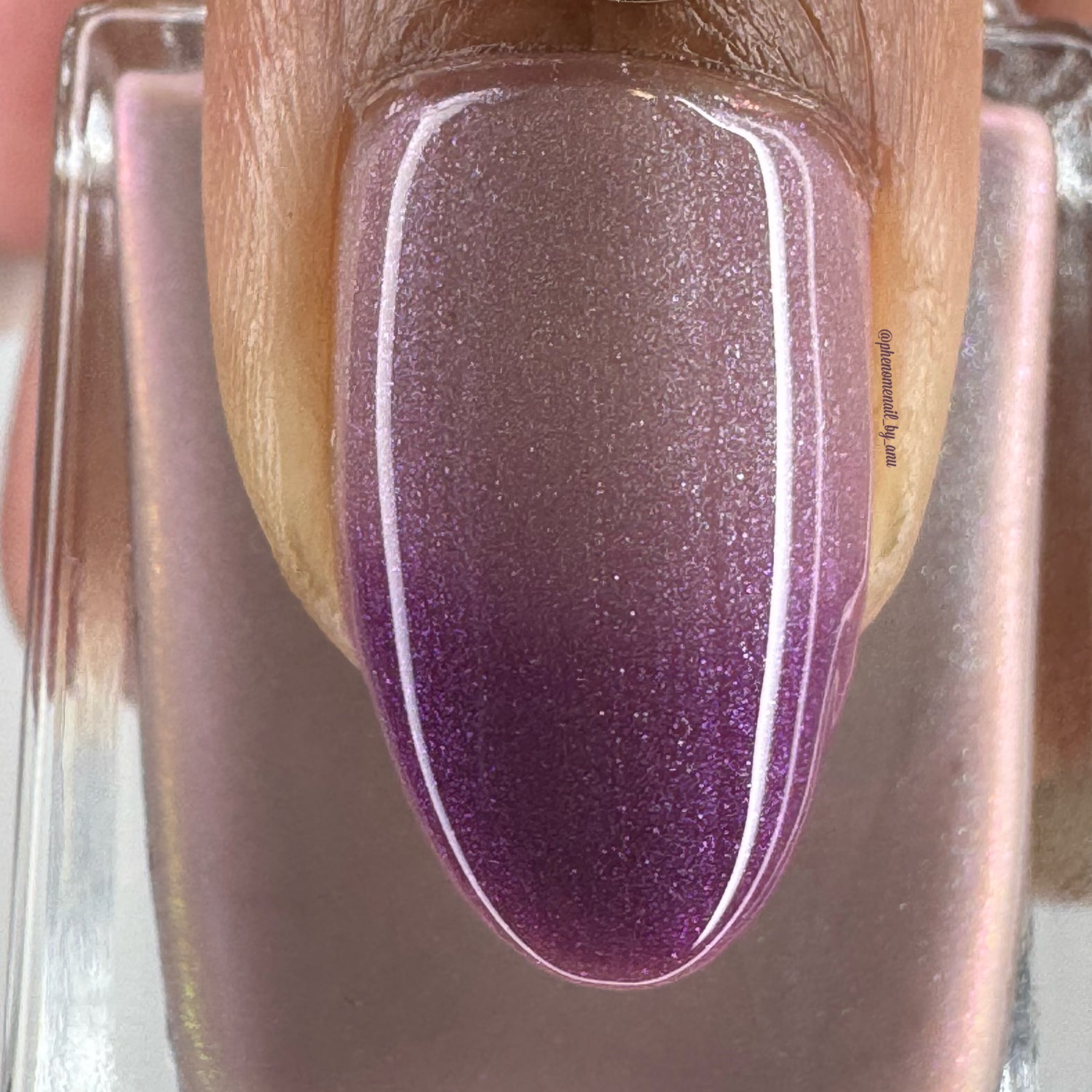 People Disappear All The Time - *SOLAR*: A pale pink taupe(indoor) to a bright mauve purple(outdoor/UV Light) with a strong green/pink shifting shimmer.