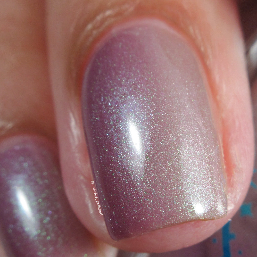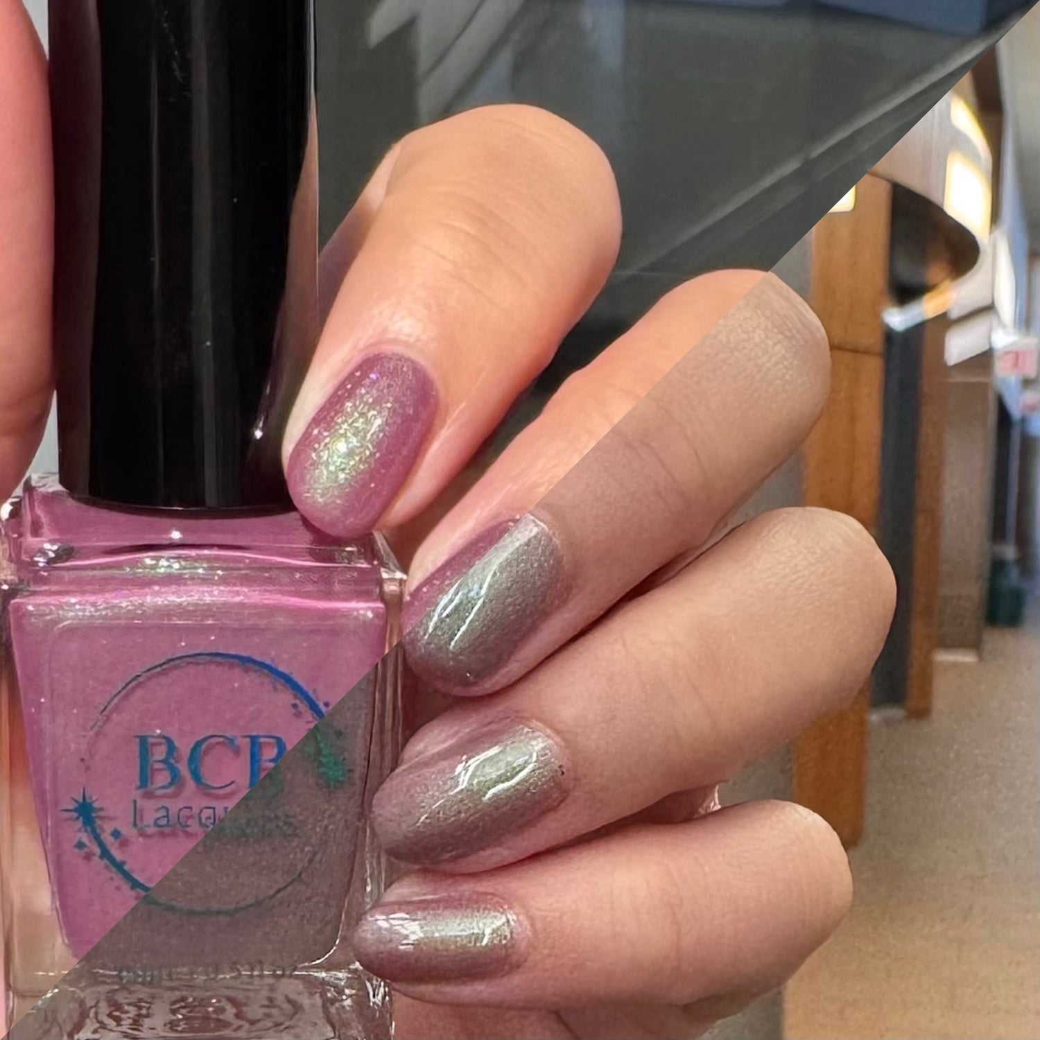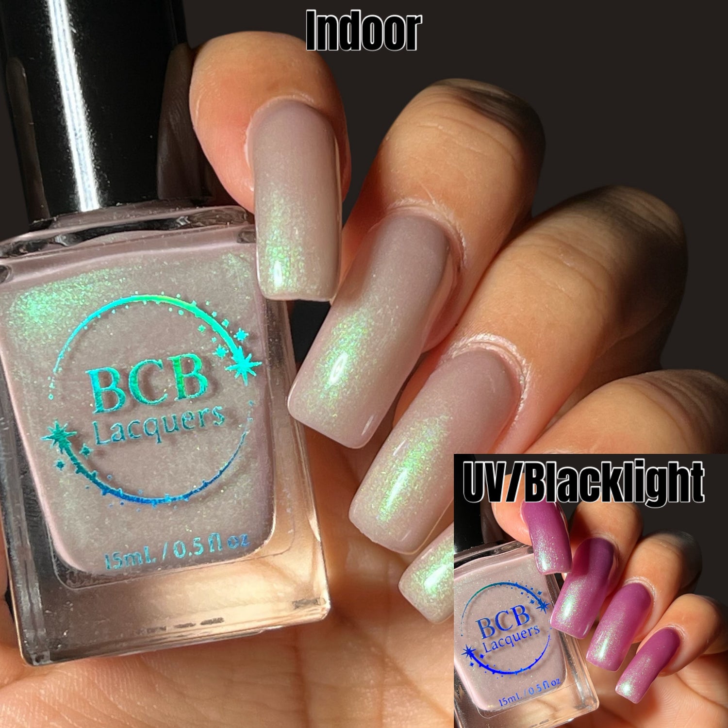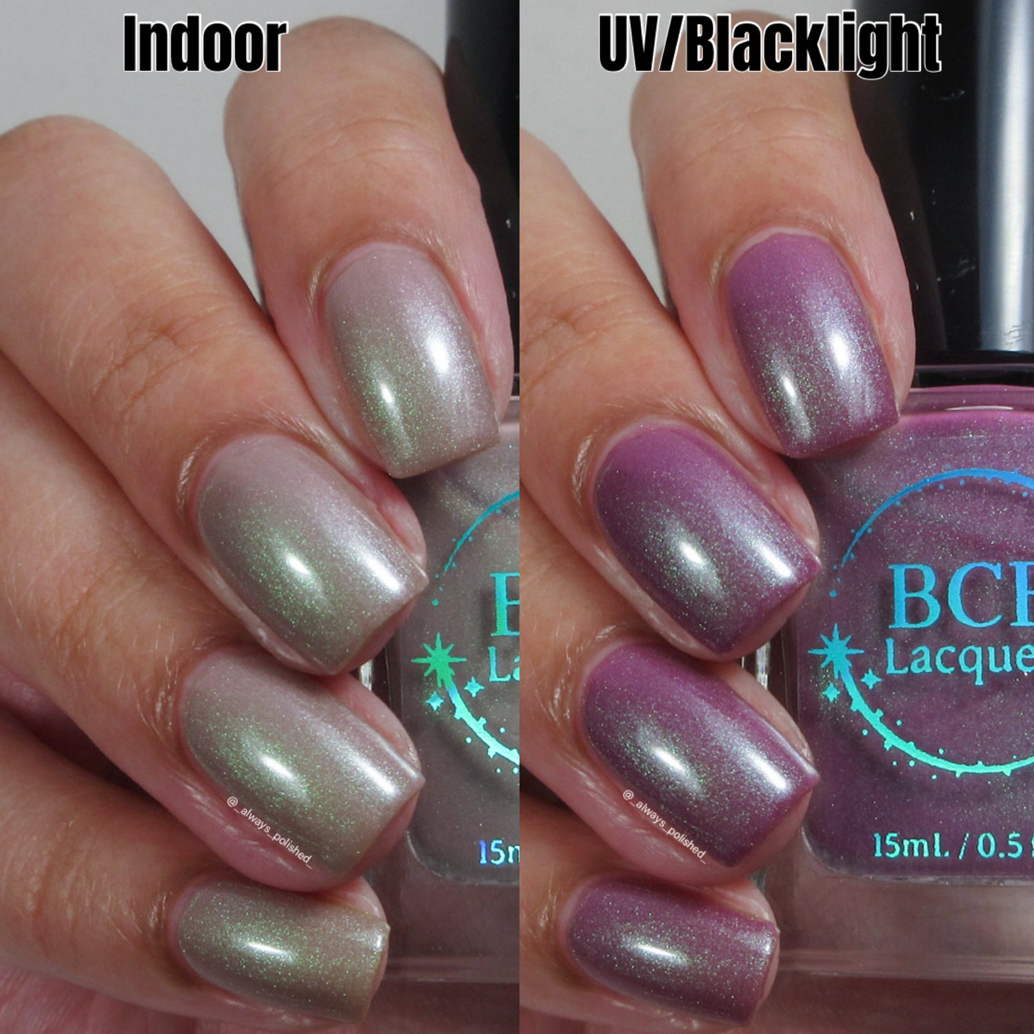 People Disappear All The Time - *SOLAR*: A pale pink taupe(indoor) to a bright mauve purple(outdoor/UV Light) with a strong green/pink shifting shimmer.
