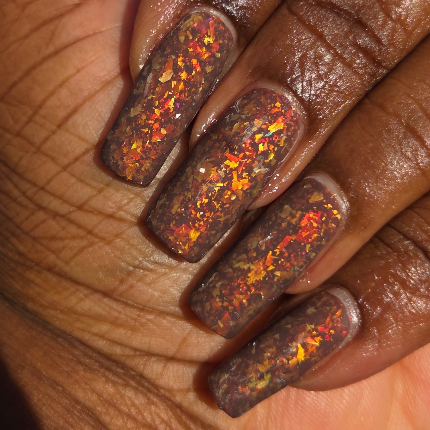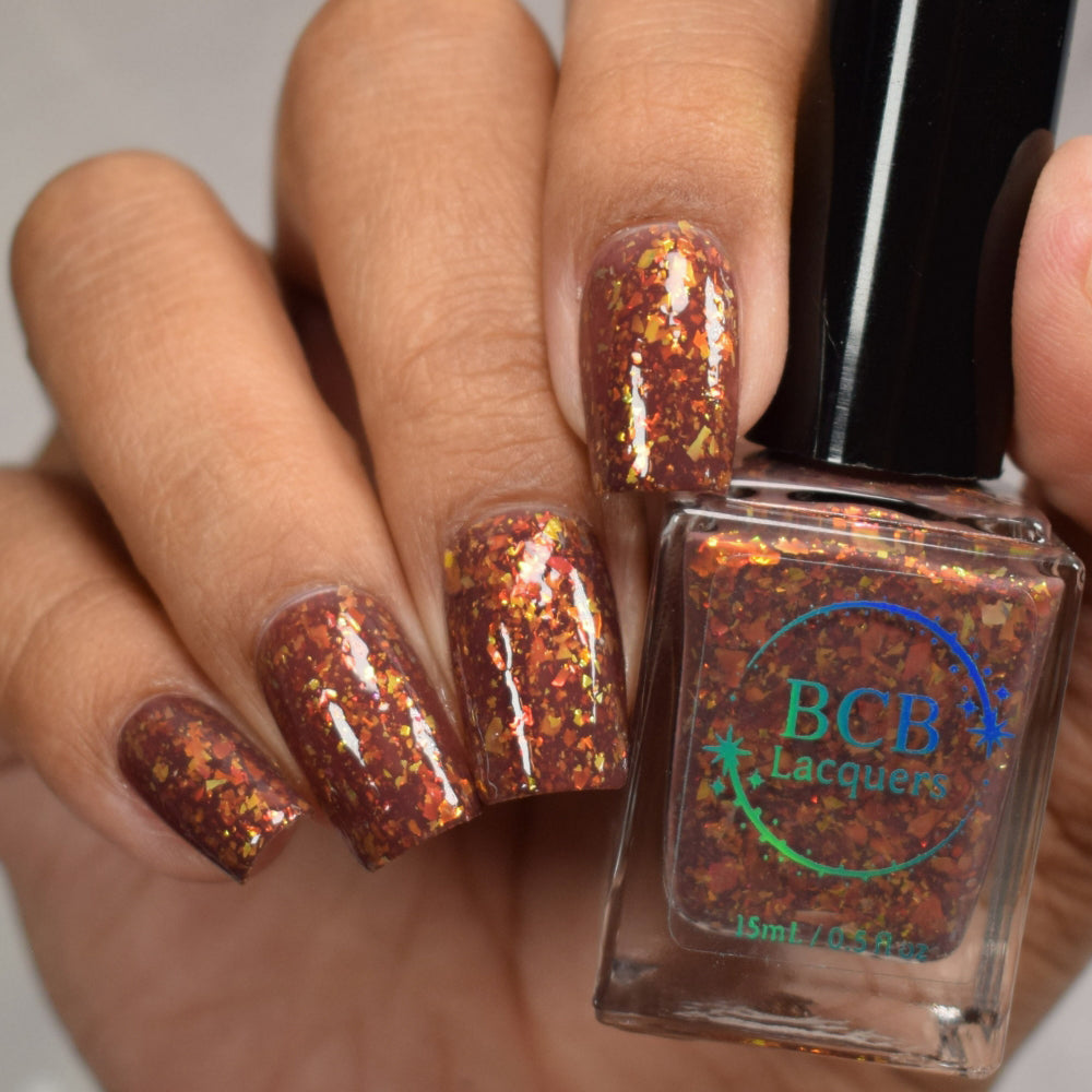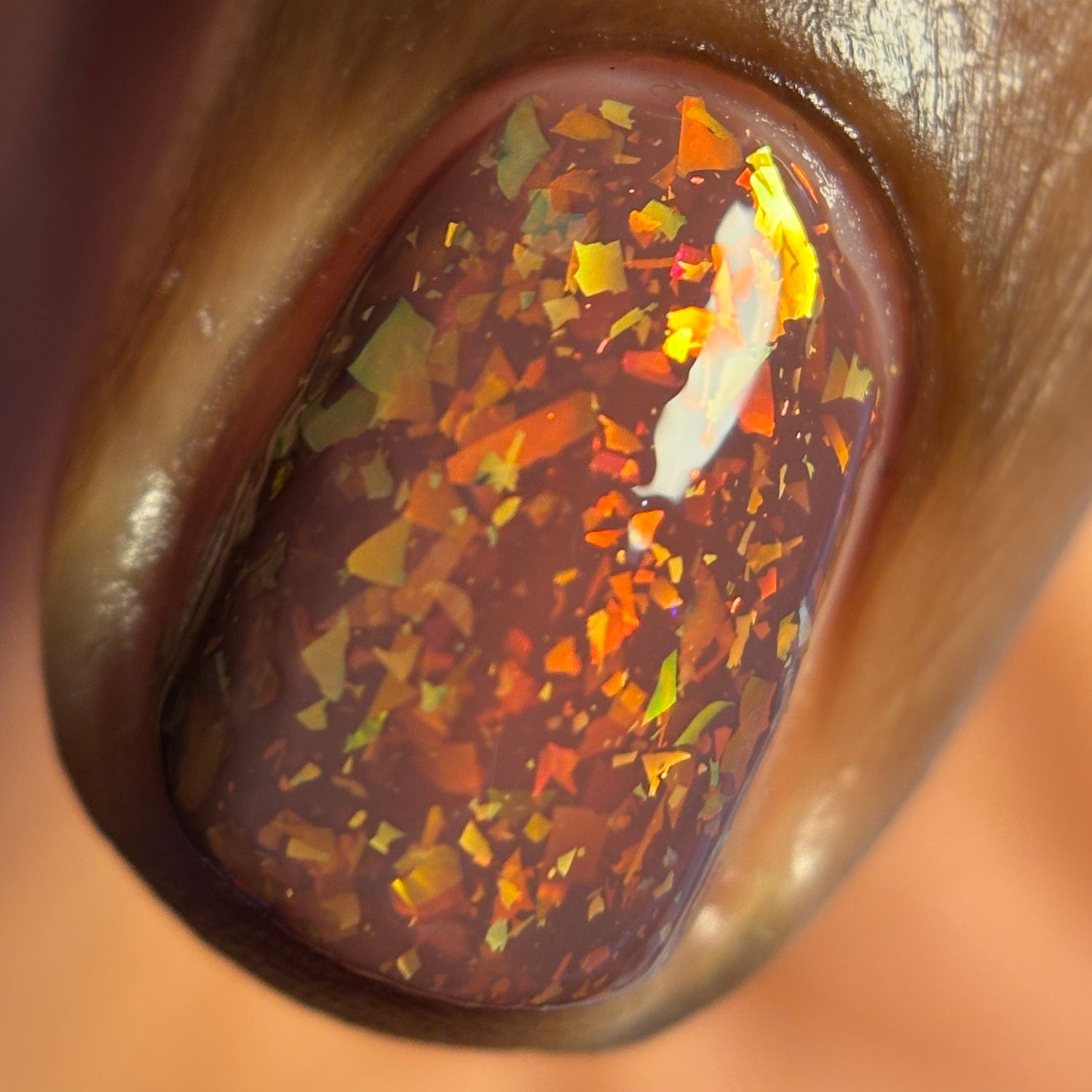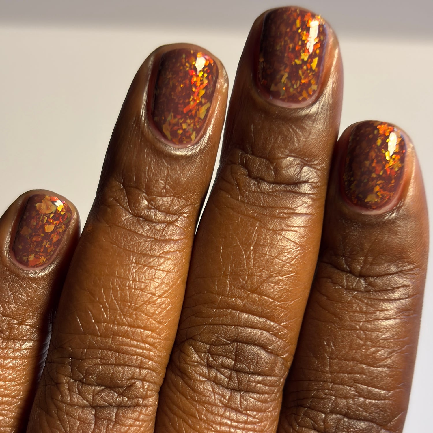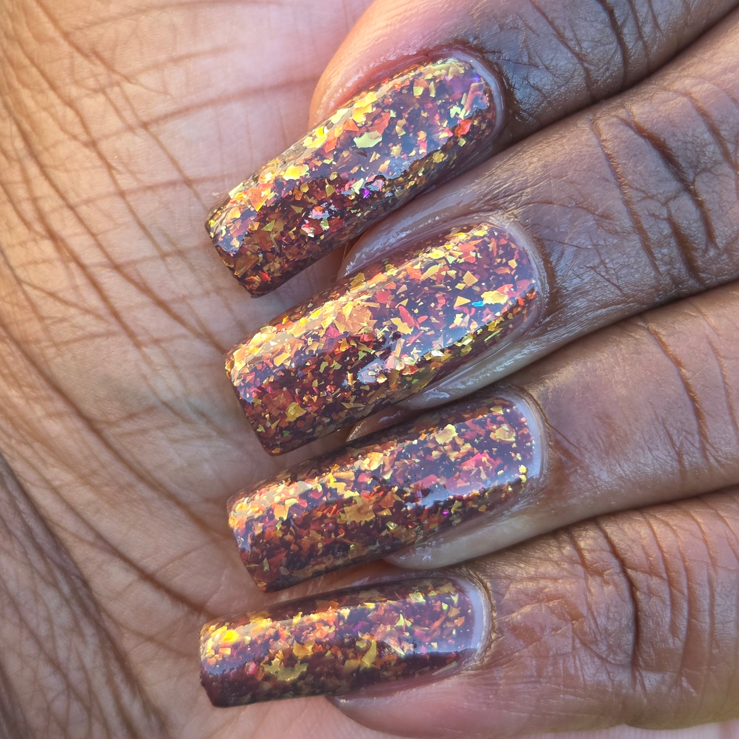 Po-Ta-Toes! Boil ‘em, Mash ‘em, Stick ‘em In A Stew!: A brown crelly with gold glass flakes and red/orange/gold glass flakes.