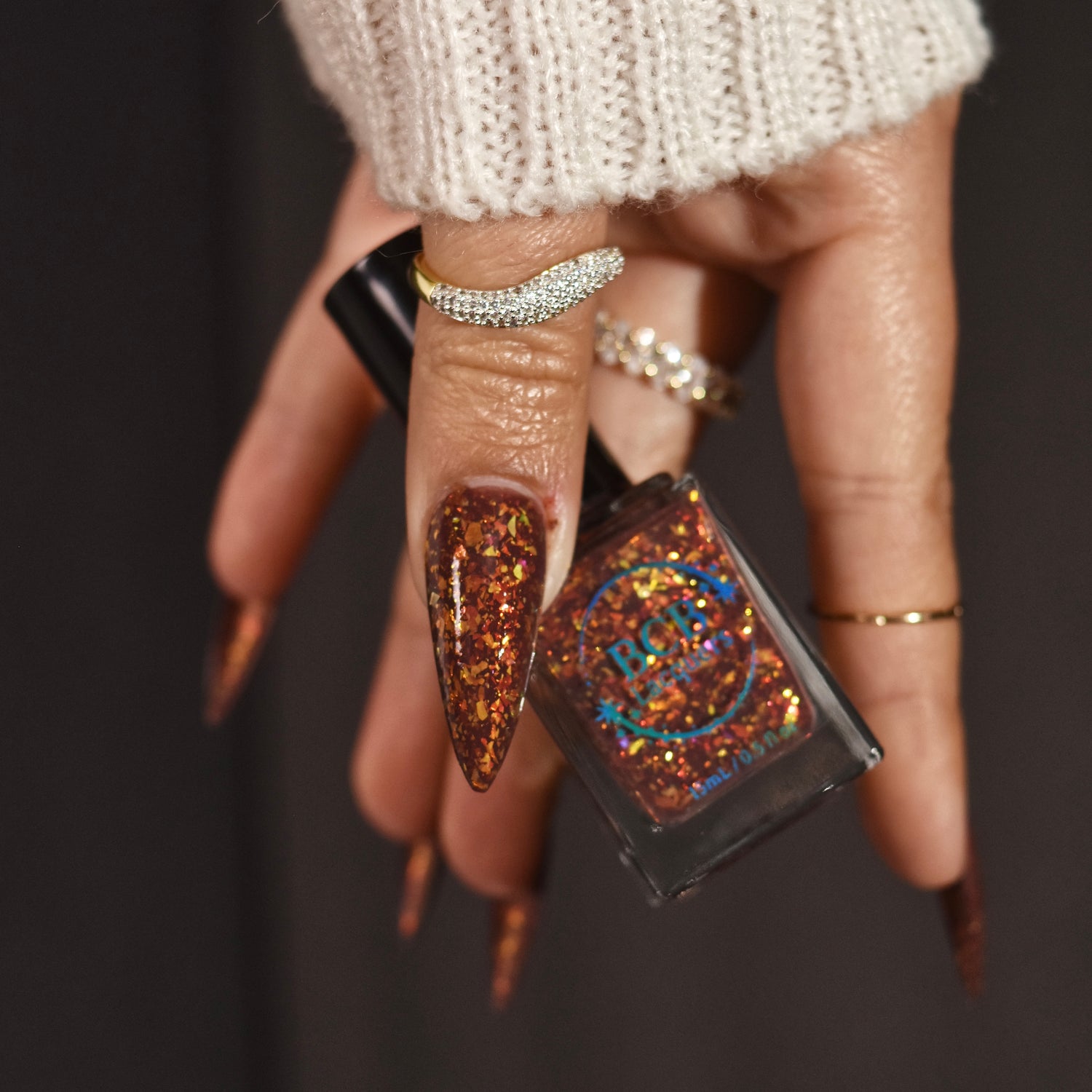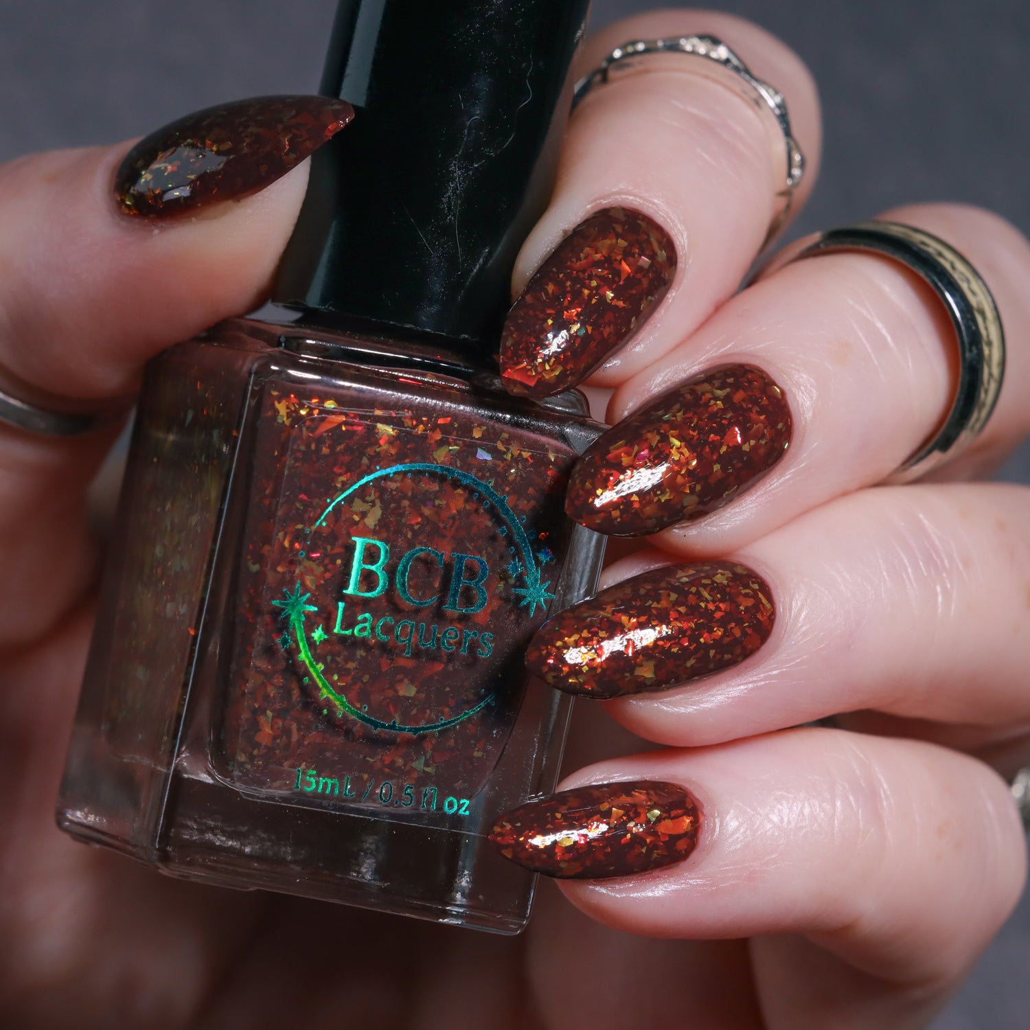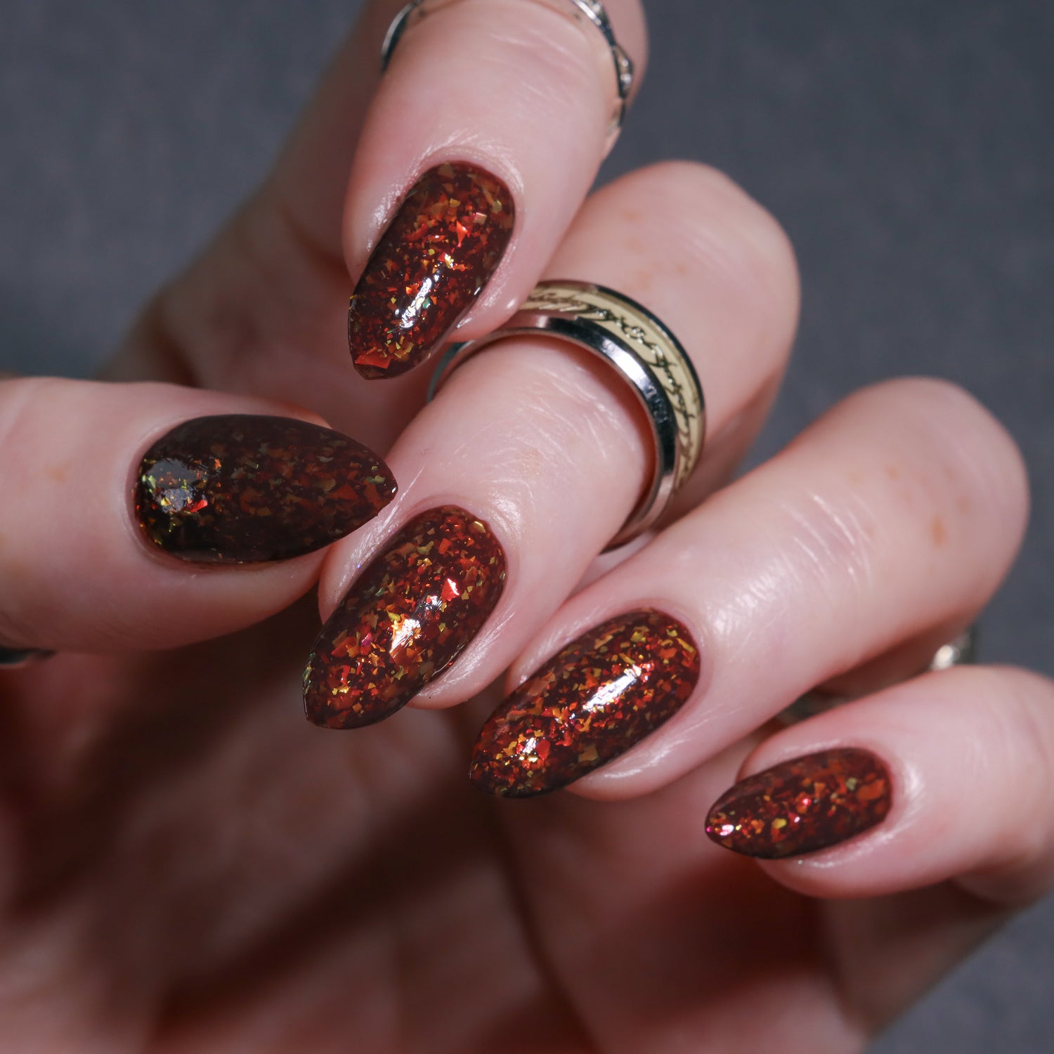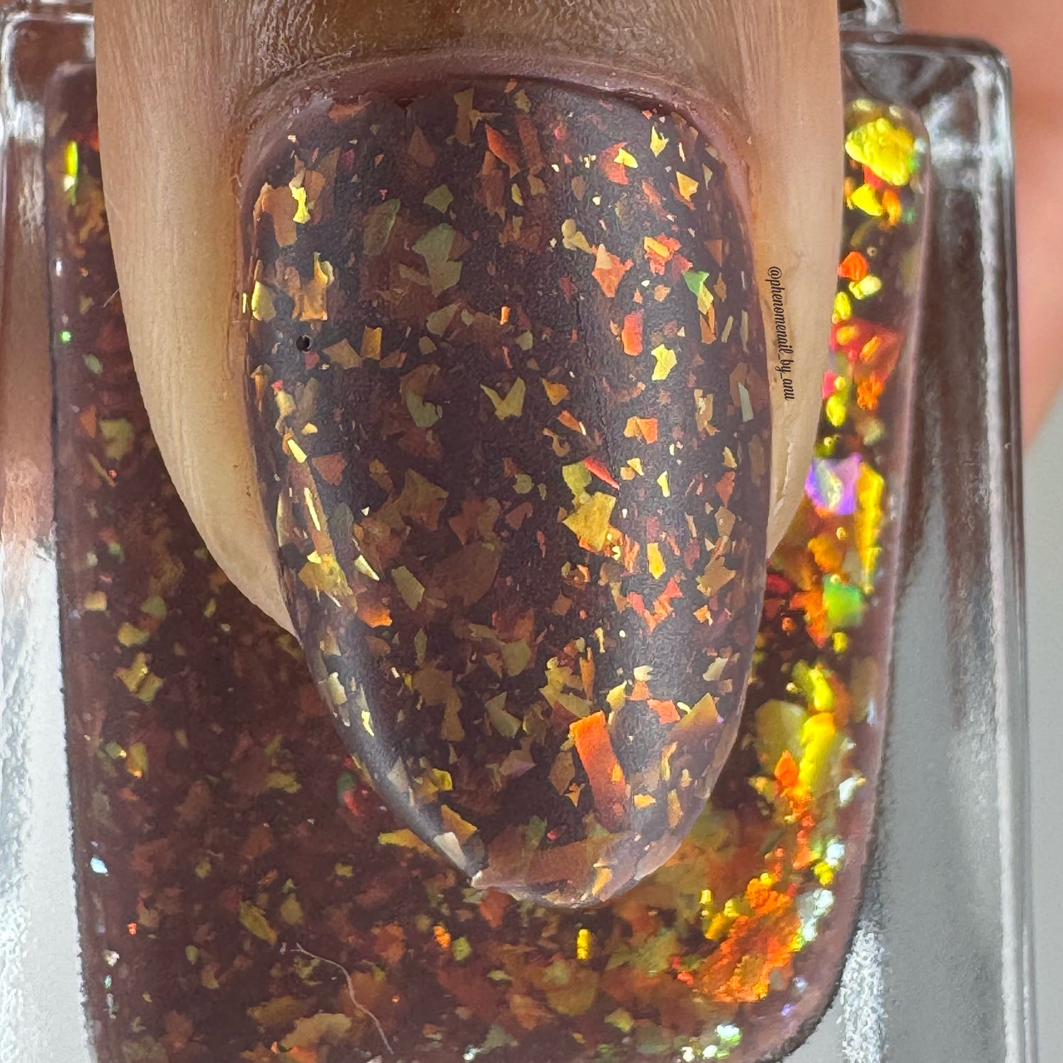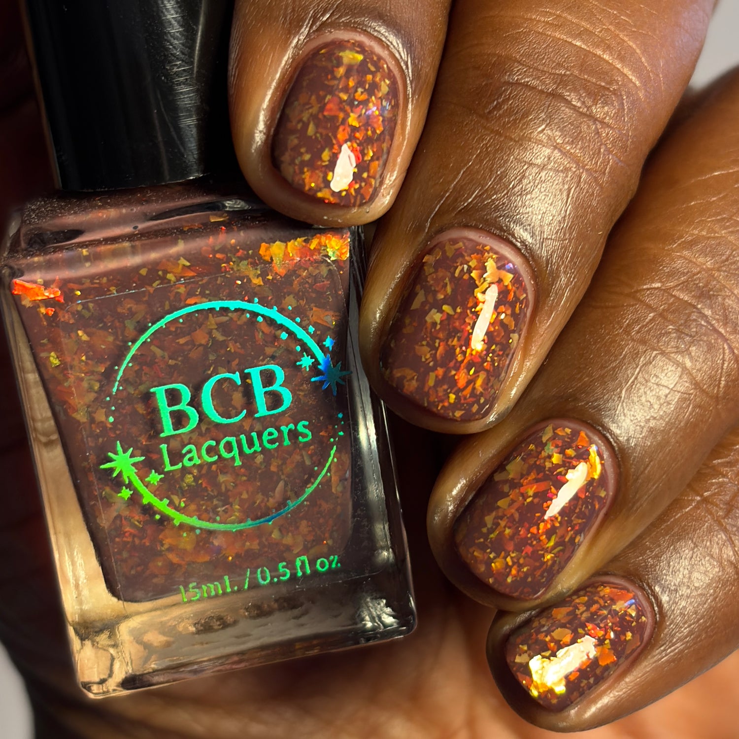 Po-Ta-Toes! Boil ‘em, Mash ‘em, Stick ‘em In A Stew!: A brown crelly with gold glass flakes and red/orange/gold glass flakes.