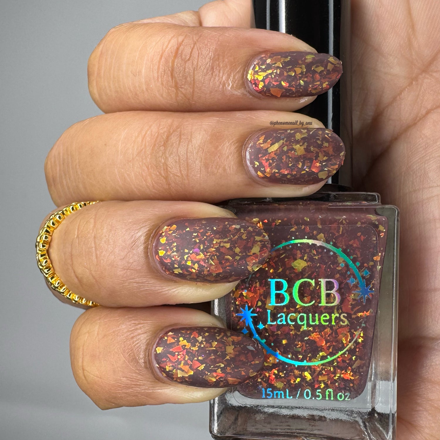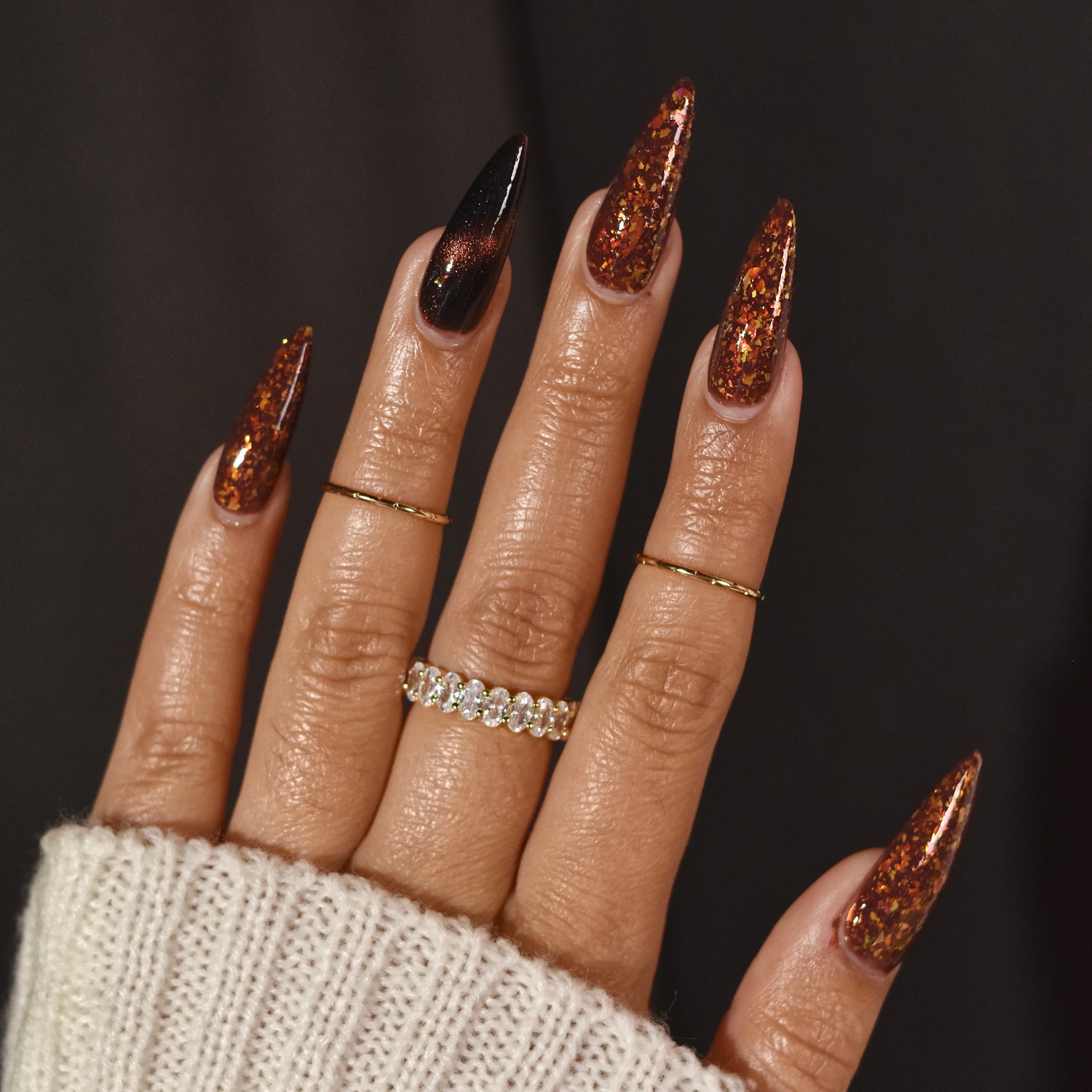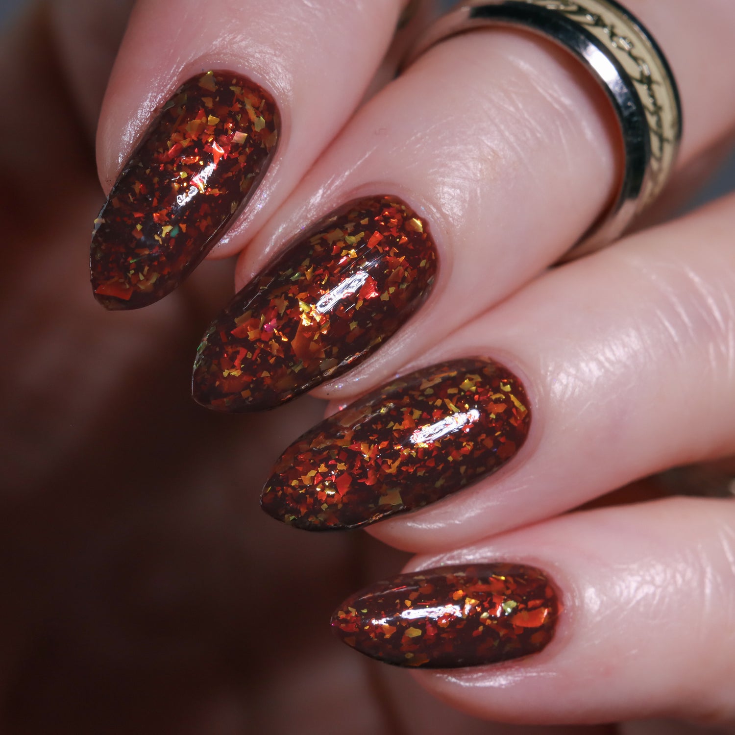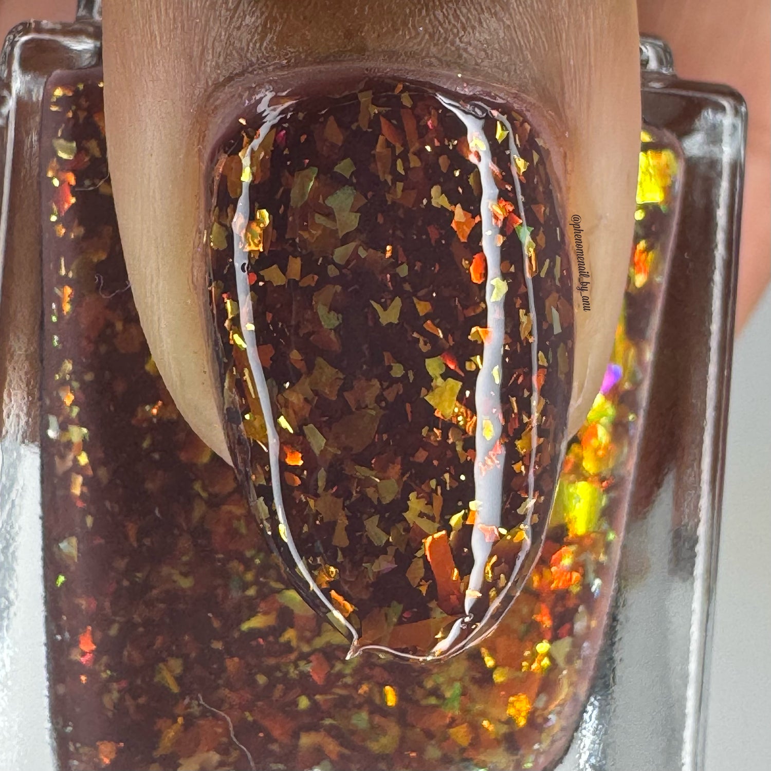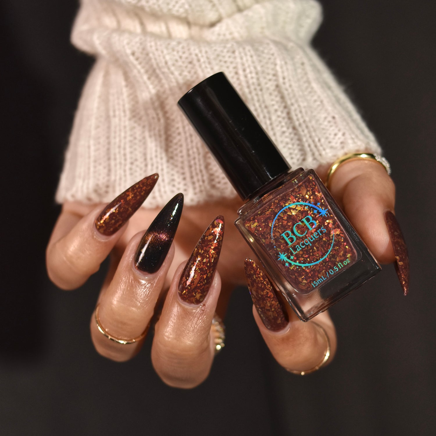Po-Ta-Toes! Boil ‘em, Mash ‘em, Stick ‘em In A Stew!: A brown crelly with gold glass flakes and red/orange/gold glass flakes.
