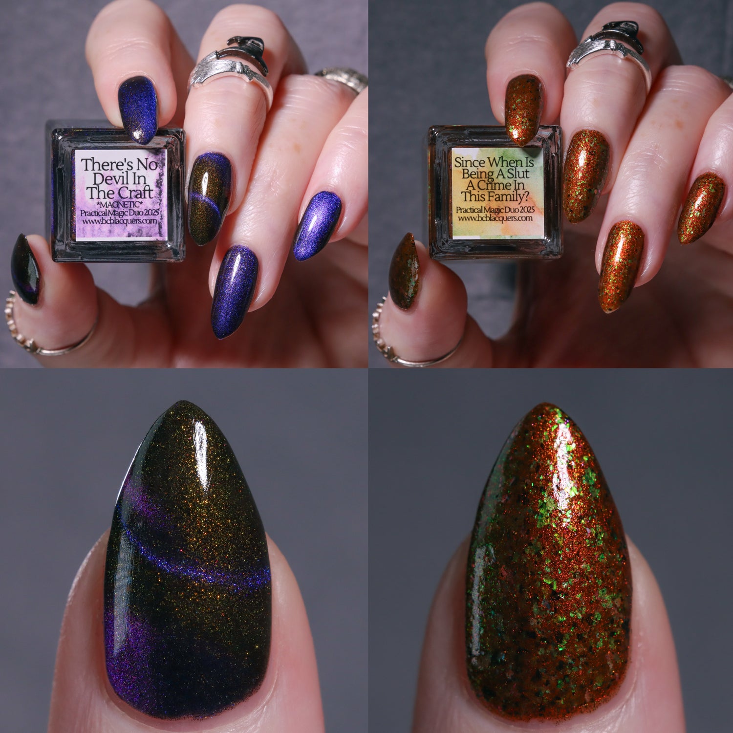 • There’s No Devil In The Craft - *MAGNETIC*: A black jelly base with a purple/blue multichrome pull and gold shifting shimmer.