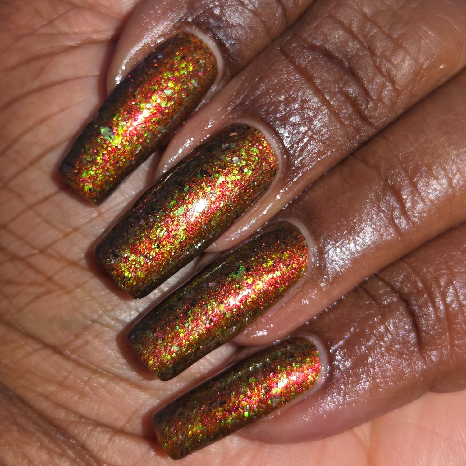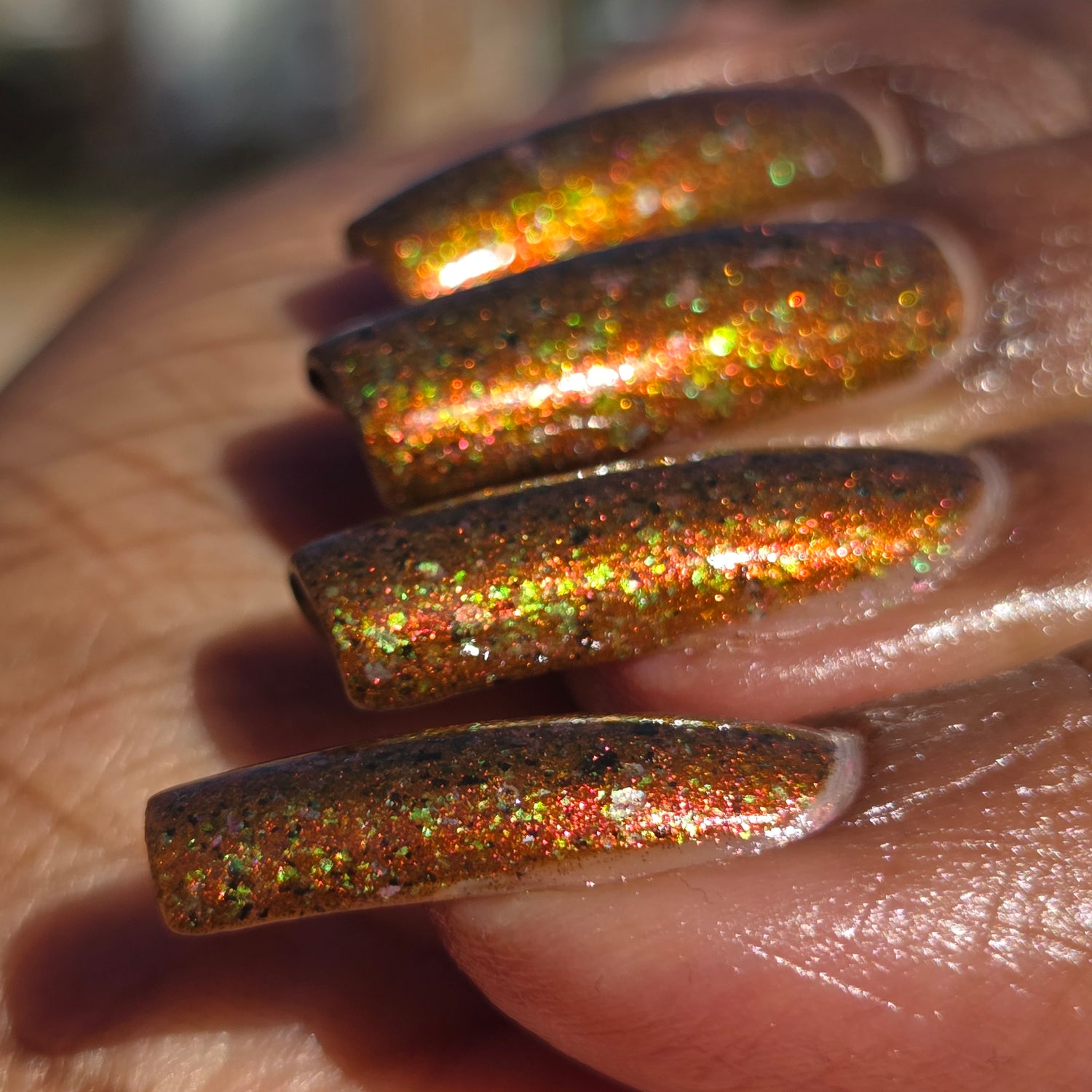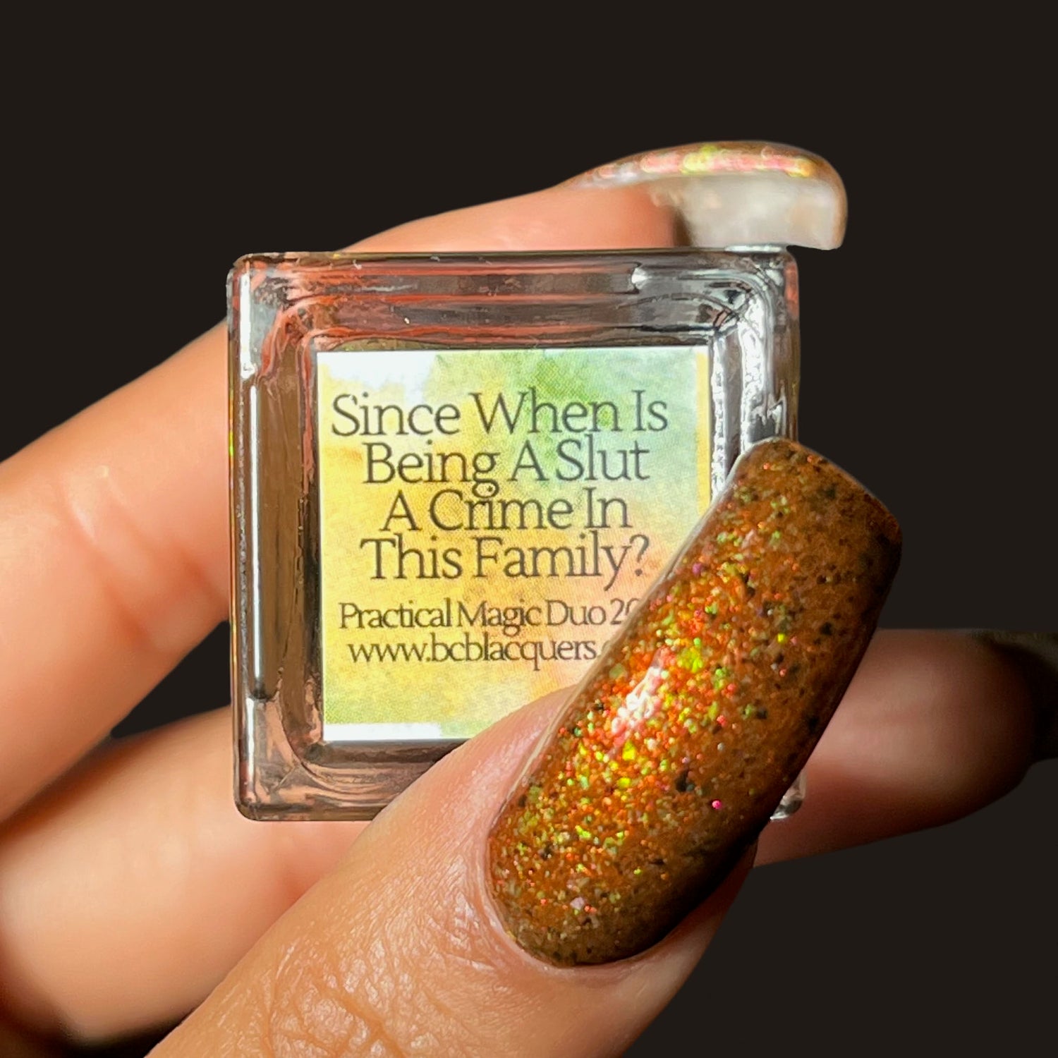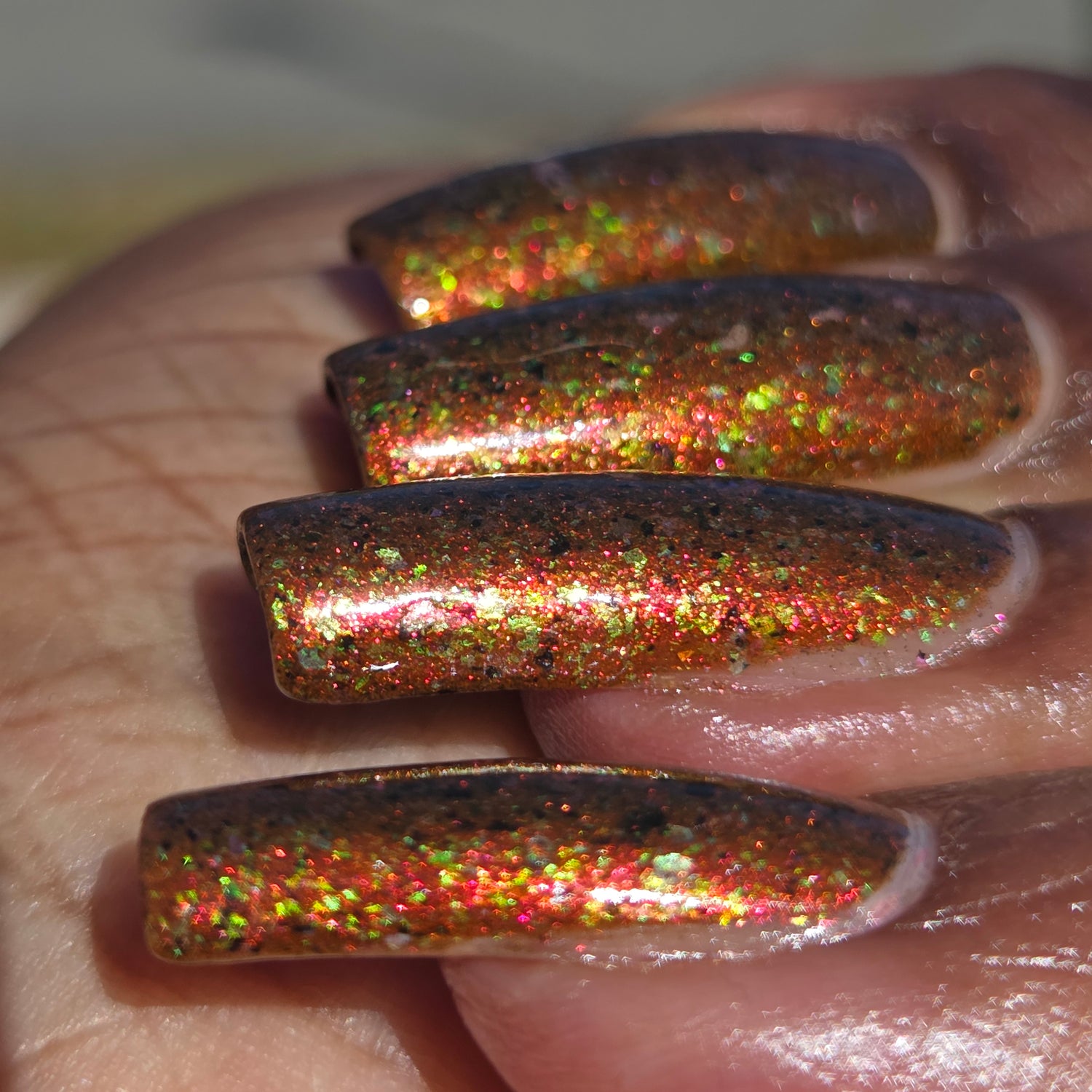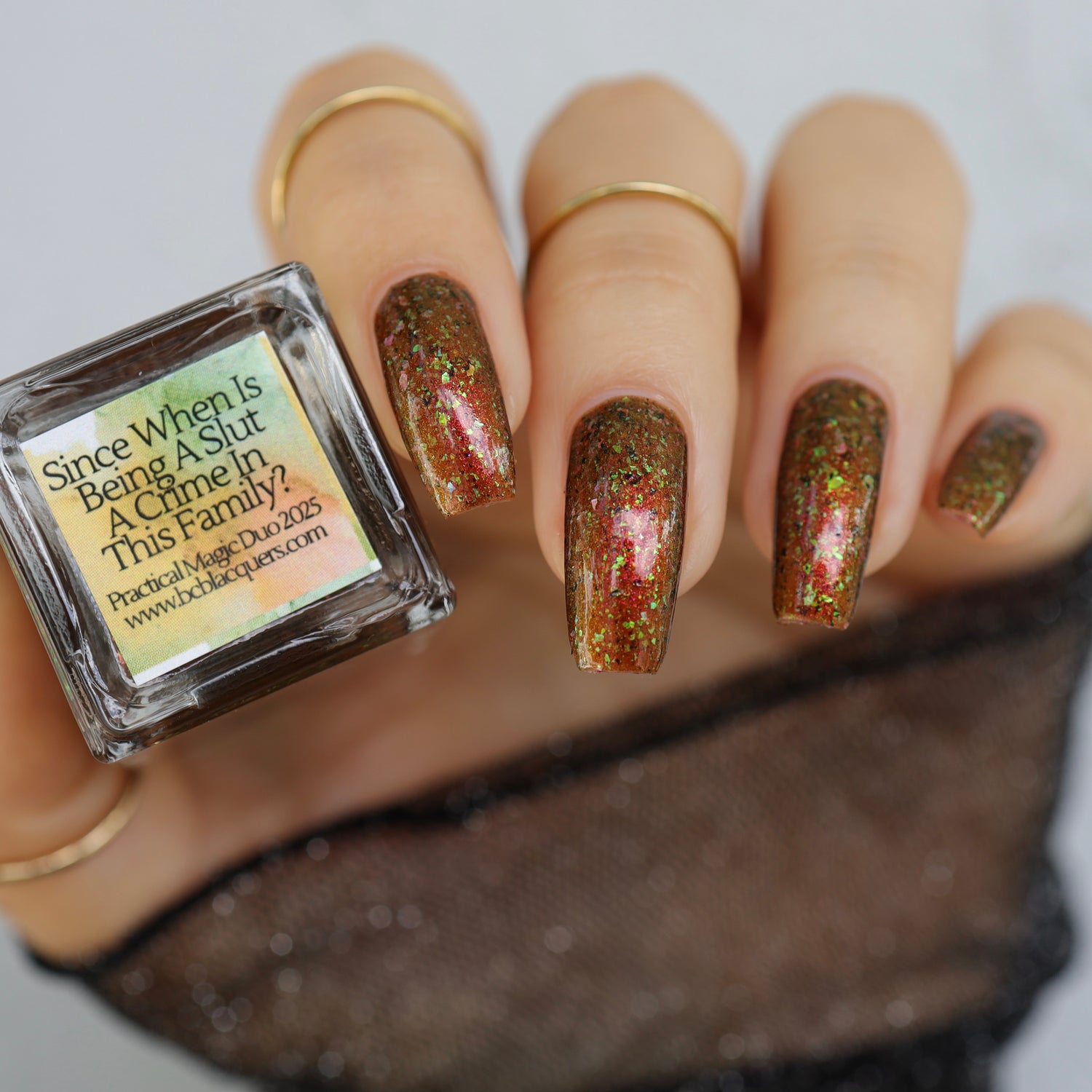 Since When Is Being A Slut A Crime In This Family?: A burnt orange jelly with red/orange/green multichromes shimmer, green/blue/pink iridescent flakes and black flakes.