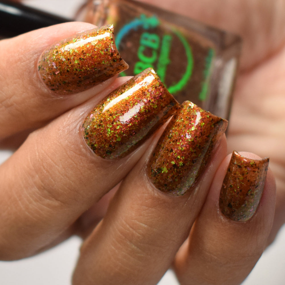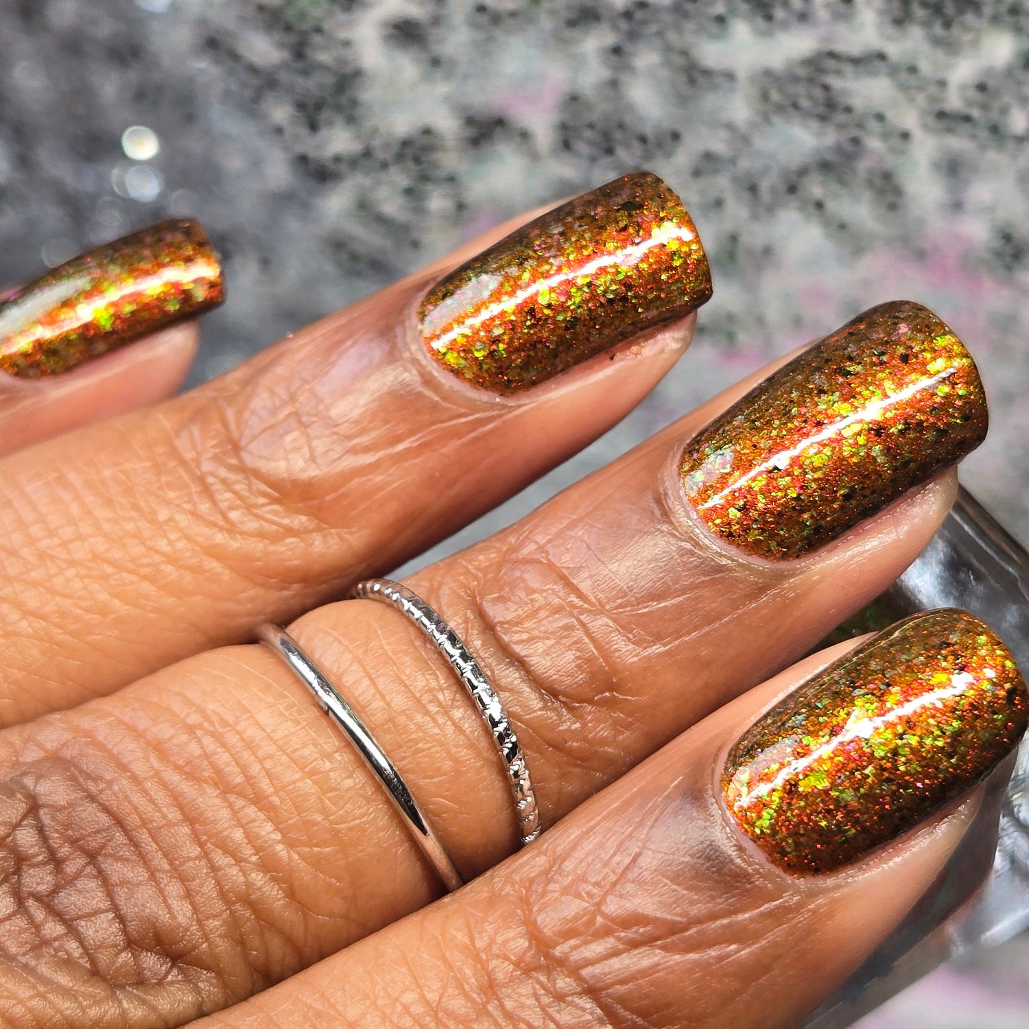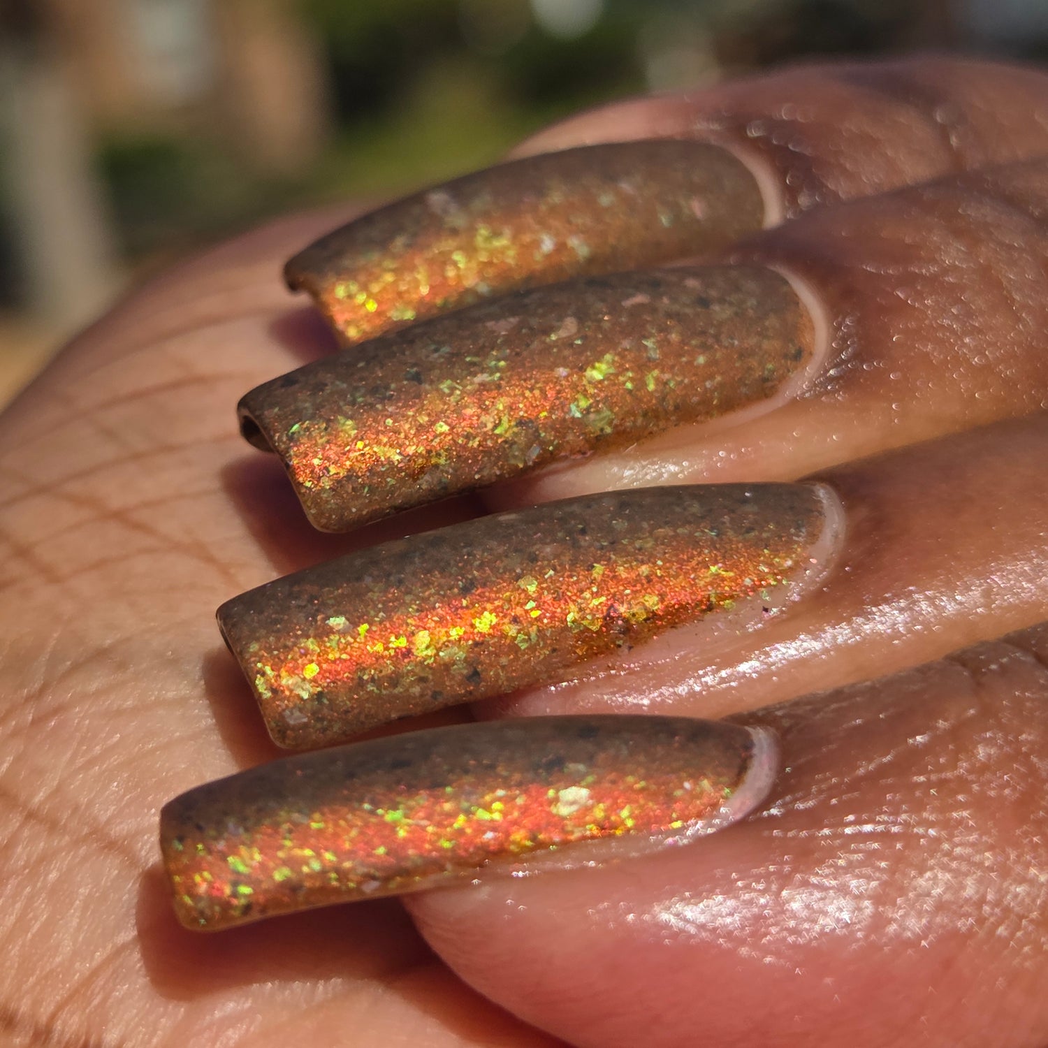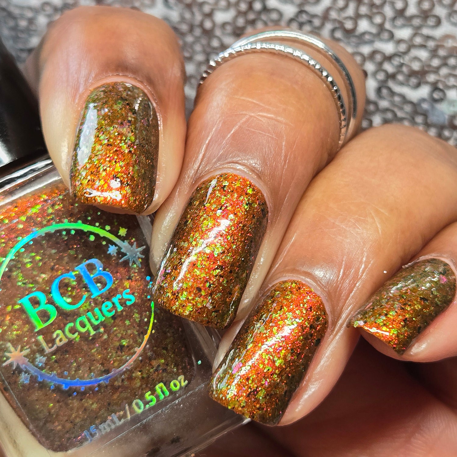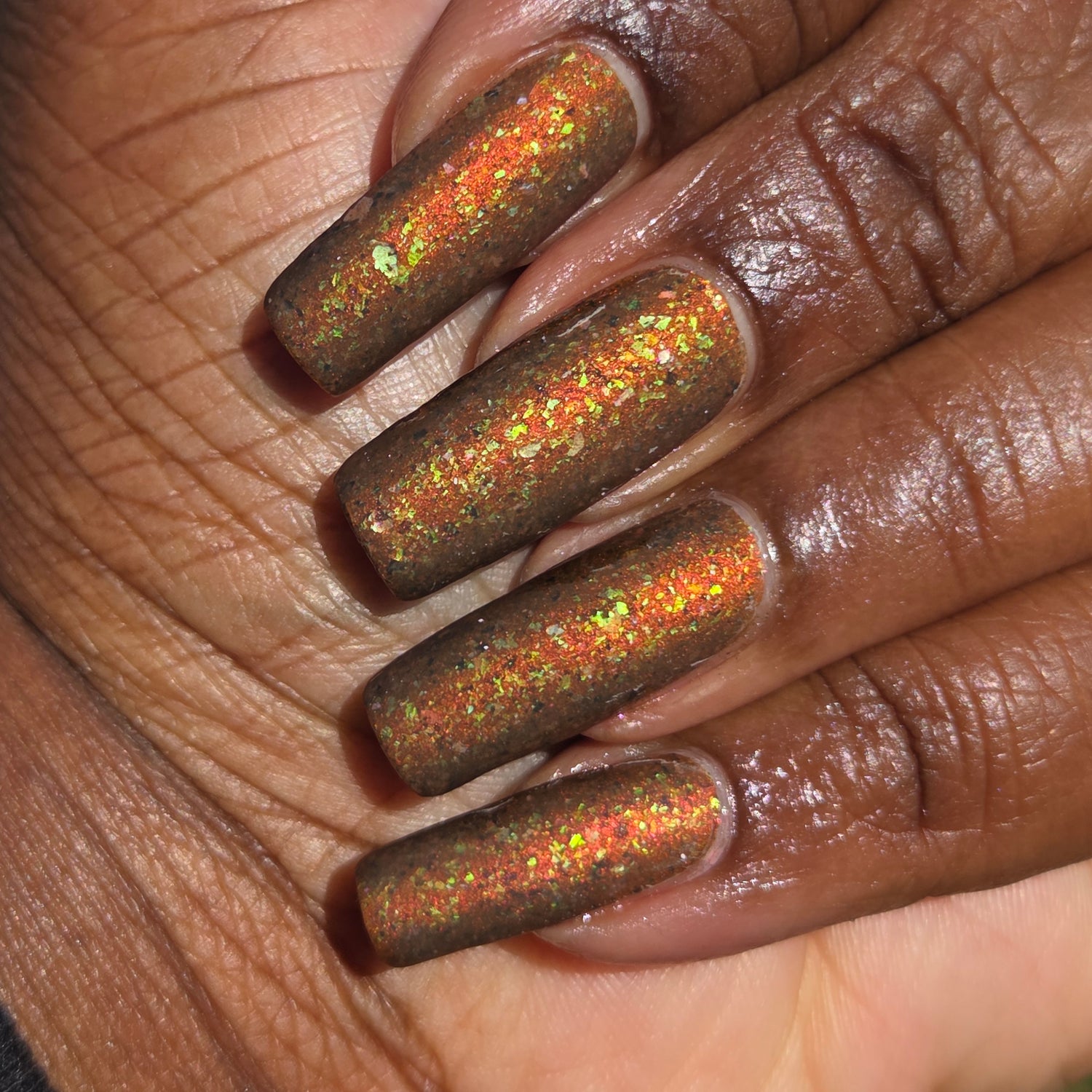 Since When Is Being A Slut A Crime In This Family?: A burnt orange jelly with red/orange/green multichromes shimmer, green/blue/pink iridescent flakes and black flakes.