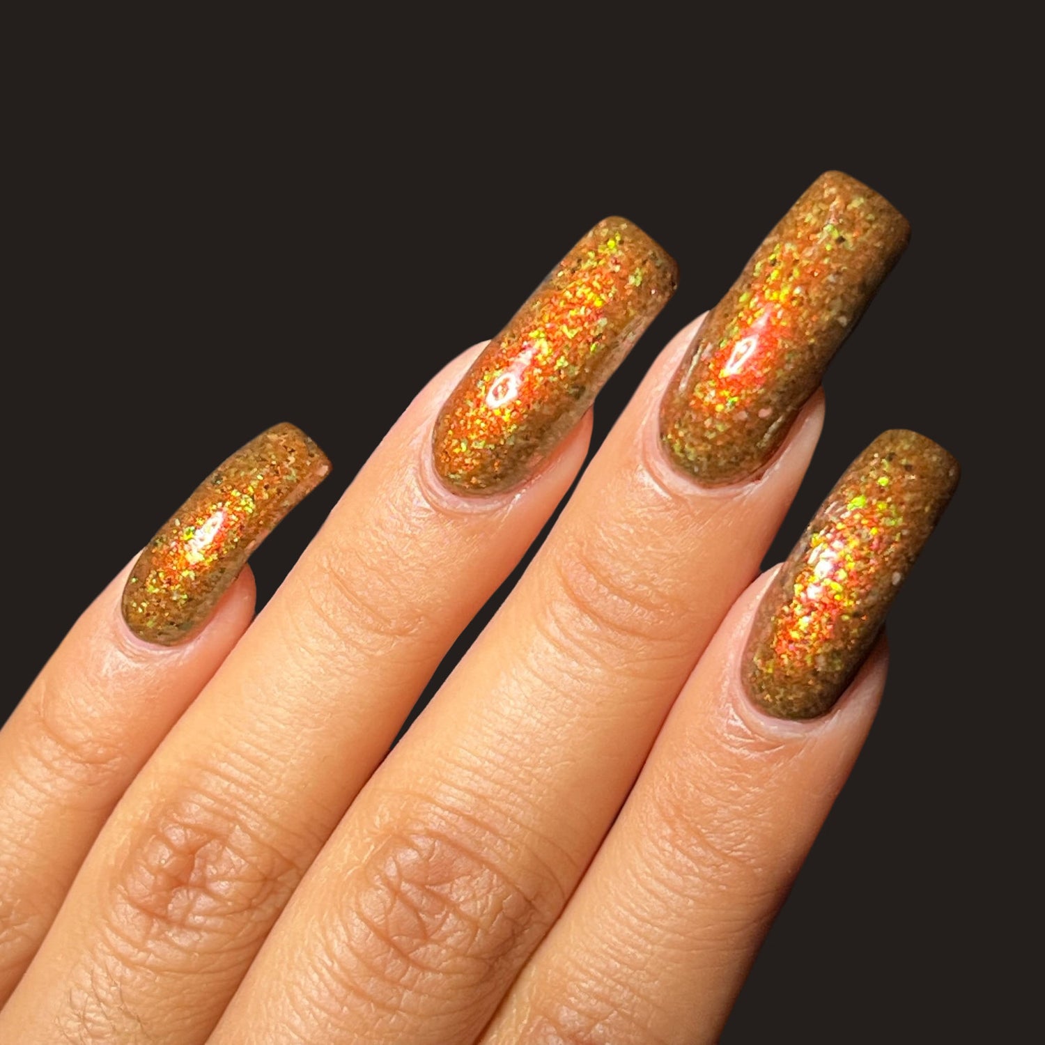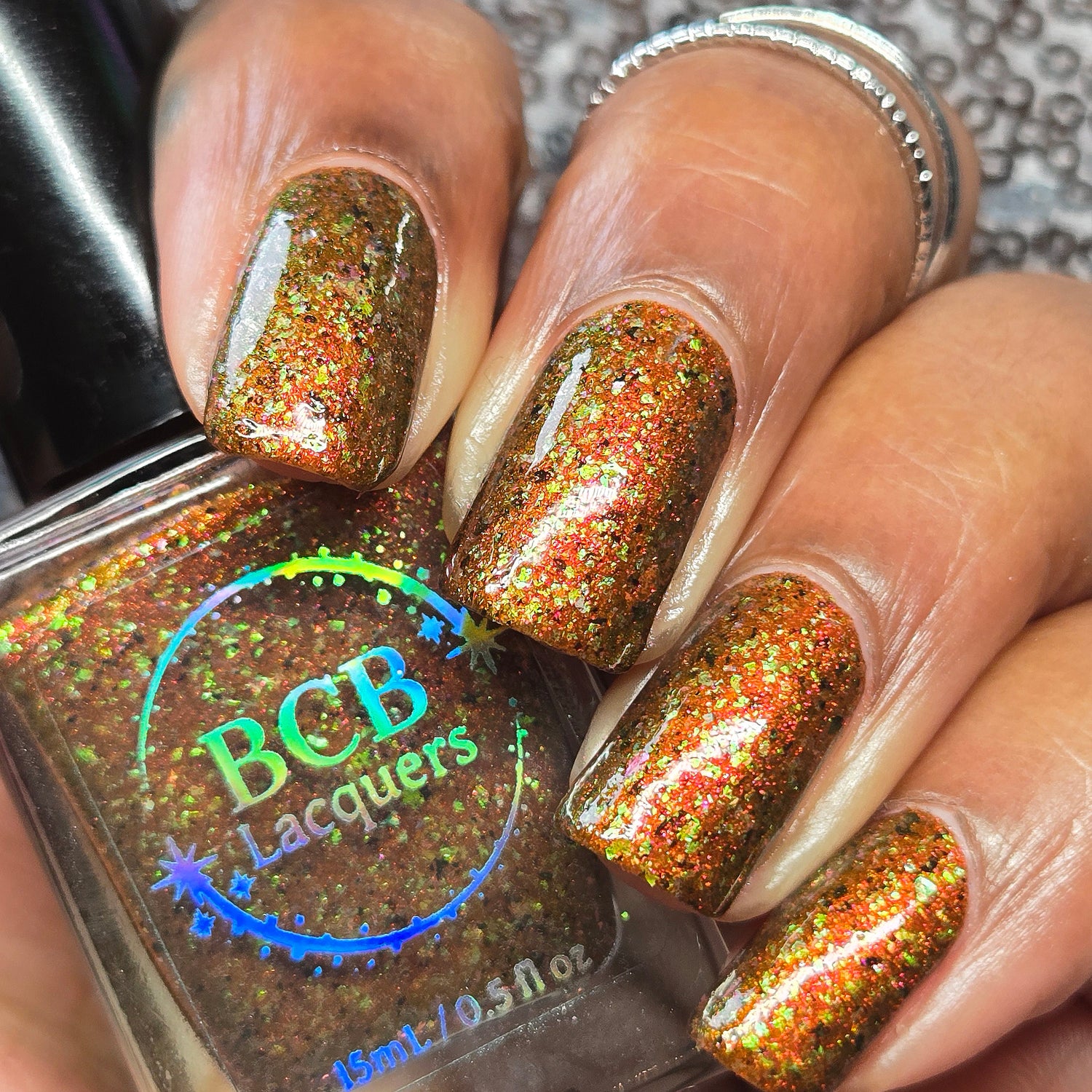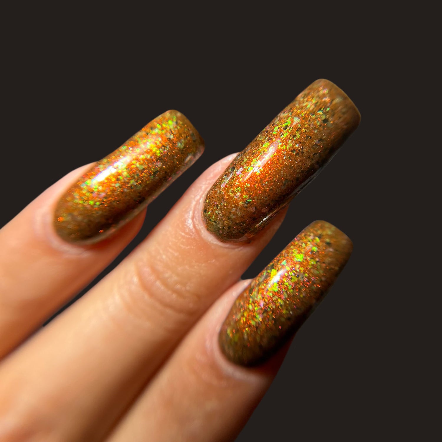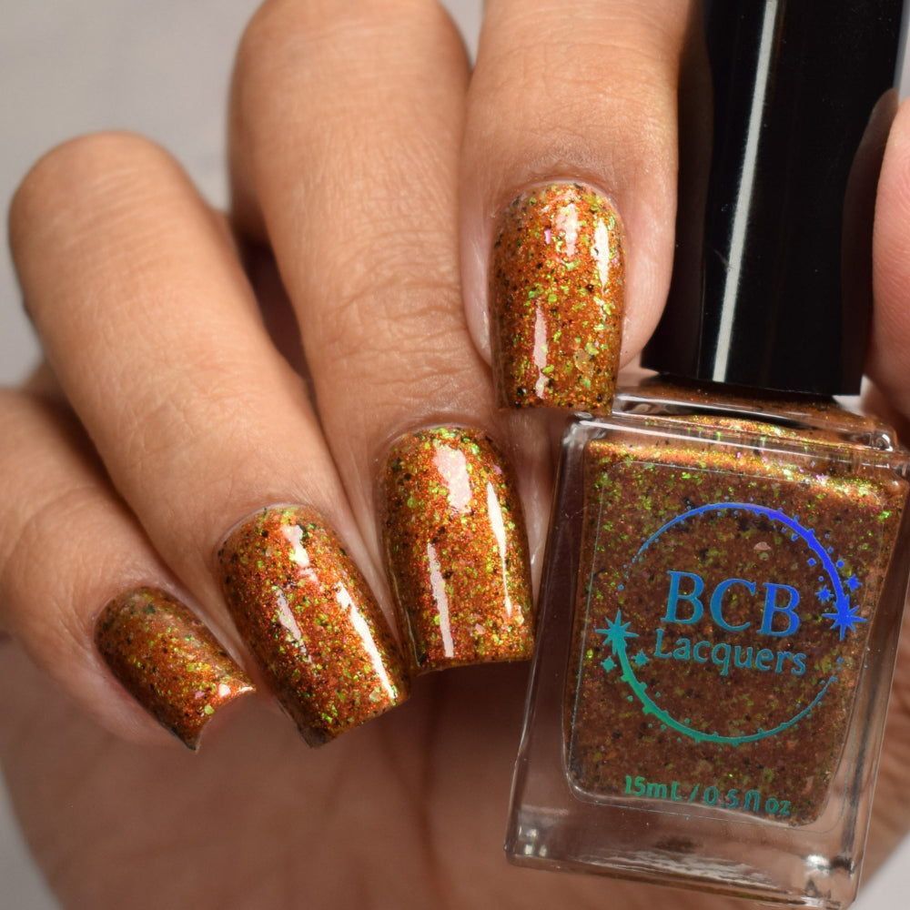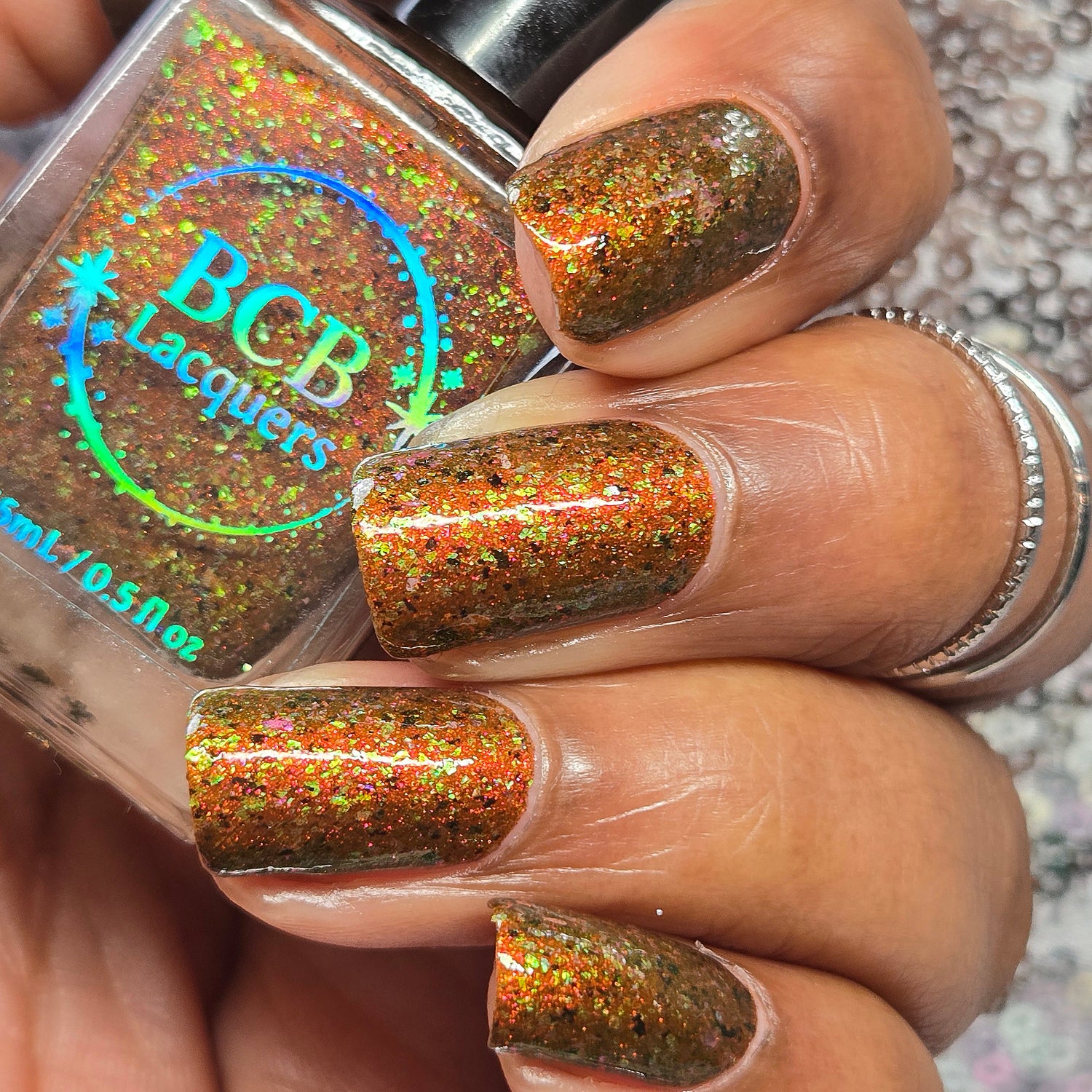 Since When Is Being A Slut A Crime In This Family?: A burnt orange jelly with red/orange/green multichromes shimmer, green/blue/pink iridescent flakes and black flakes.