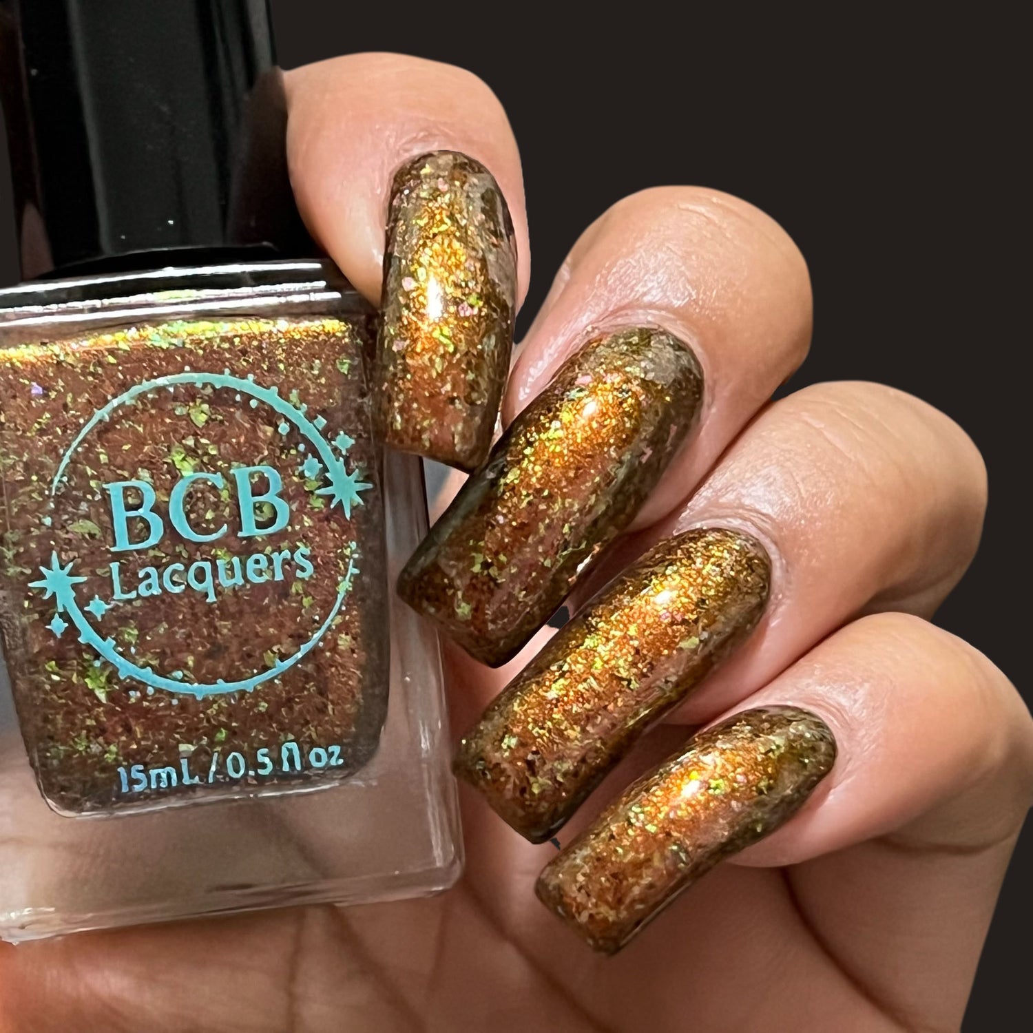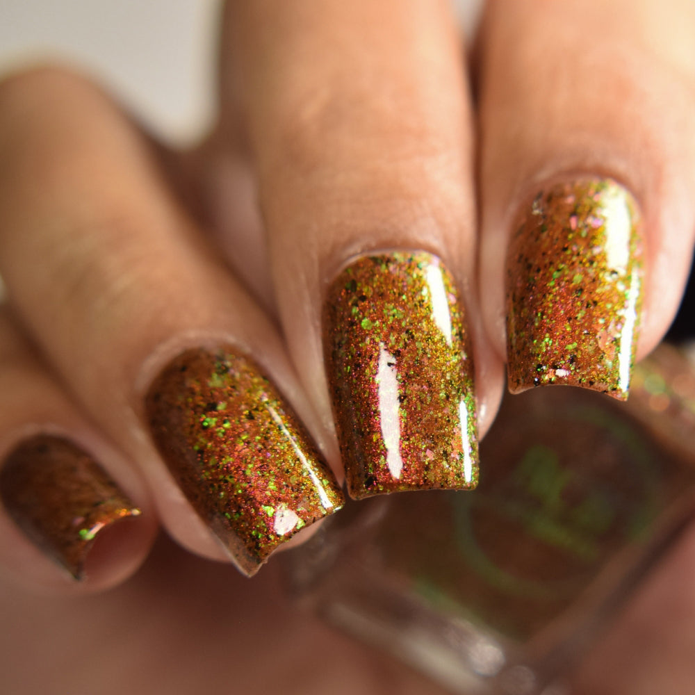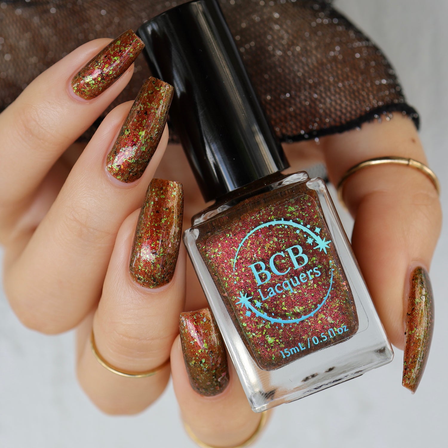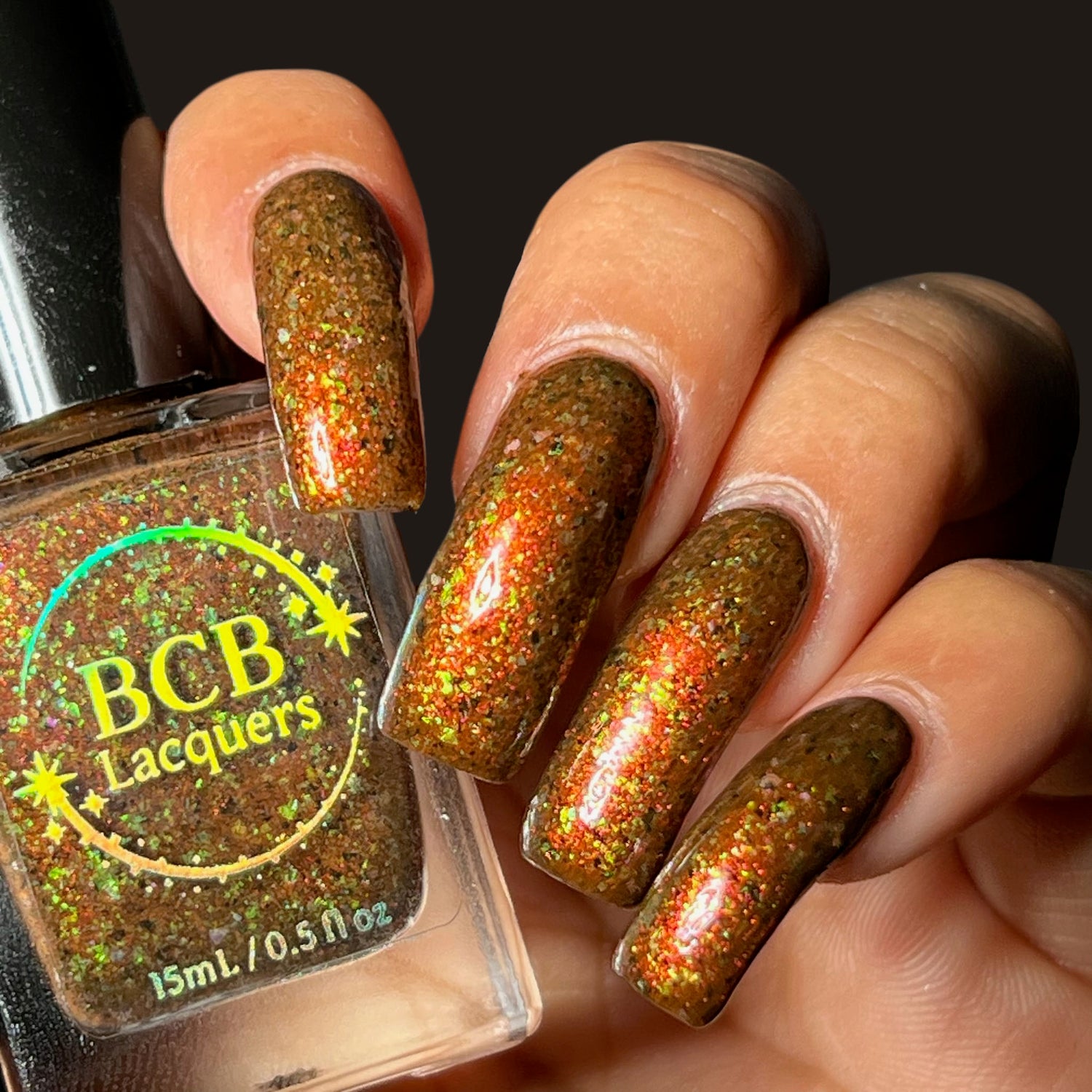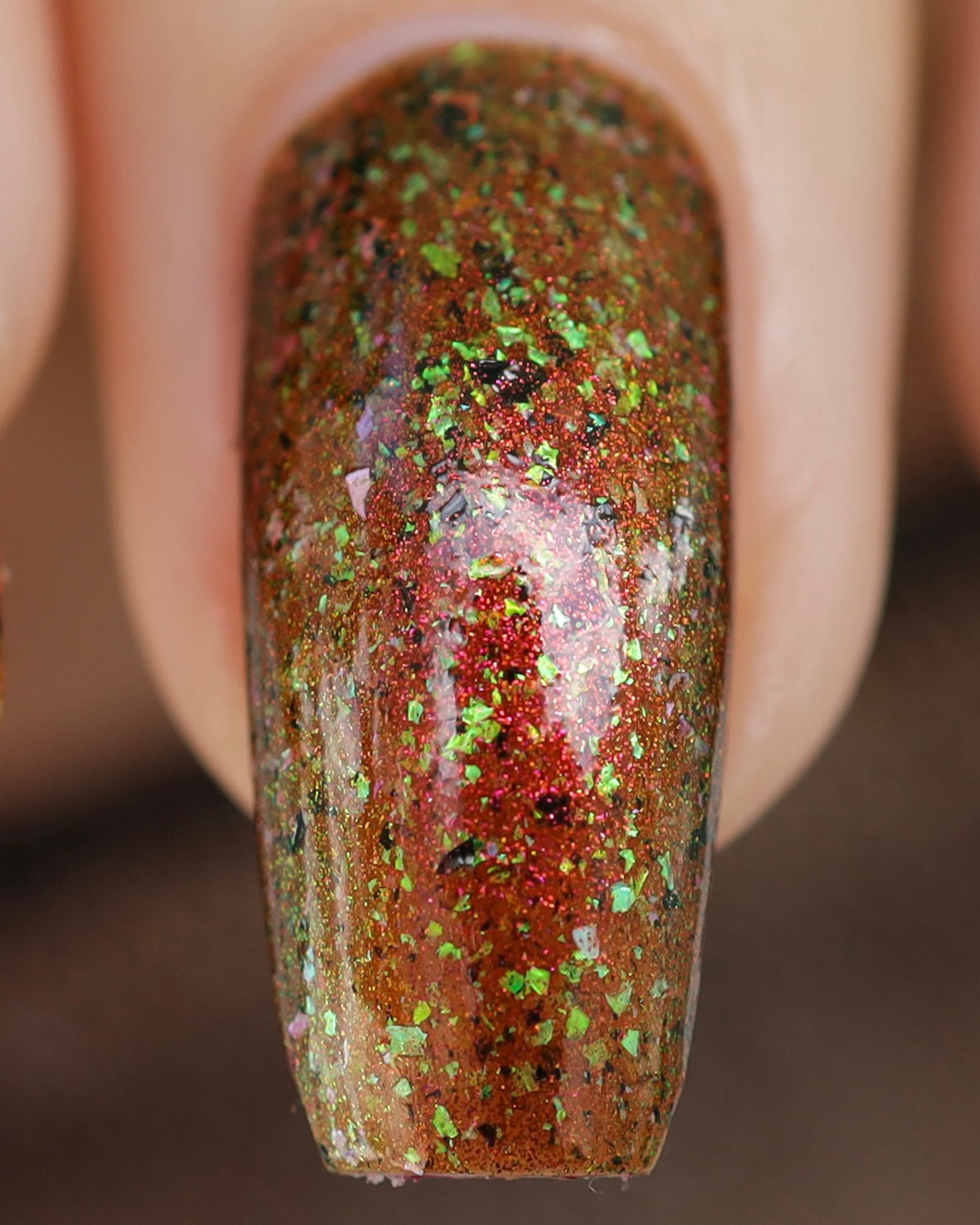 Since When Is Being A Slut A Crime In This Family?: A burnt orange jelly with red/orange/green multichromes shimmer, green/blue/pink iridescent flakes and black flakes.