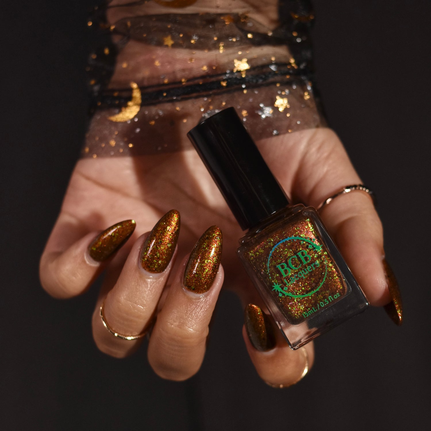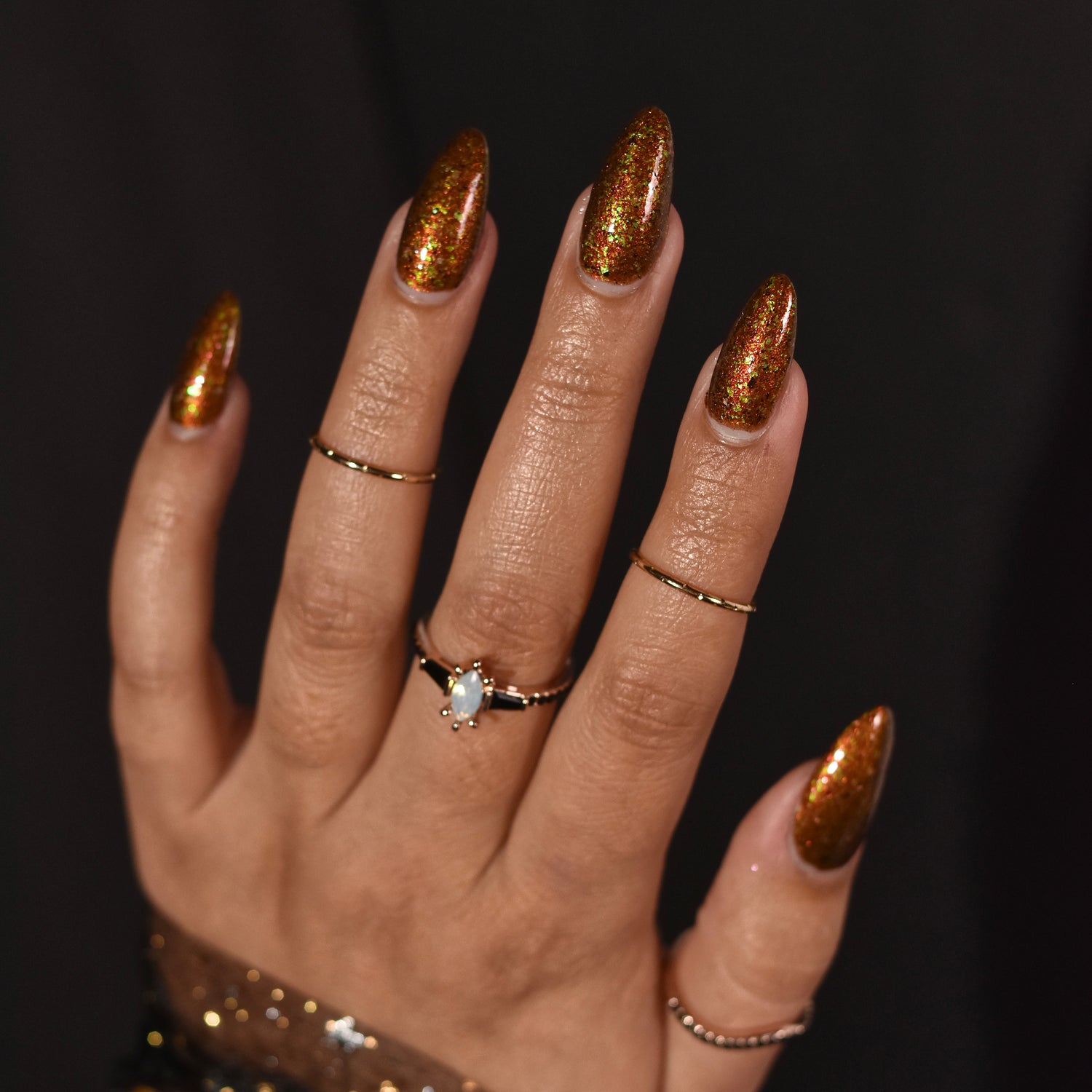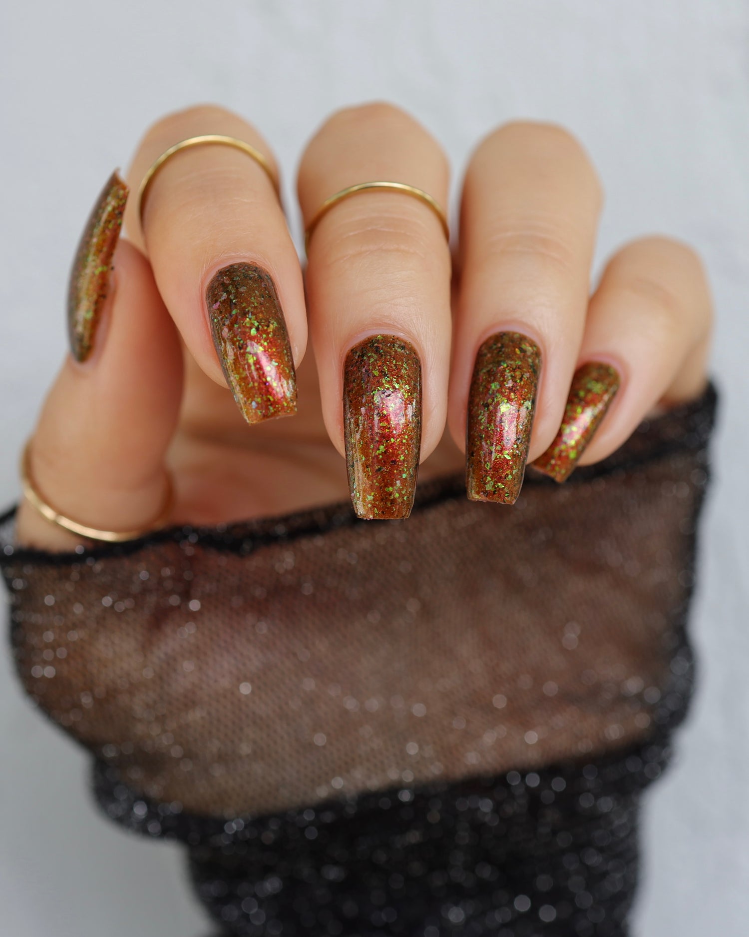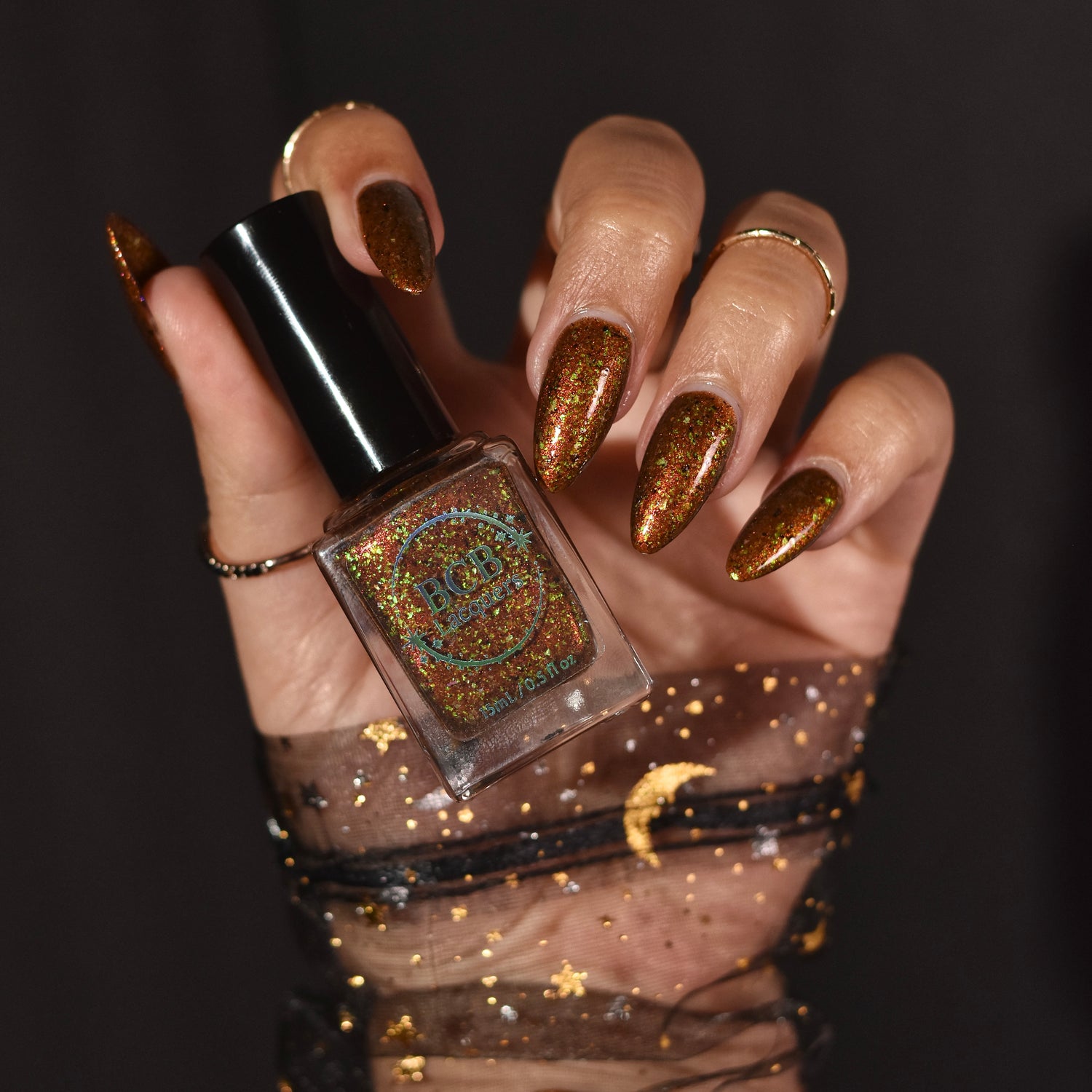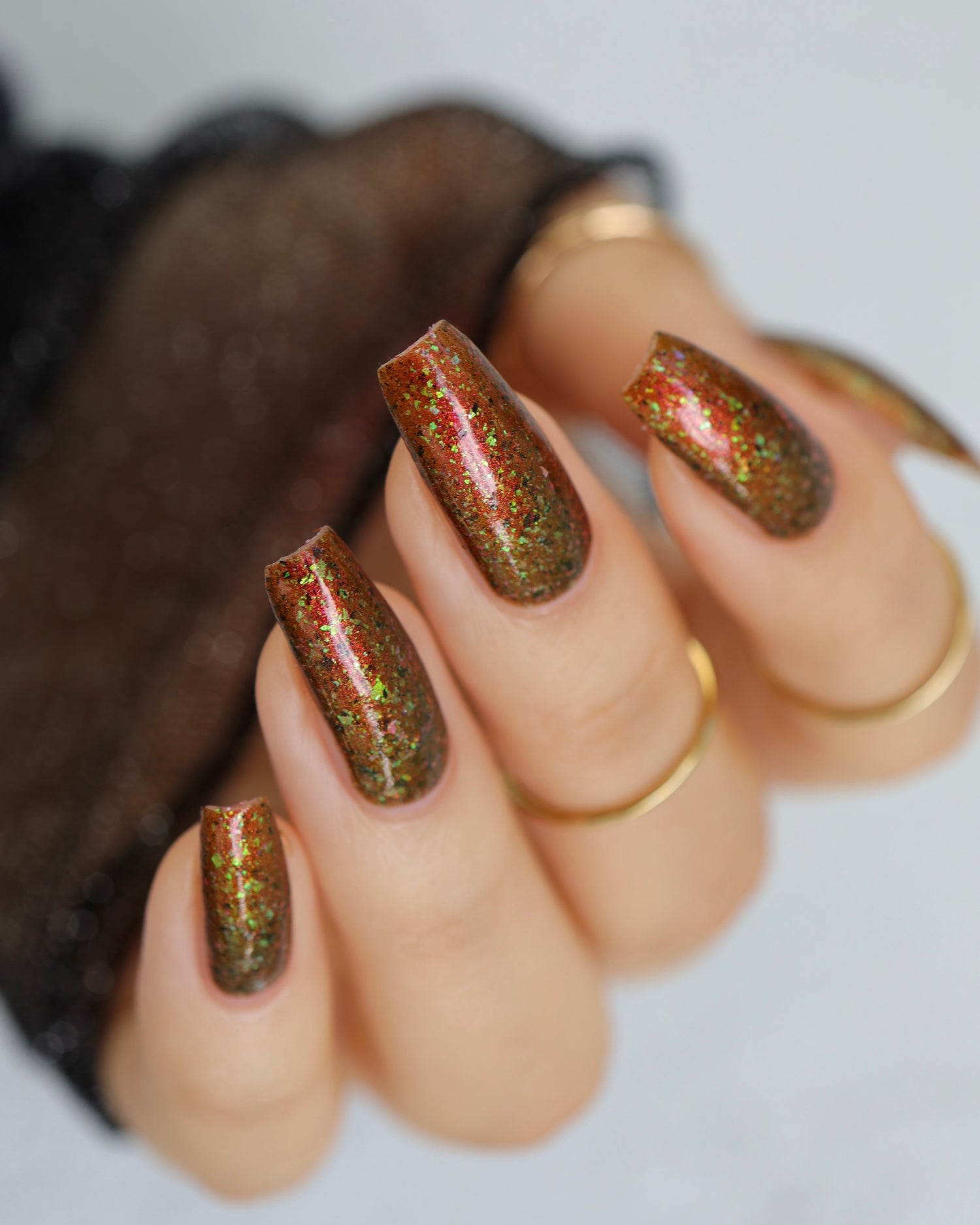 Since When Is Being A Slut A Crime In This Family?: A burnt orange jelly with red/orange/green multichromes shimmer, green/blue/pink iridescent flakes and black flakes.