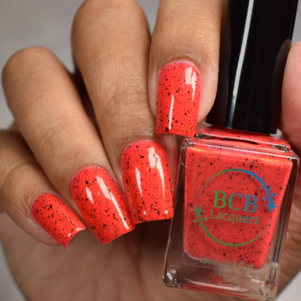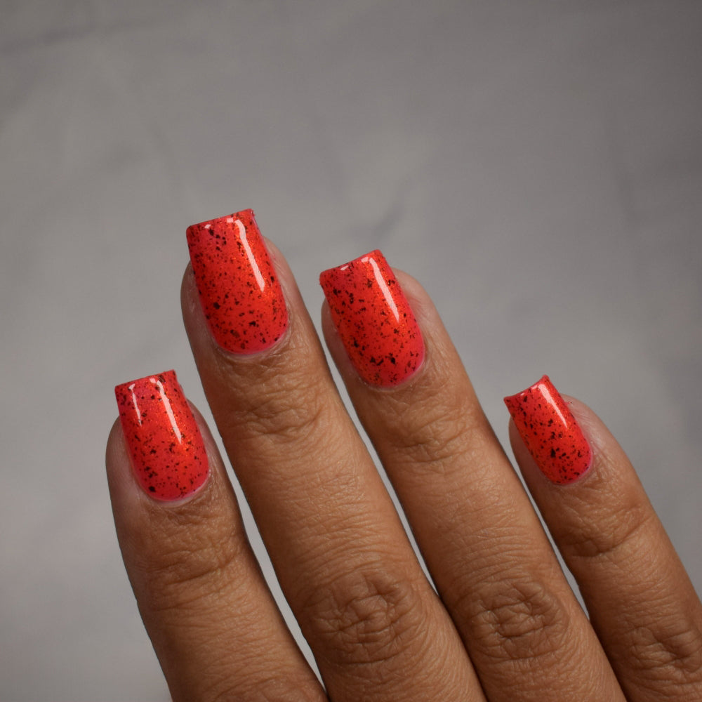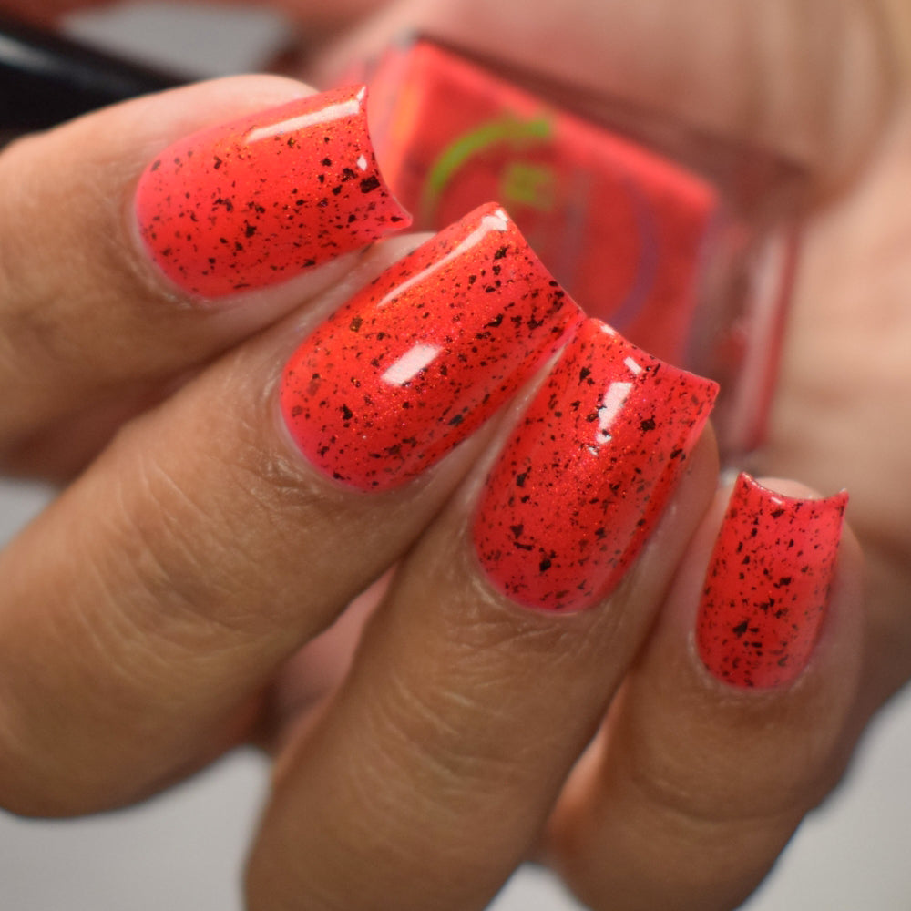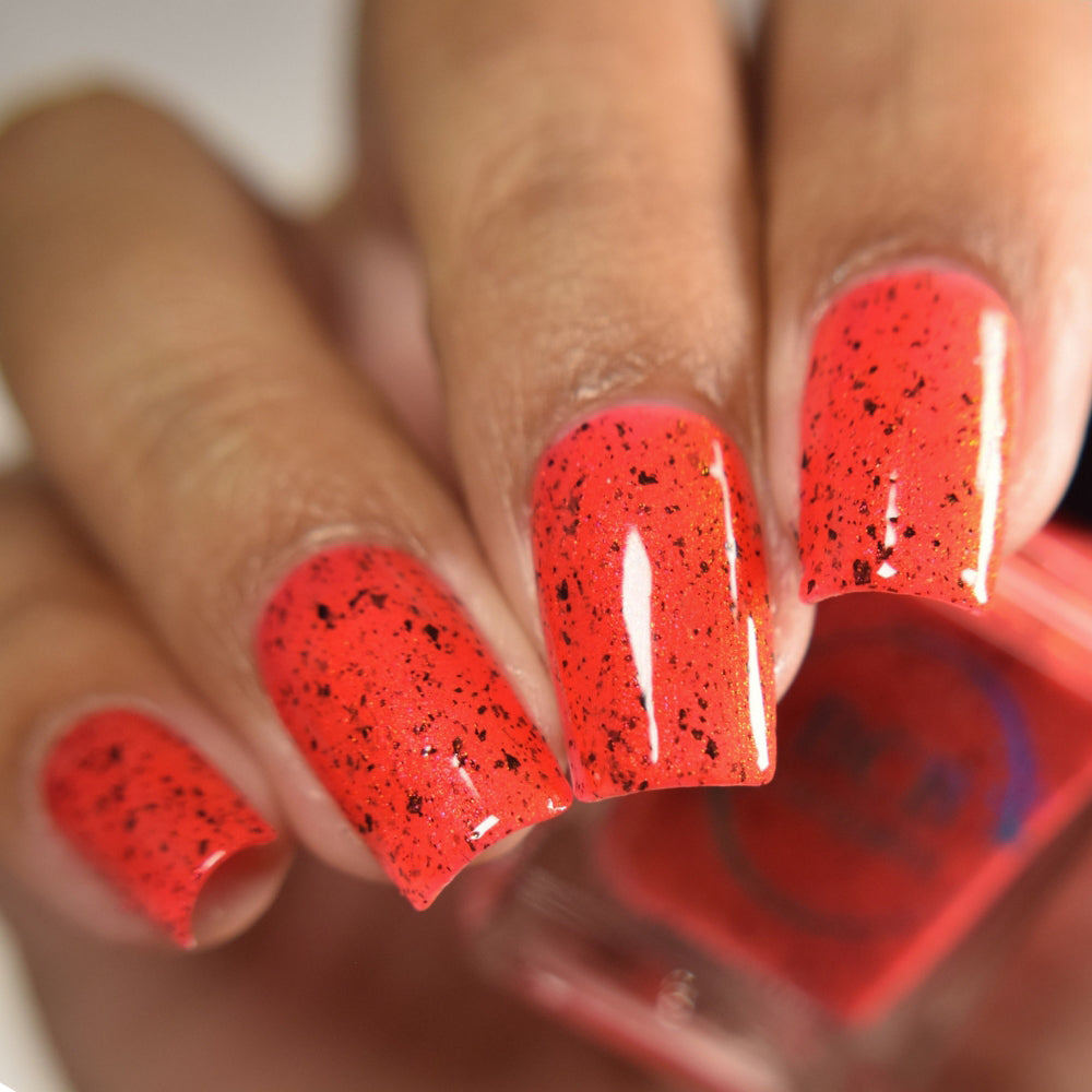 Snoggletart: A bright red neon crelly with an orange/gold/green shimmer and black flakes - black light reactive but not glow in the dark.