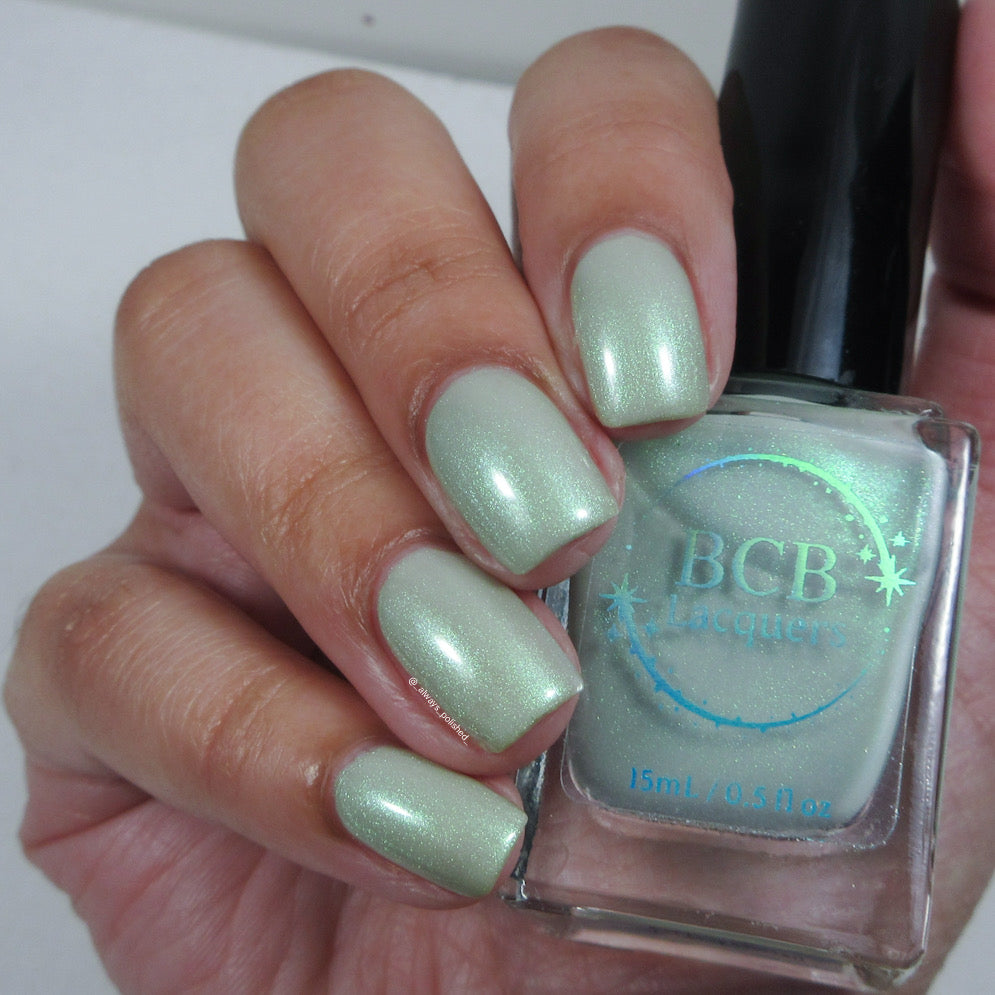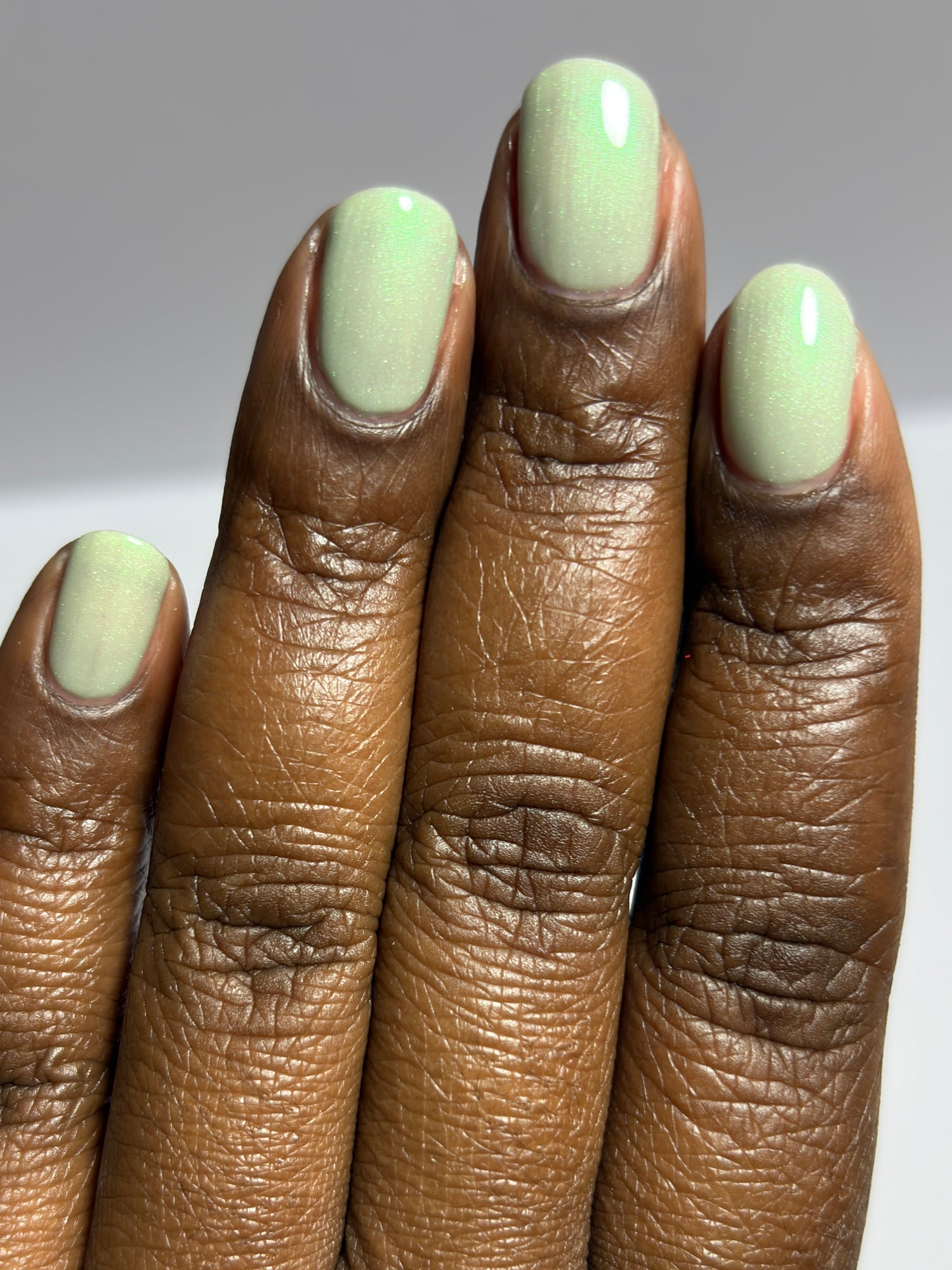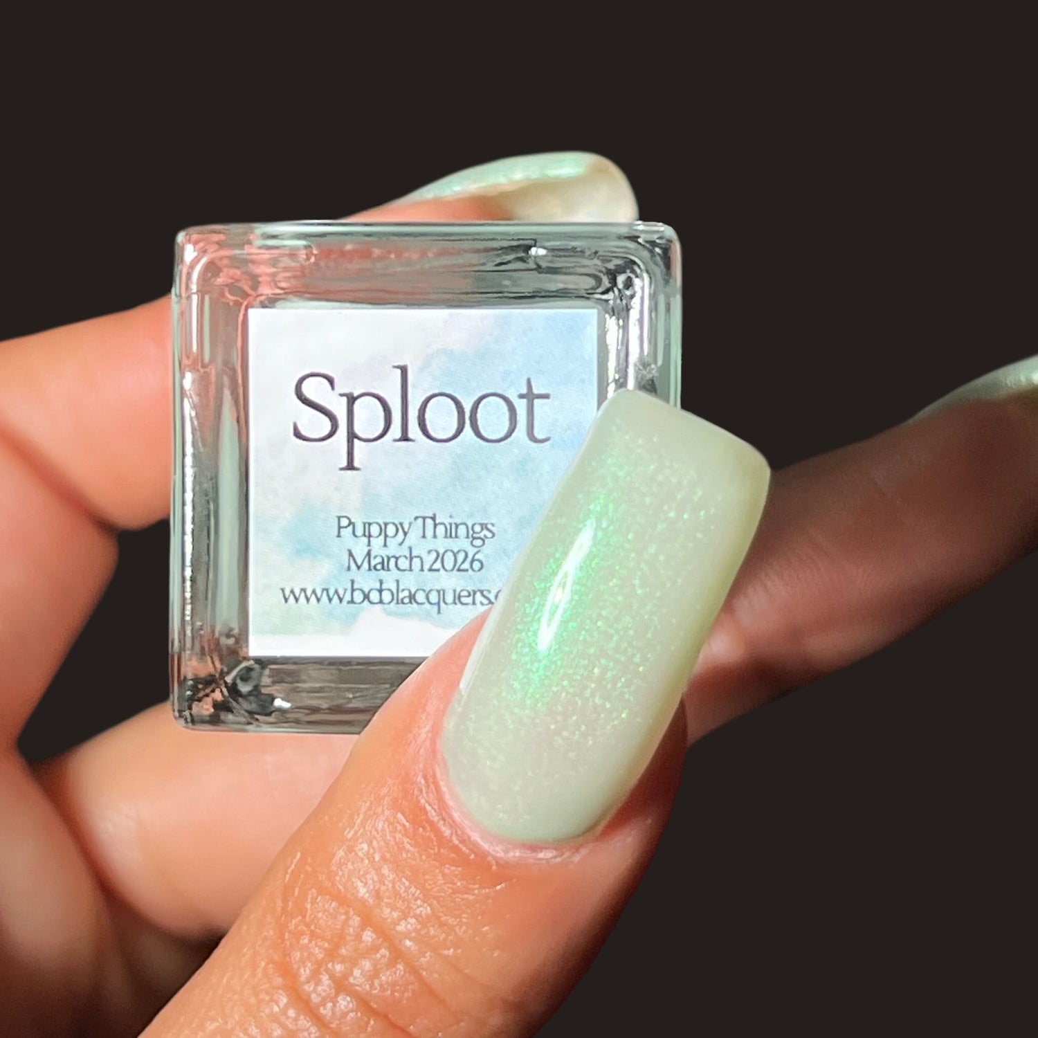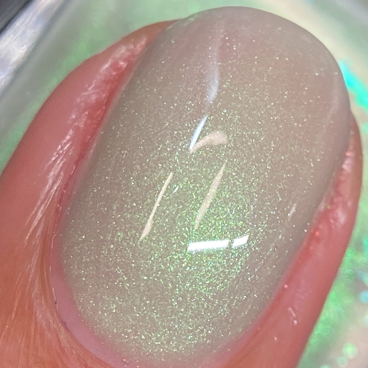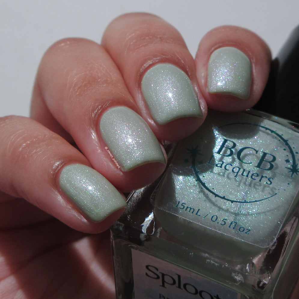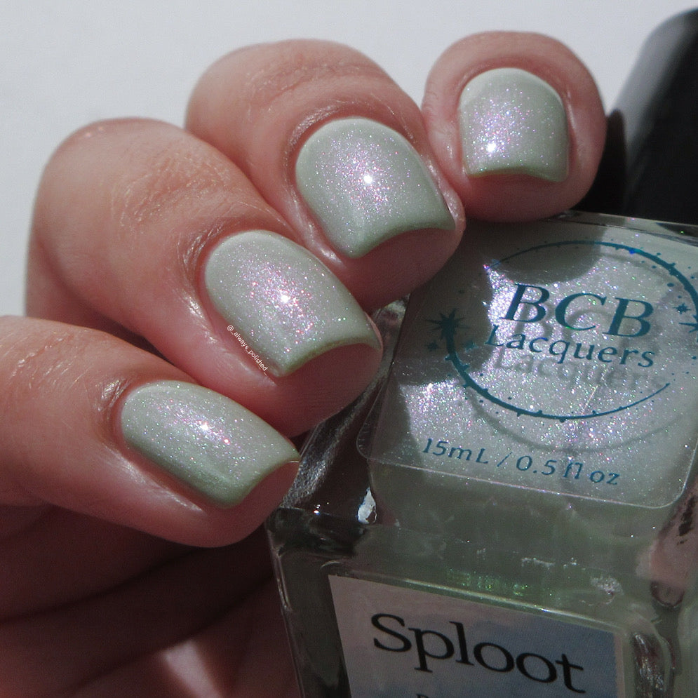 Sploot: A bright light sage crelly with a strong green/pink/purple shifting shimmer.
