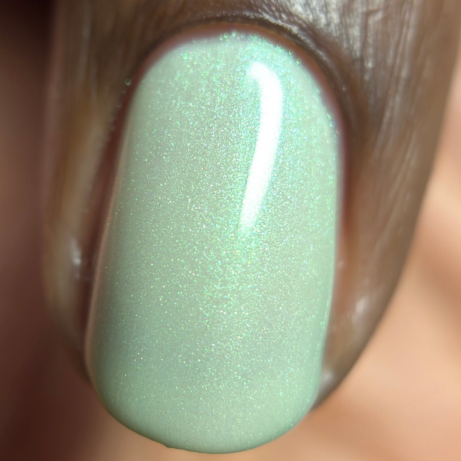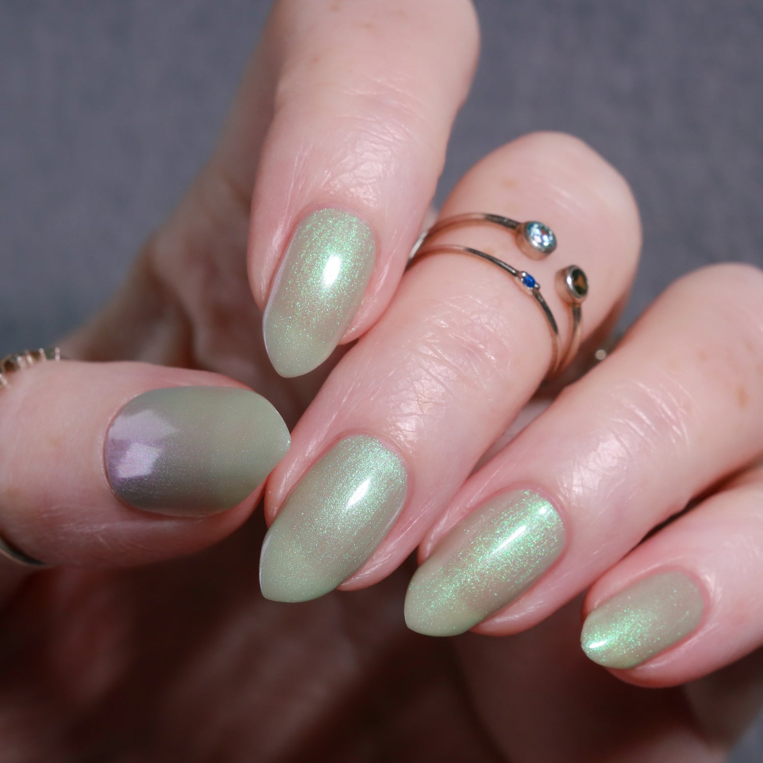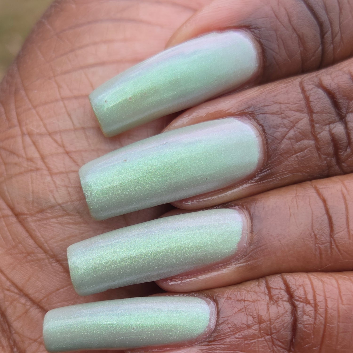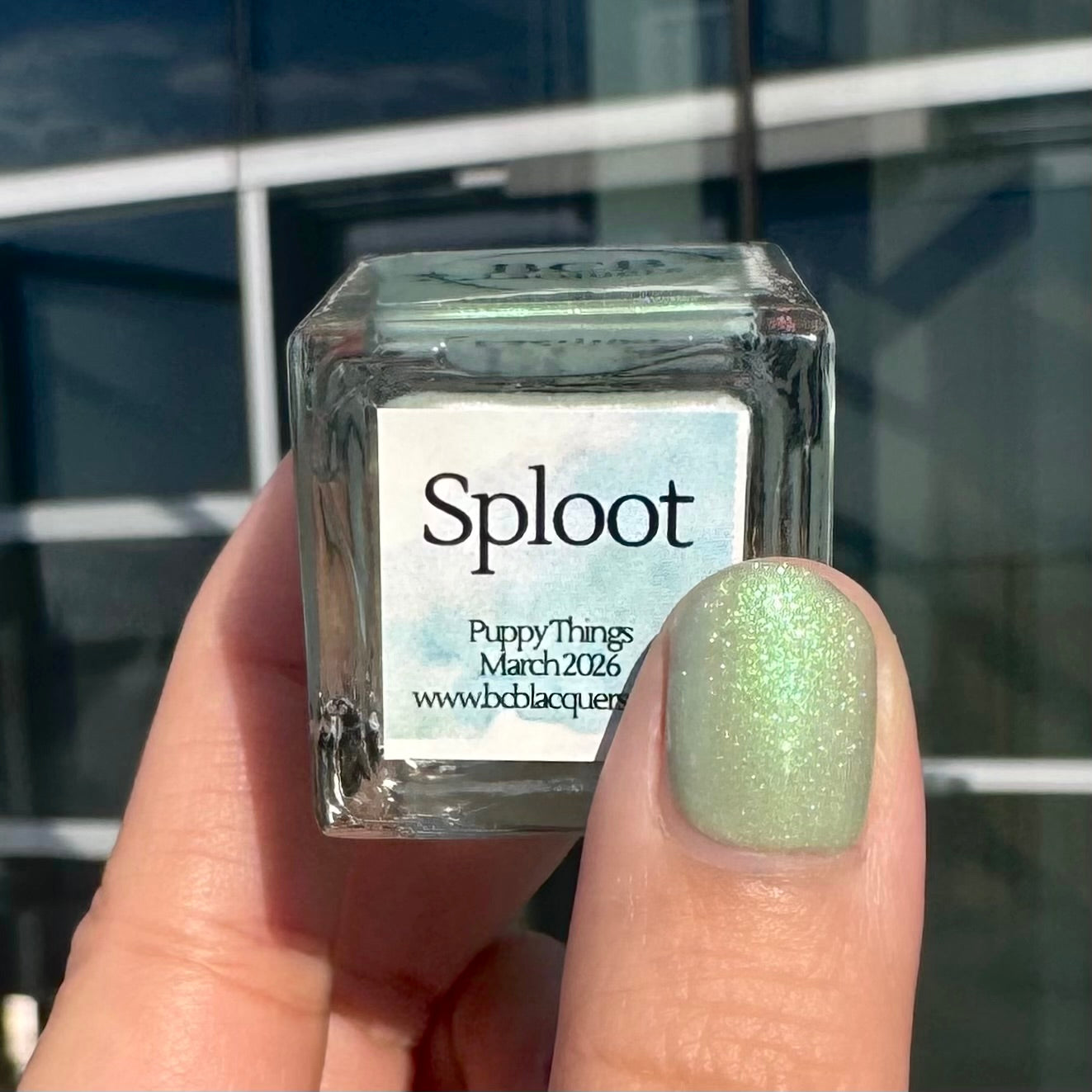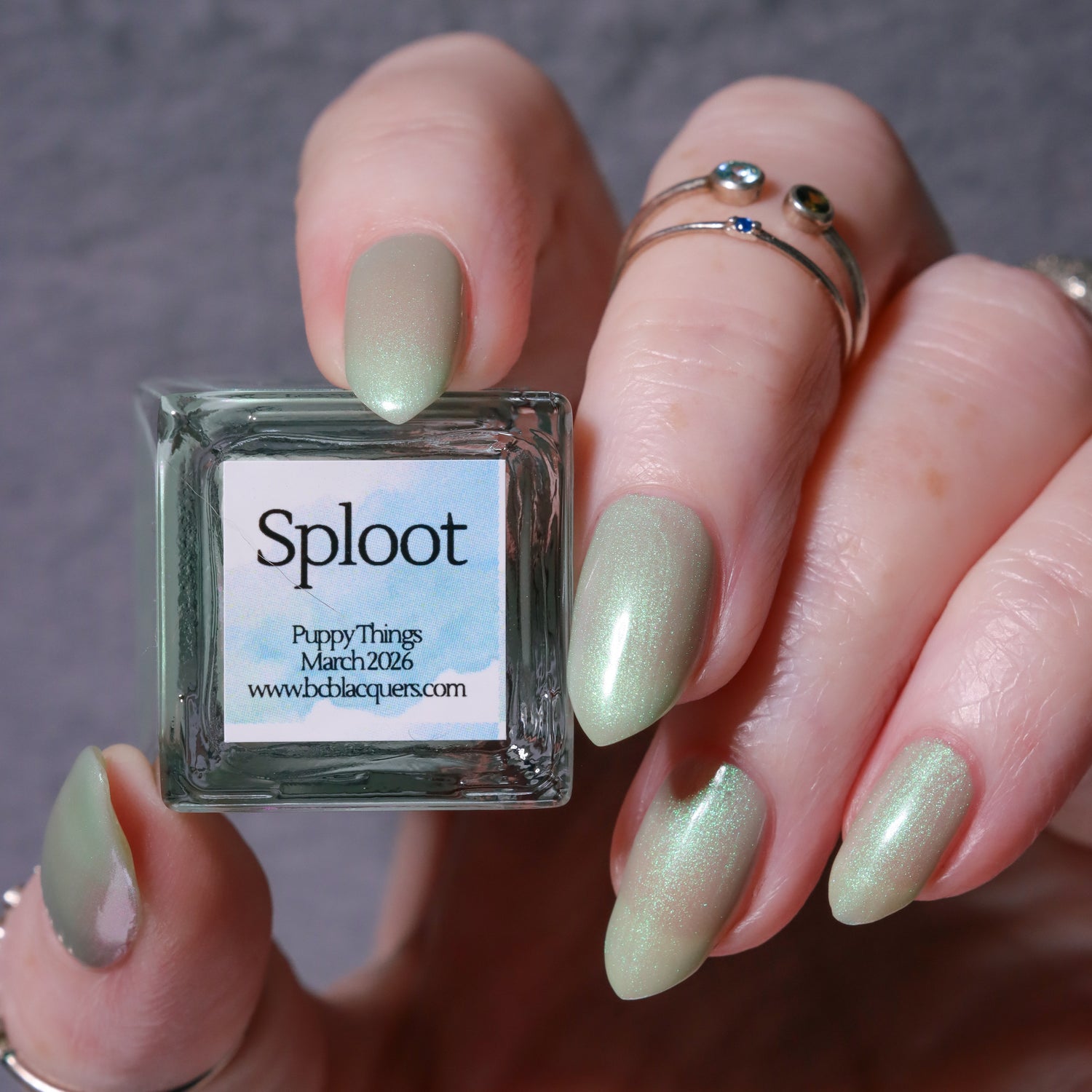 Sploot: A bright light sage crelly with a strong green/pink/purple shifting shimmer.