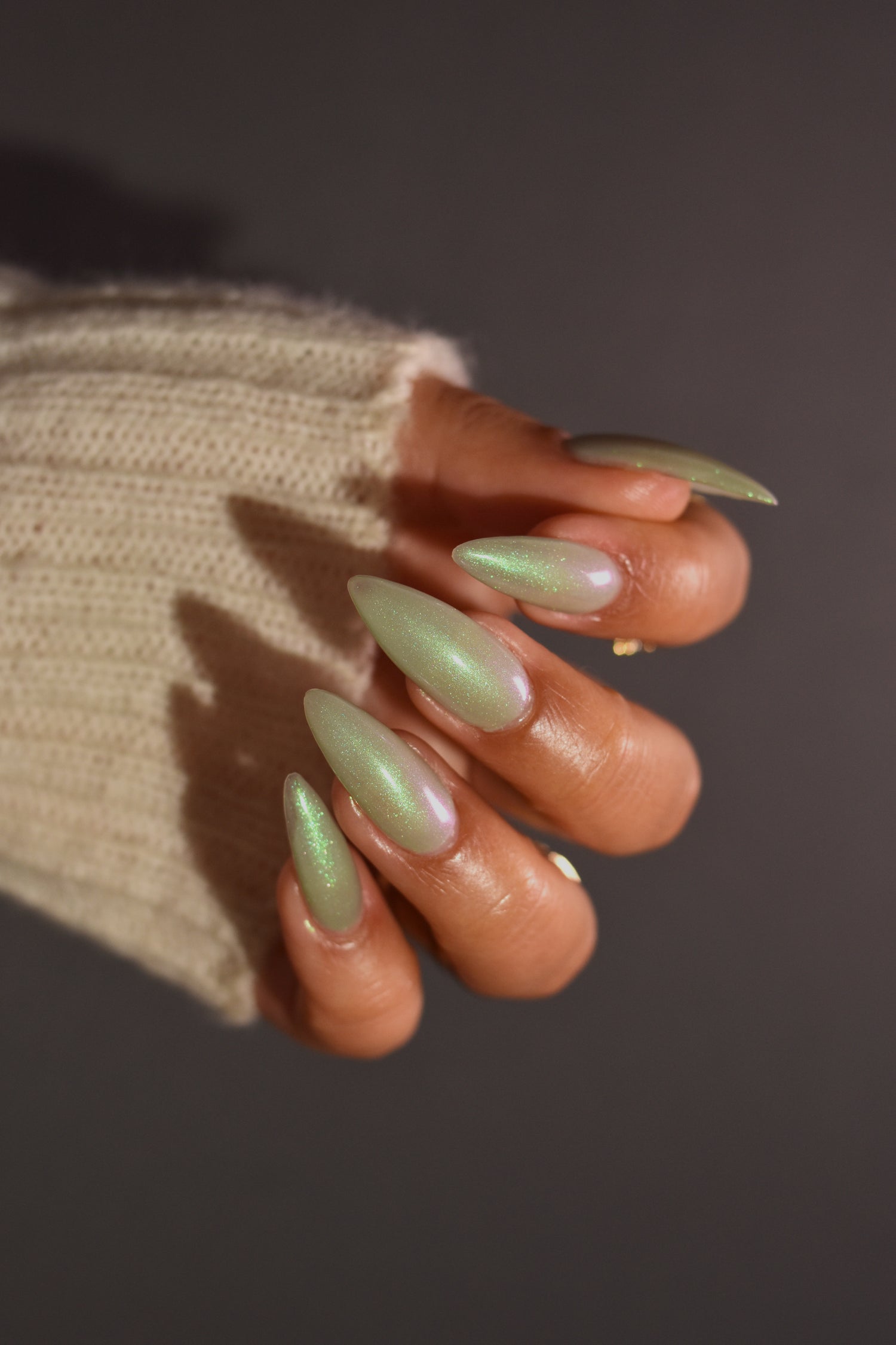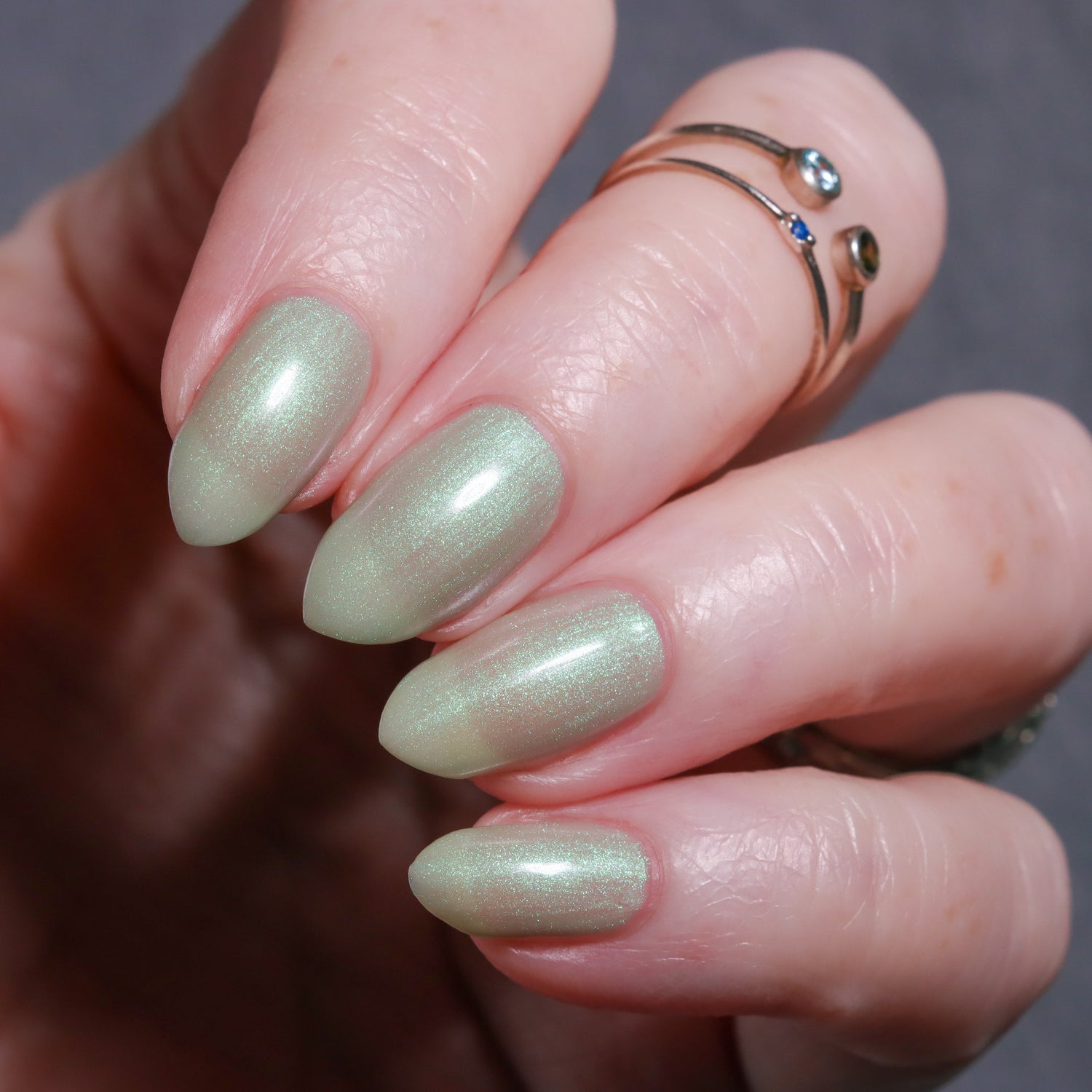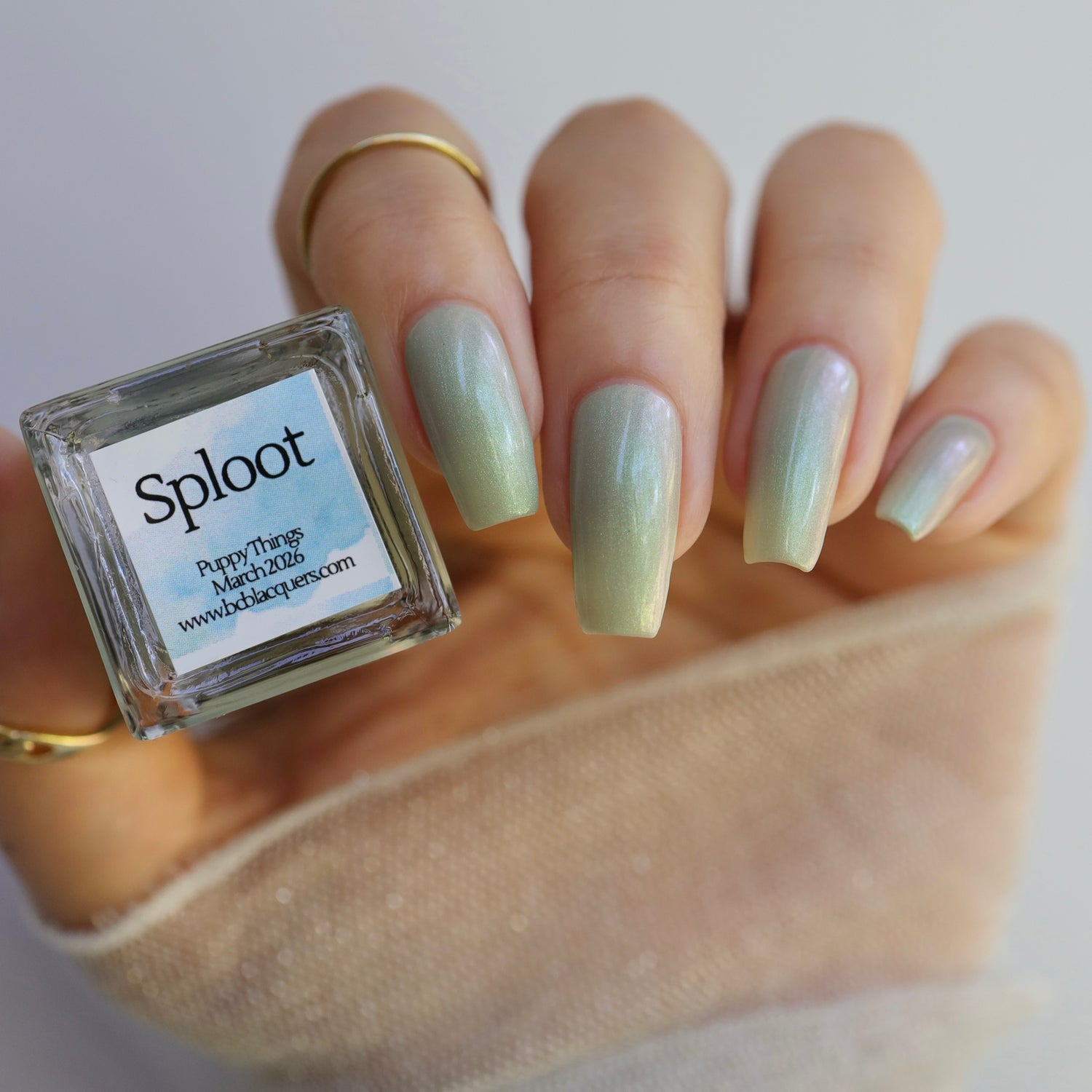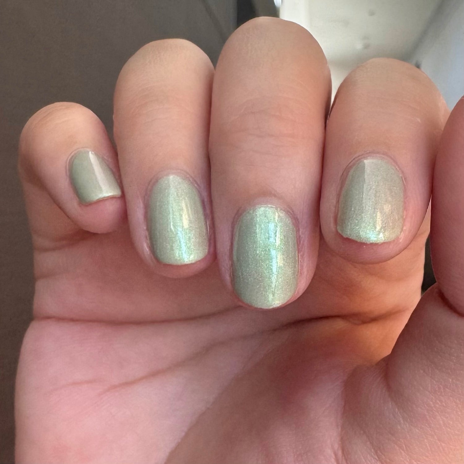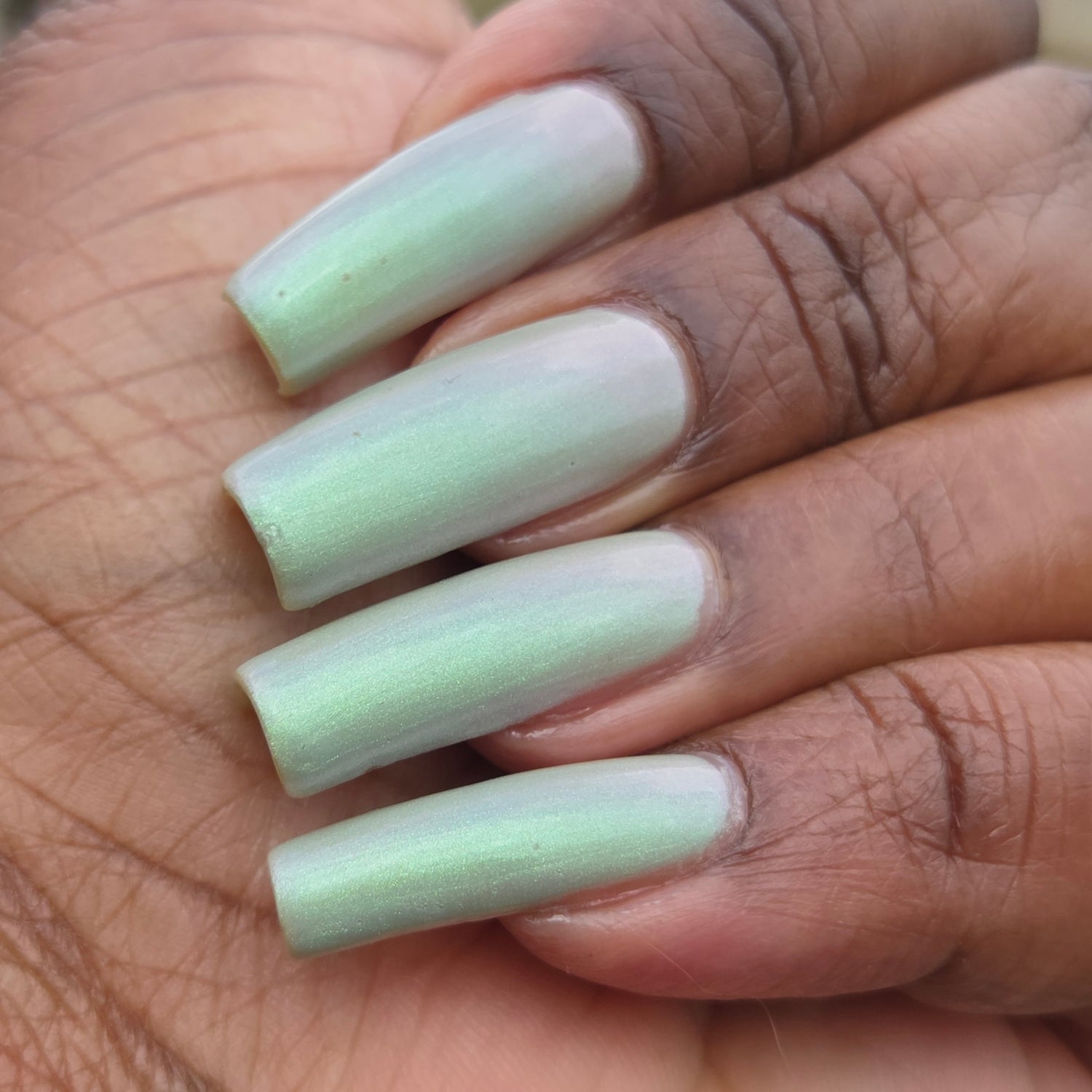 Sploot: A bright light sage crelly with a strong green/pink/purple shifting shimmer.