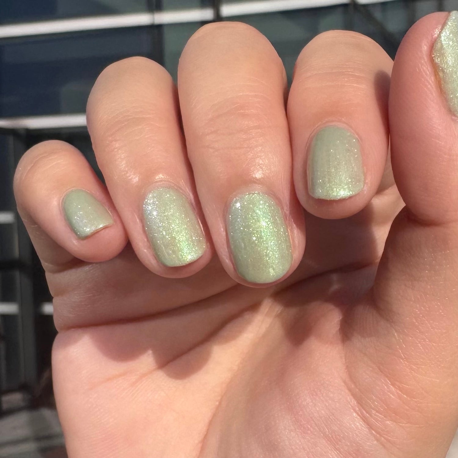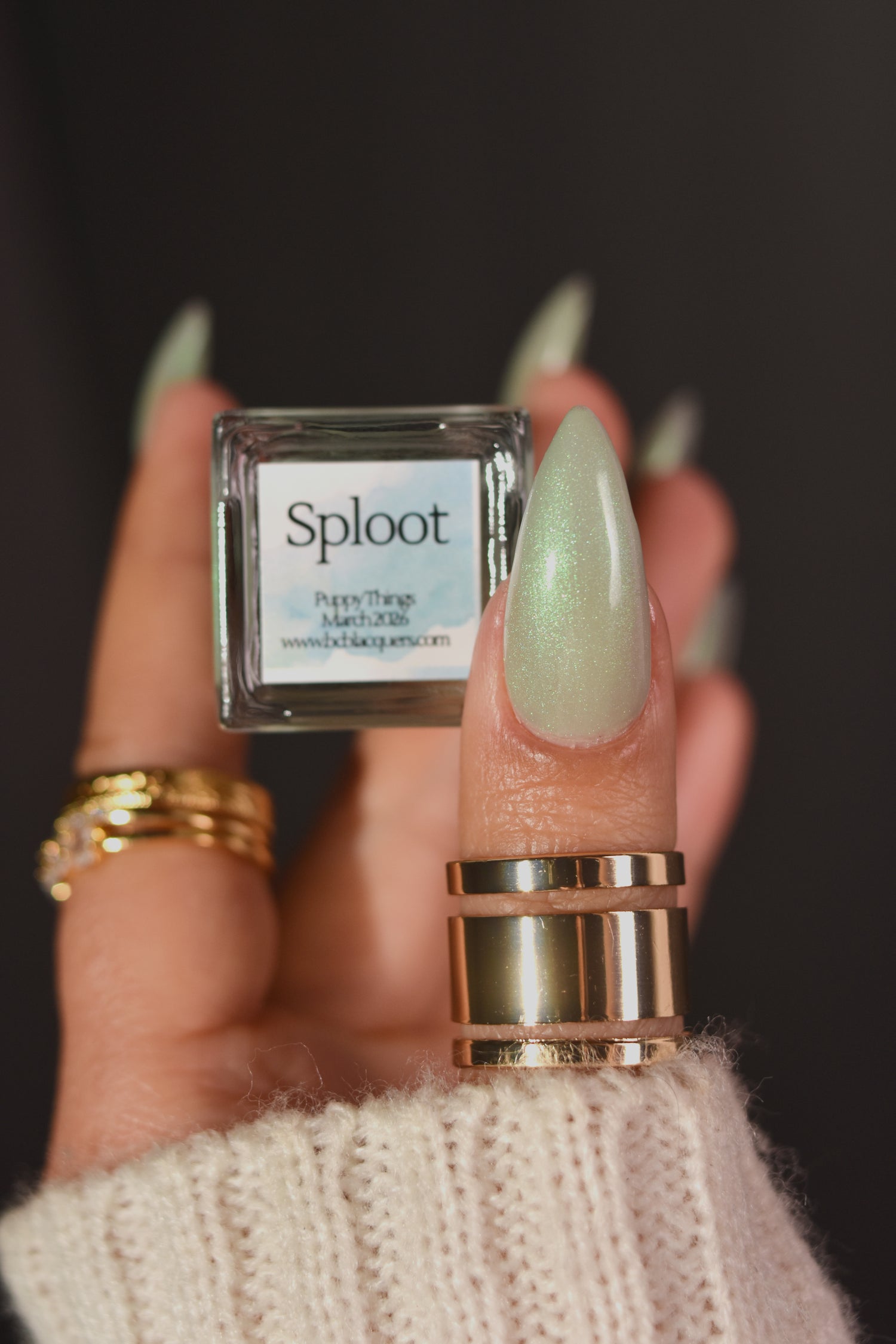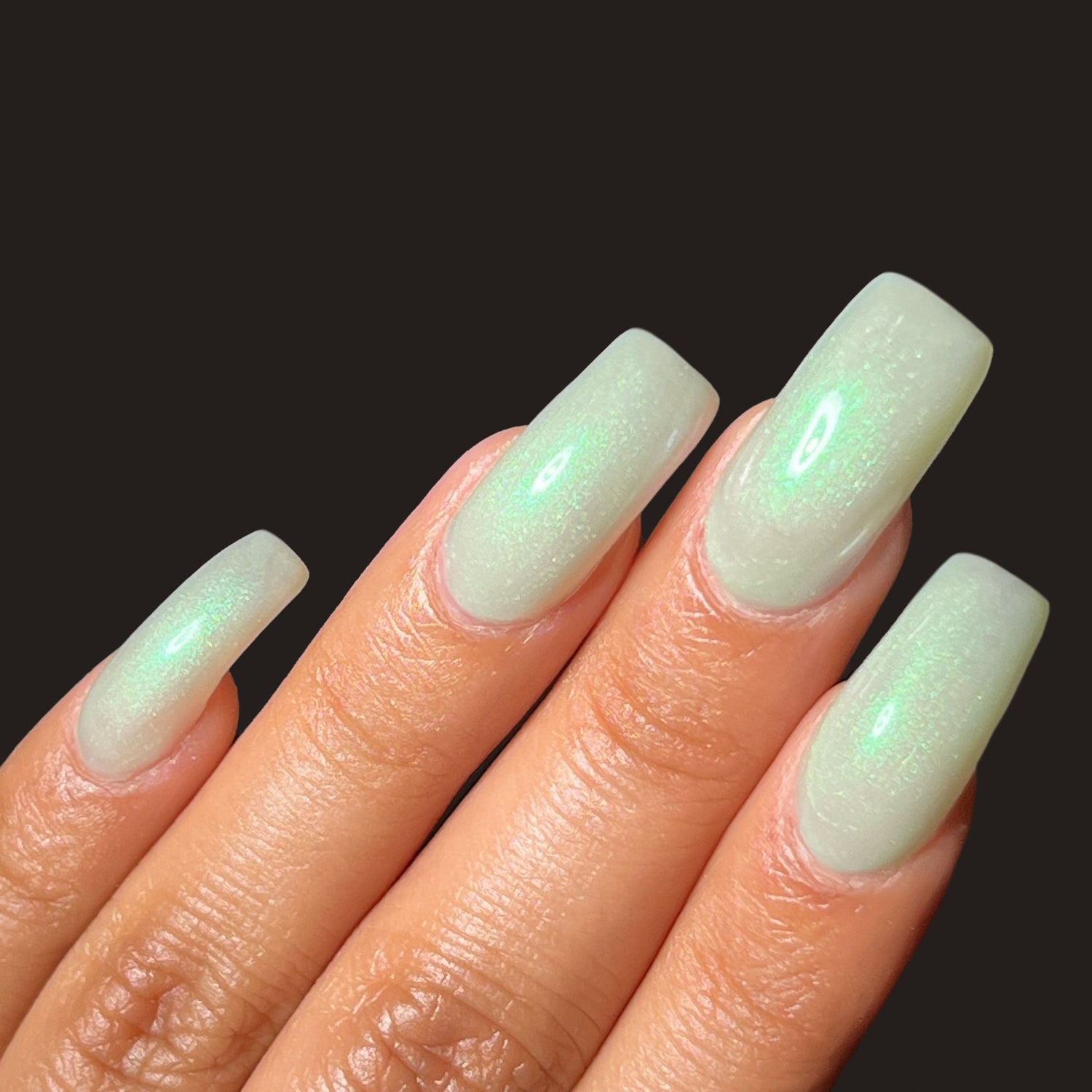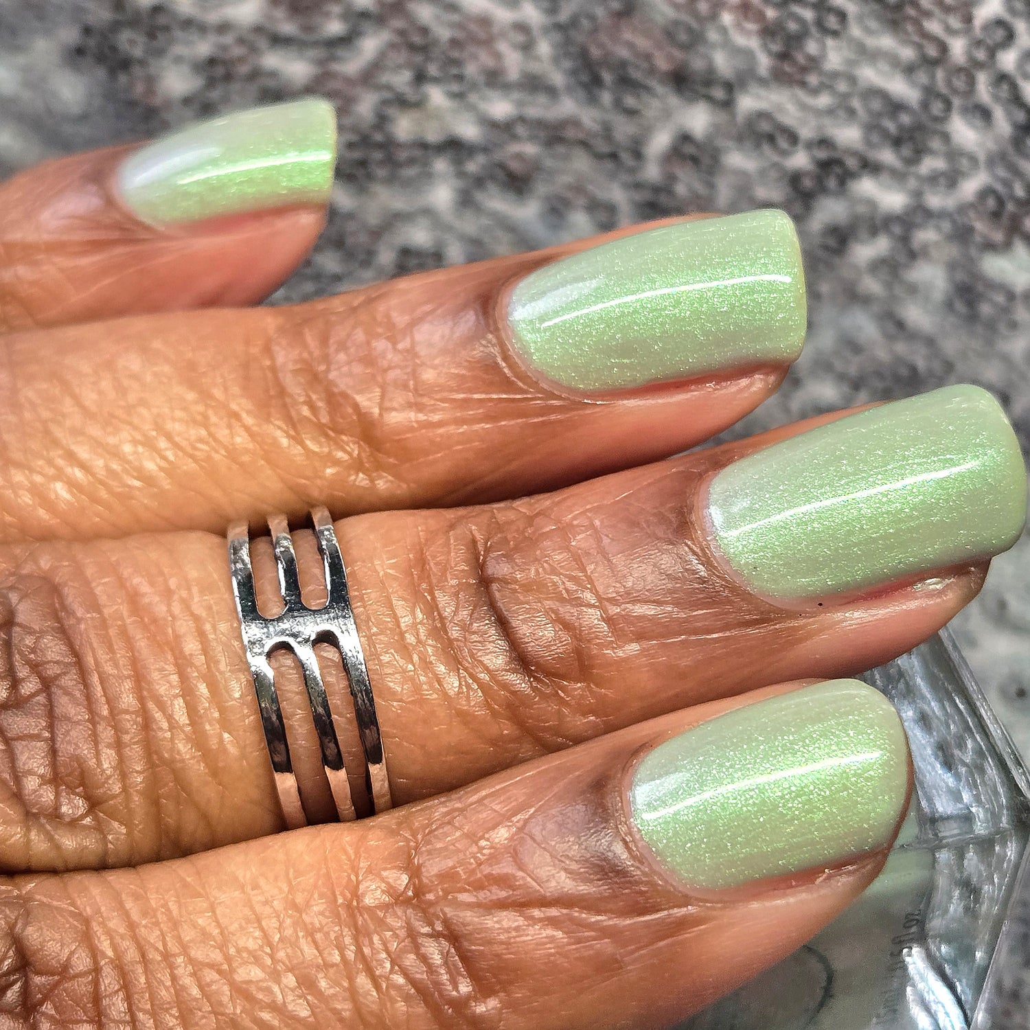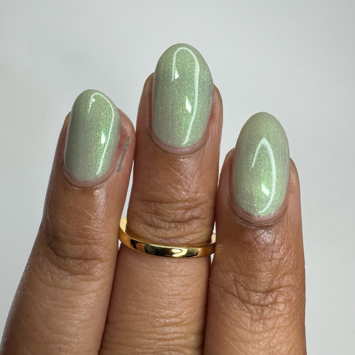 Sploot: A bright light sage crelly with a strong green/pink/purple shifting shimmer.