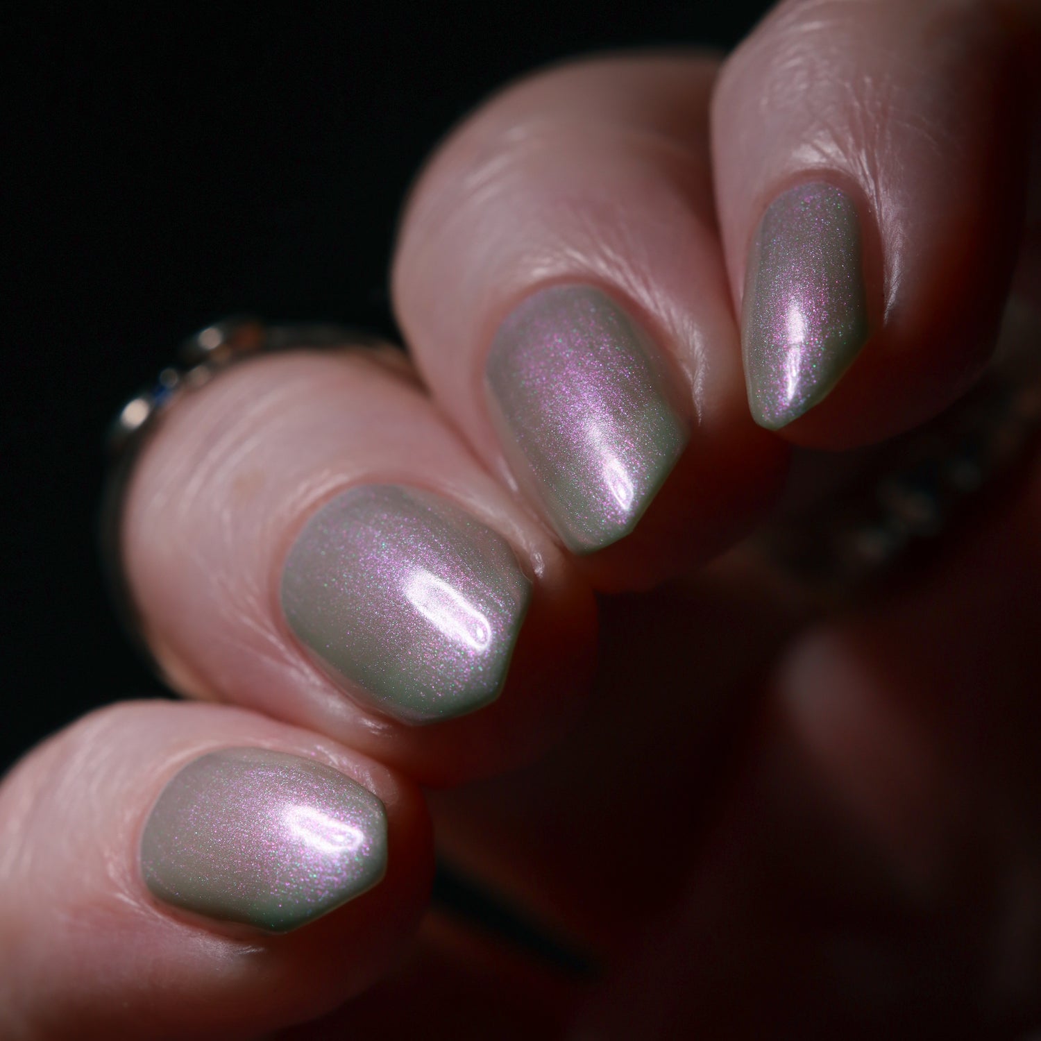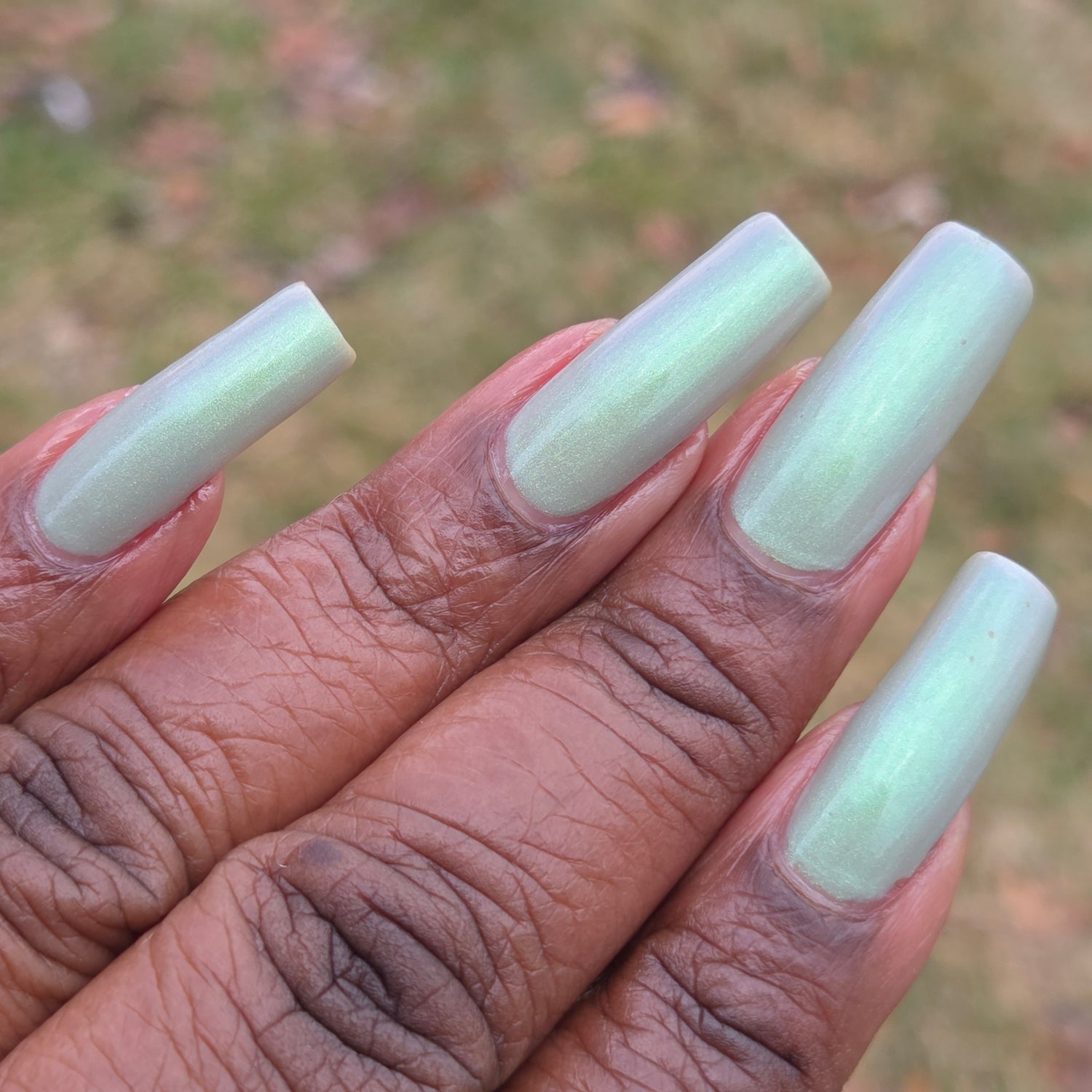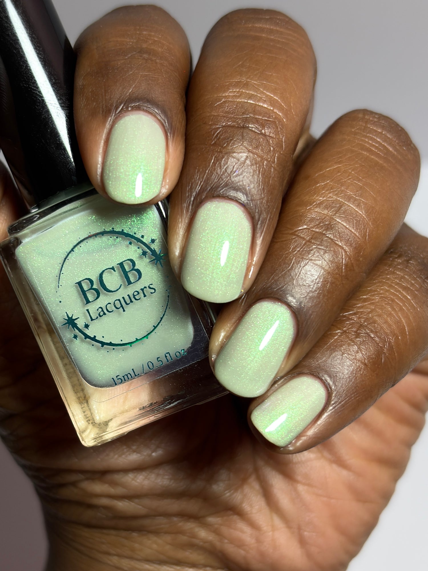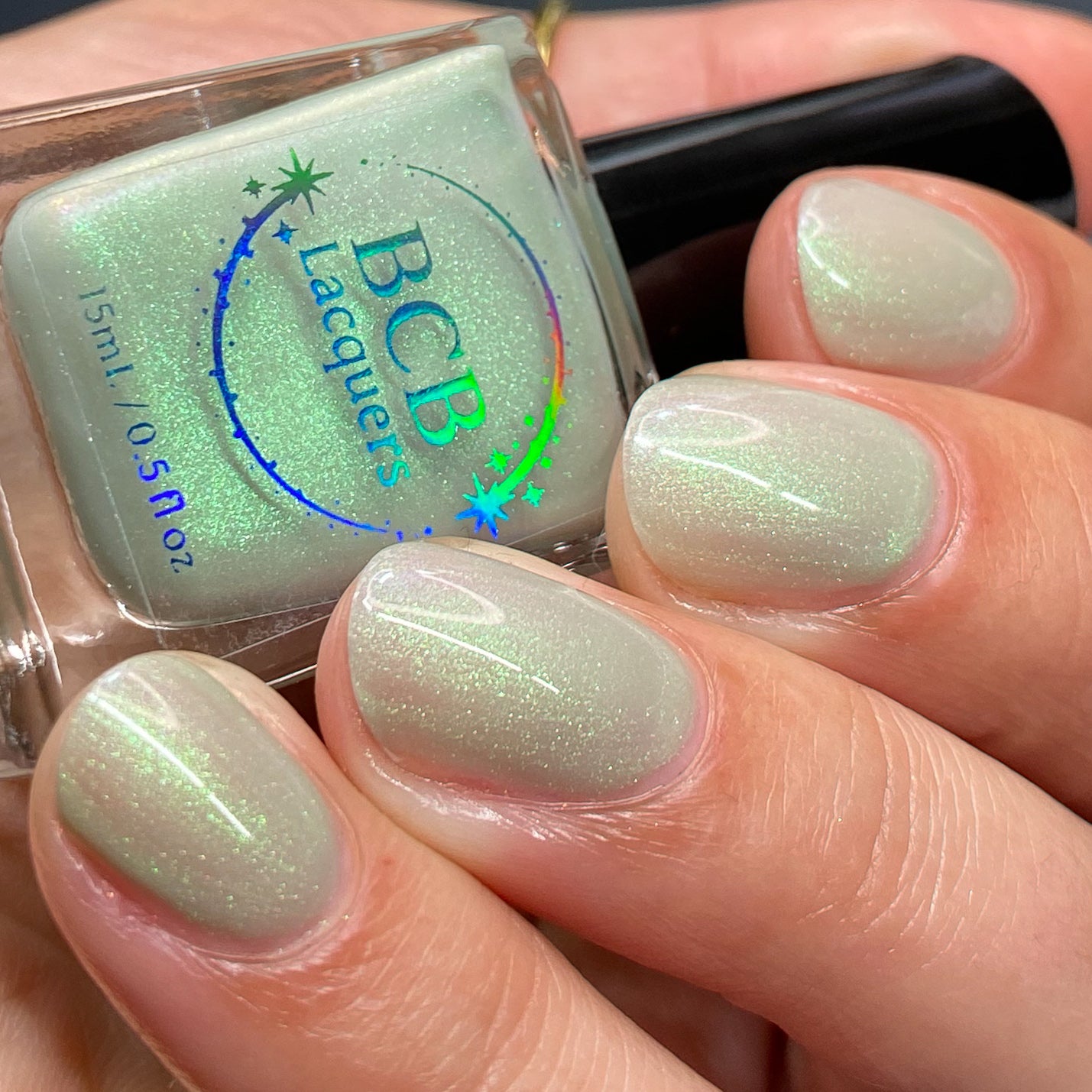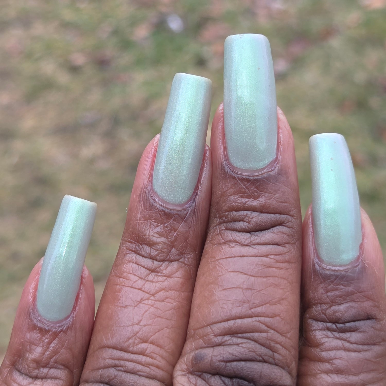 Sploot: A bright light sage crelly with a strong green/pink/purple shifting shimmer.