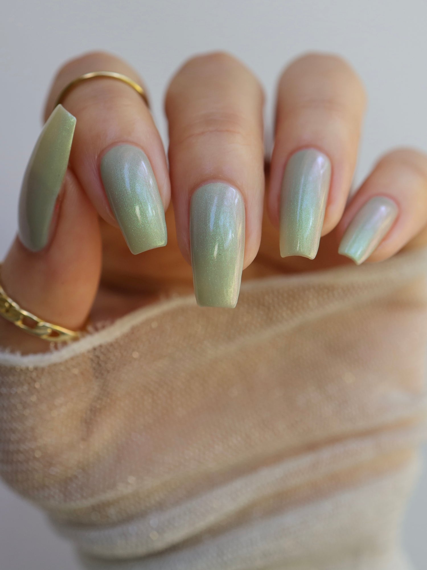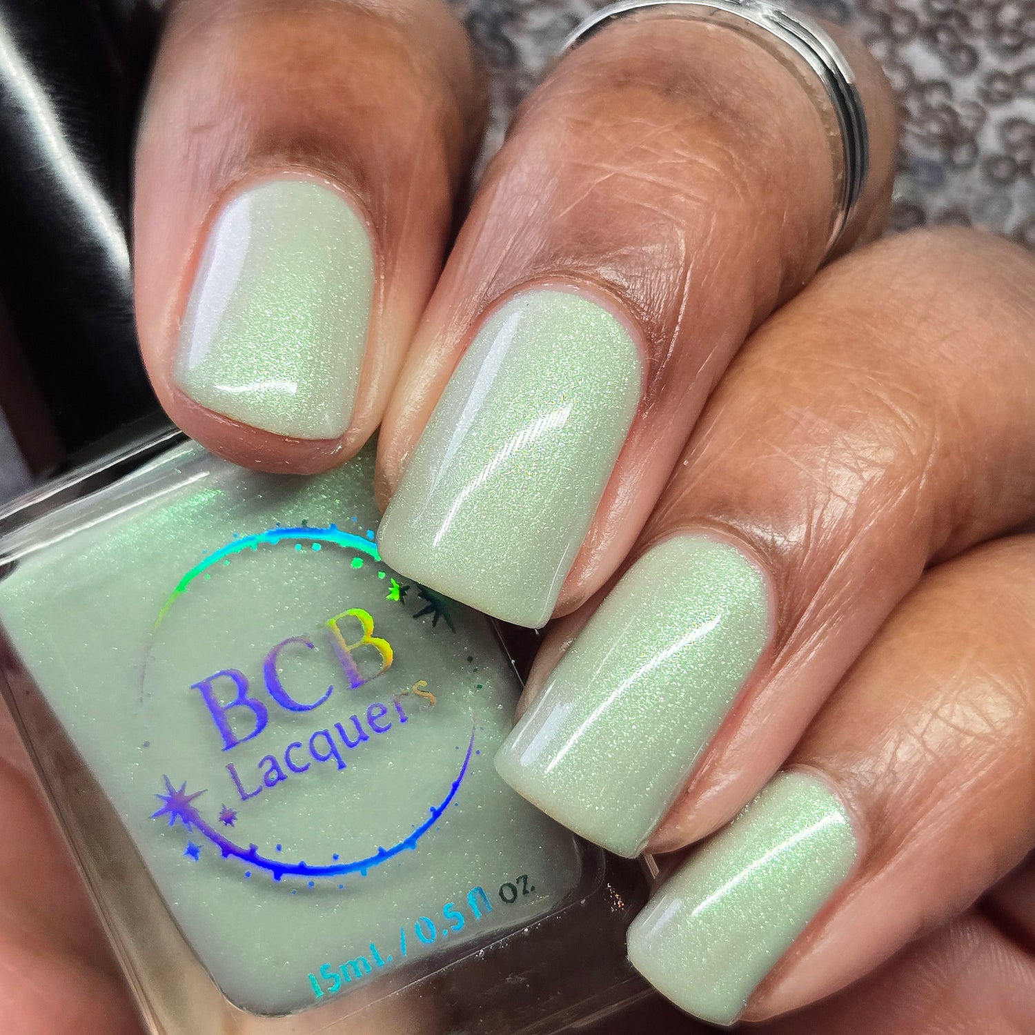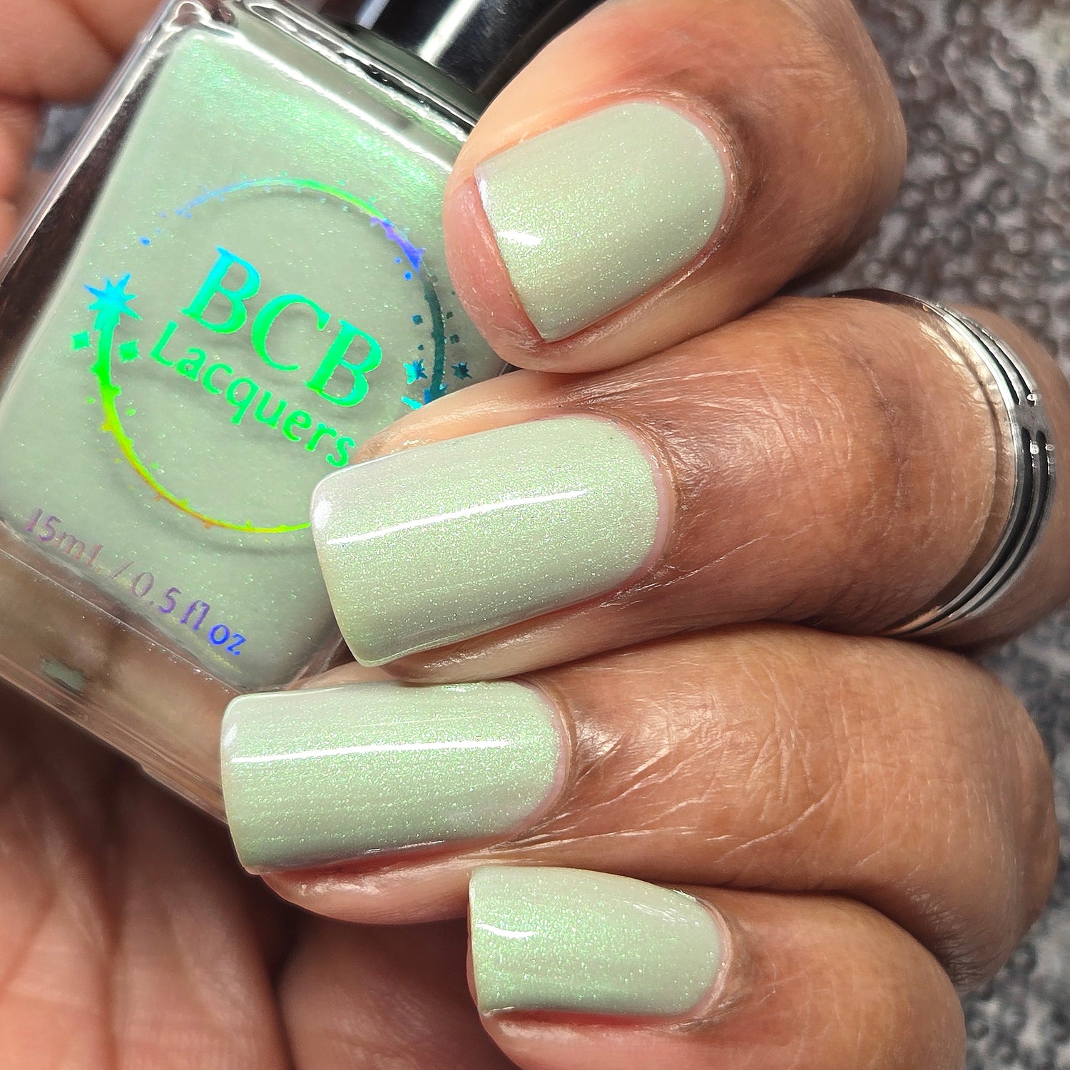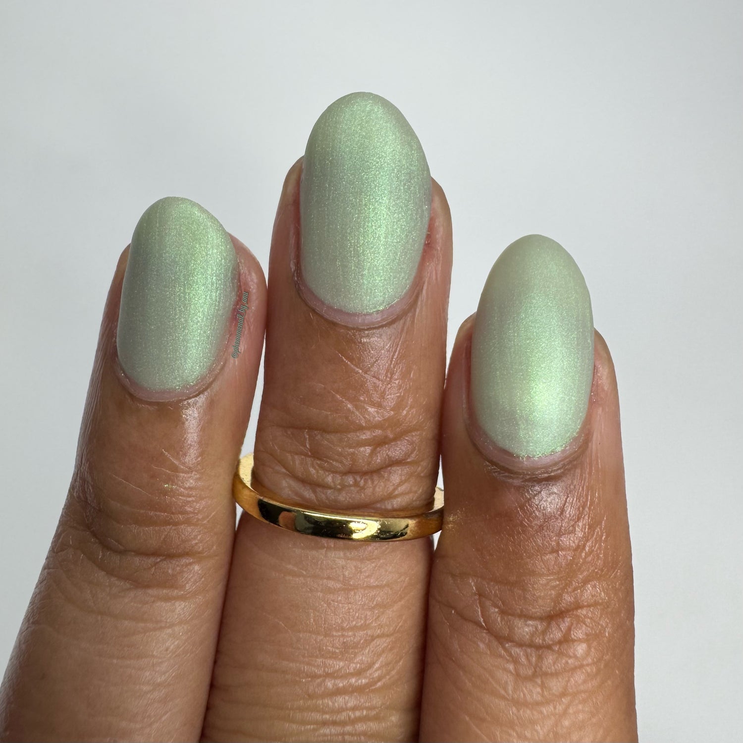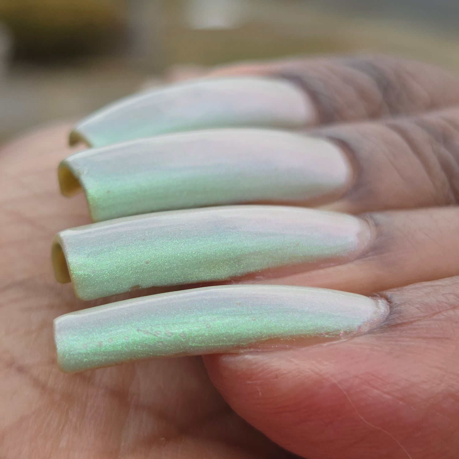 Sploot: A bright light sage crelly with a strong green/pink/purple shifting shimmer.