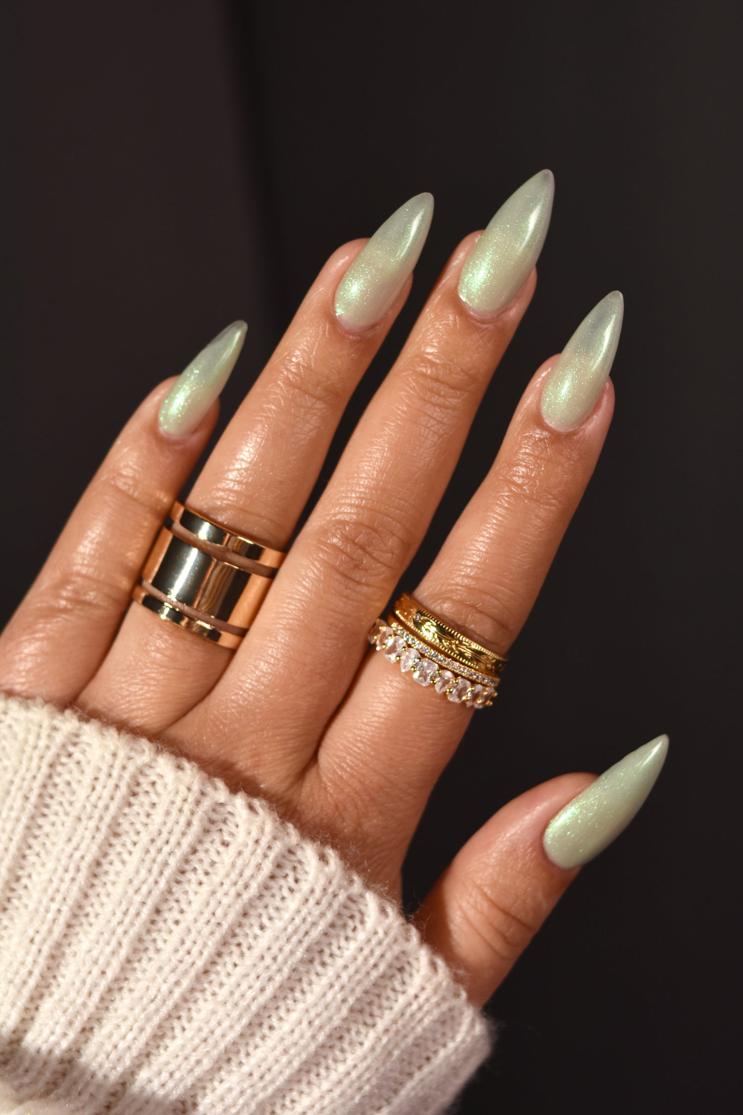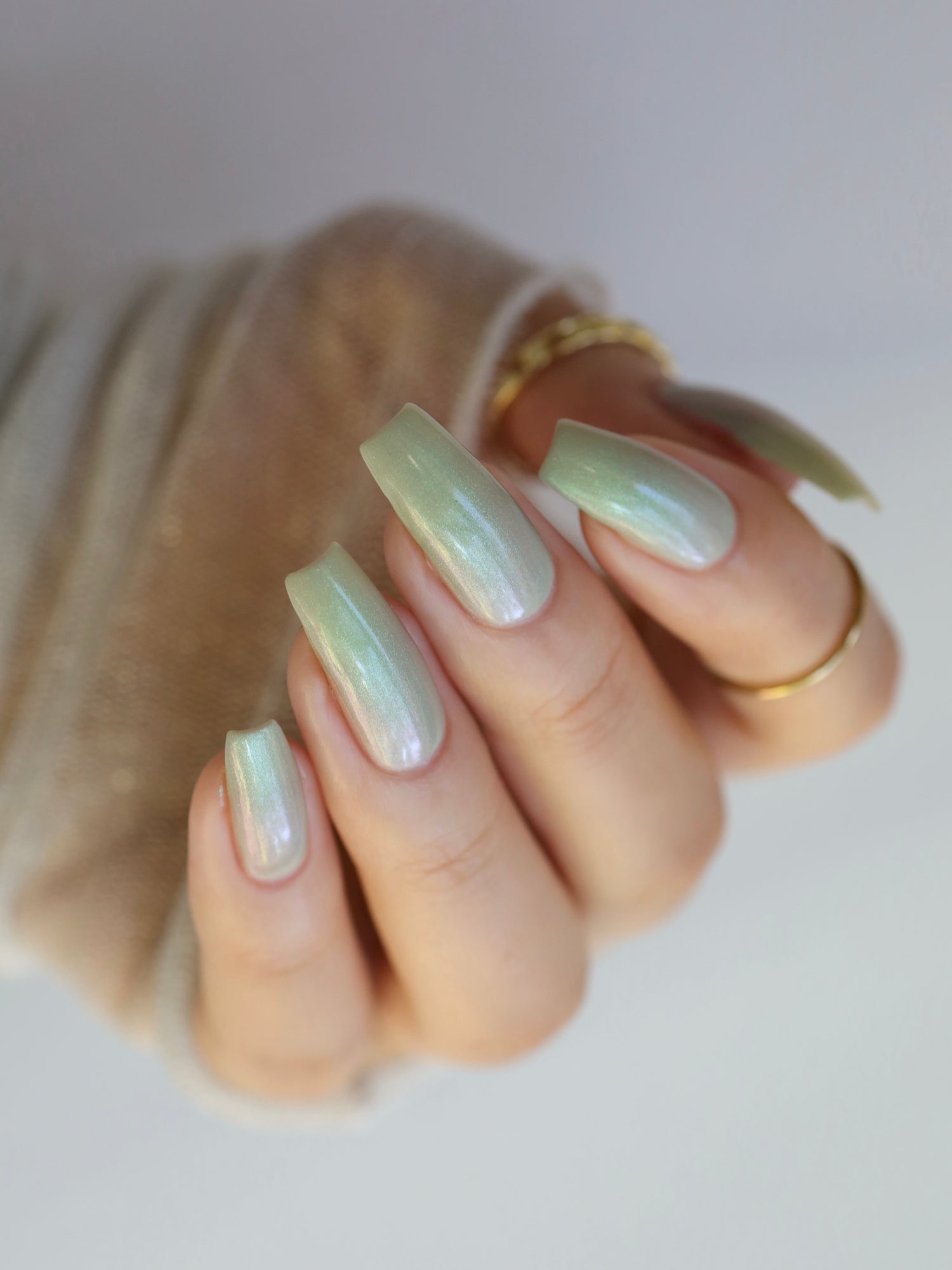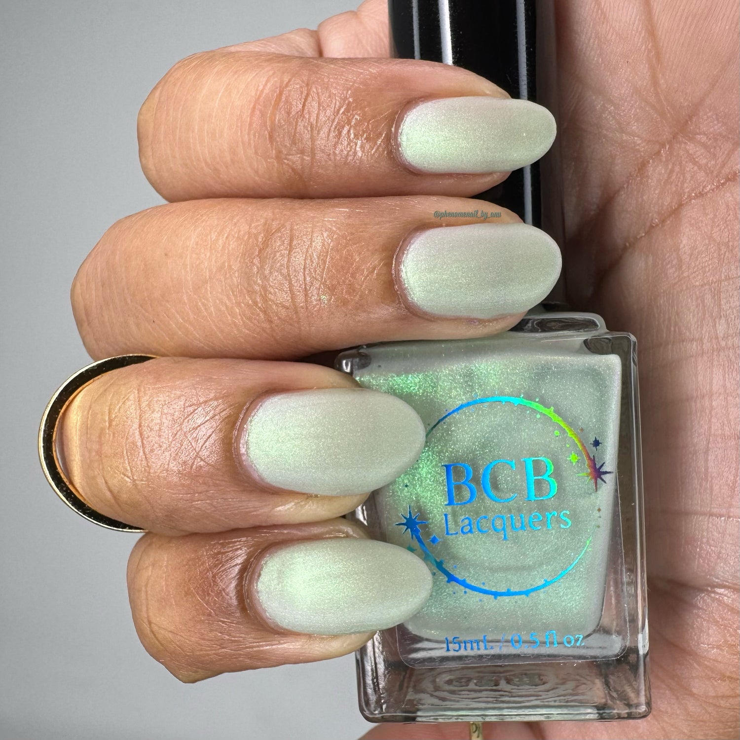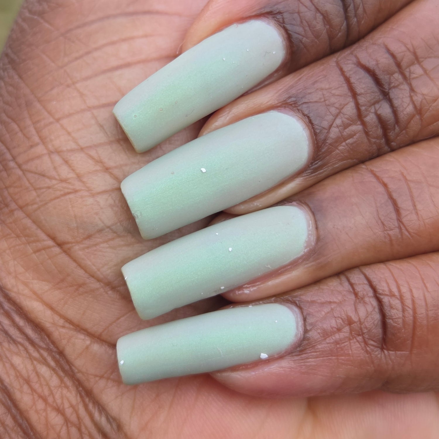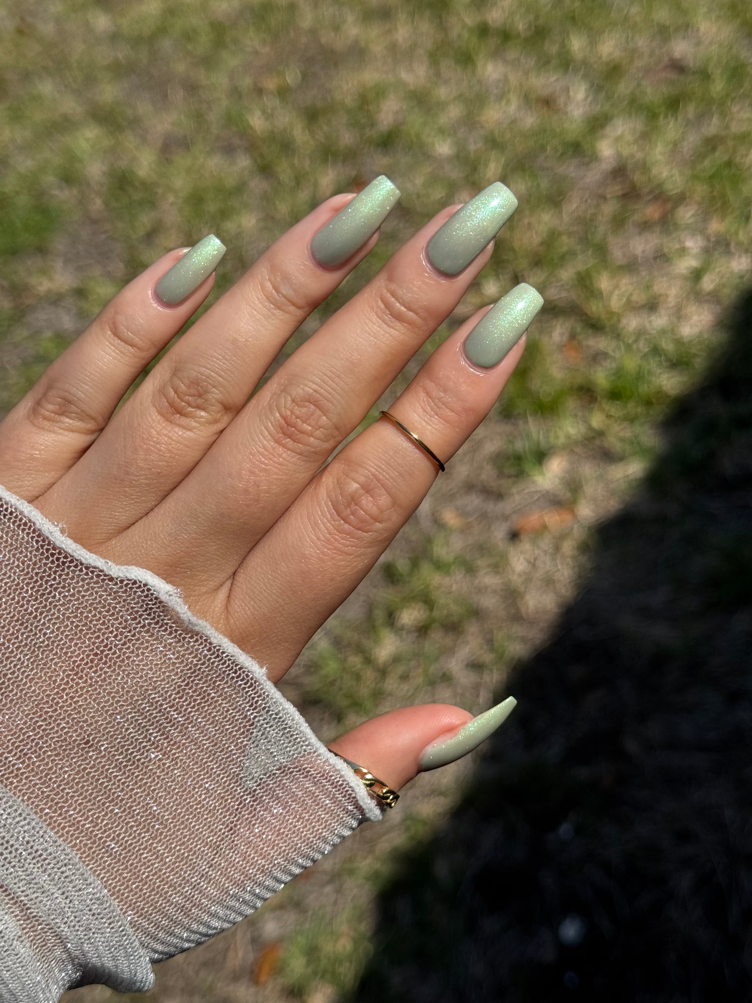 Sploot: A bright light sage crelly with a strong green/pink/purple shifting shimmer.