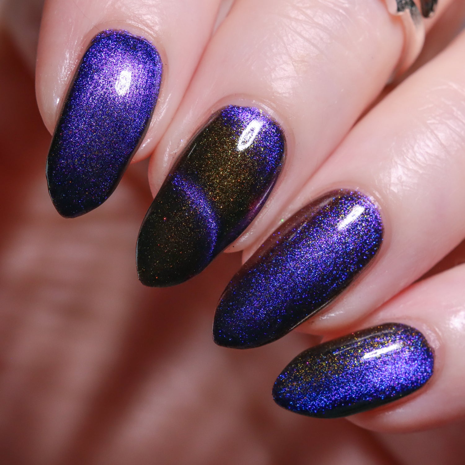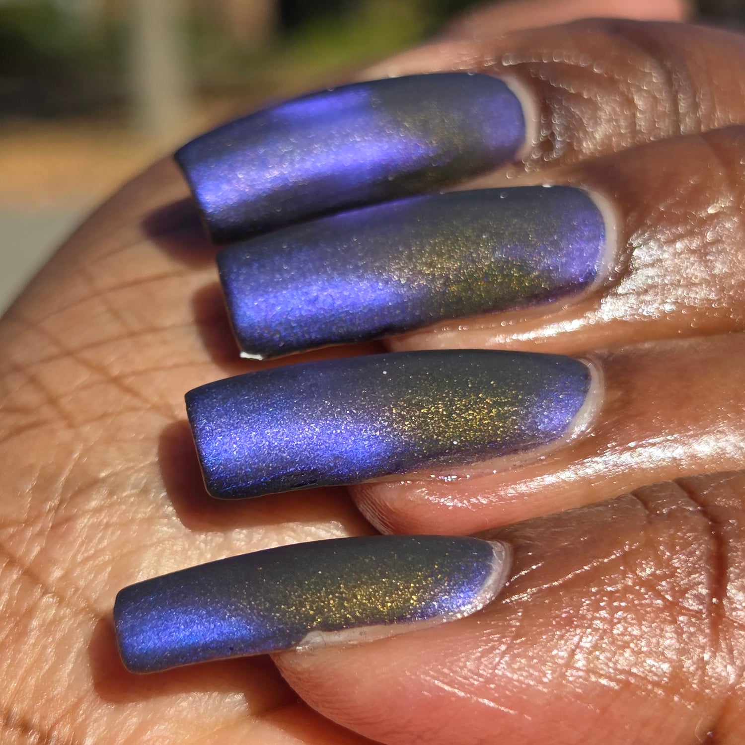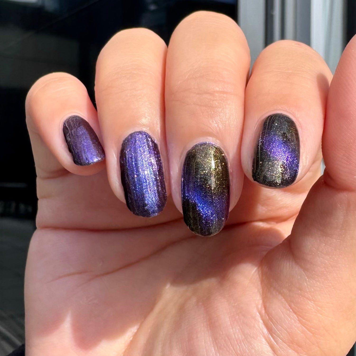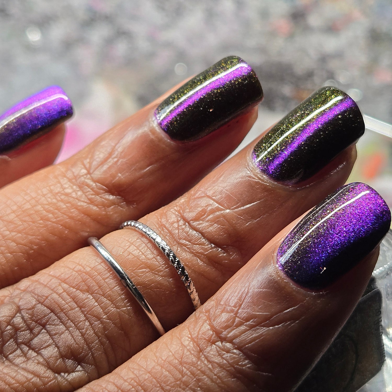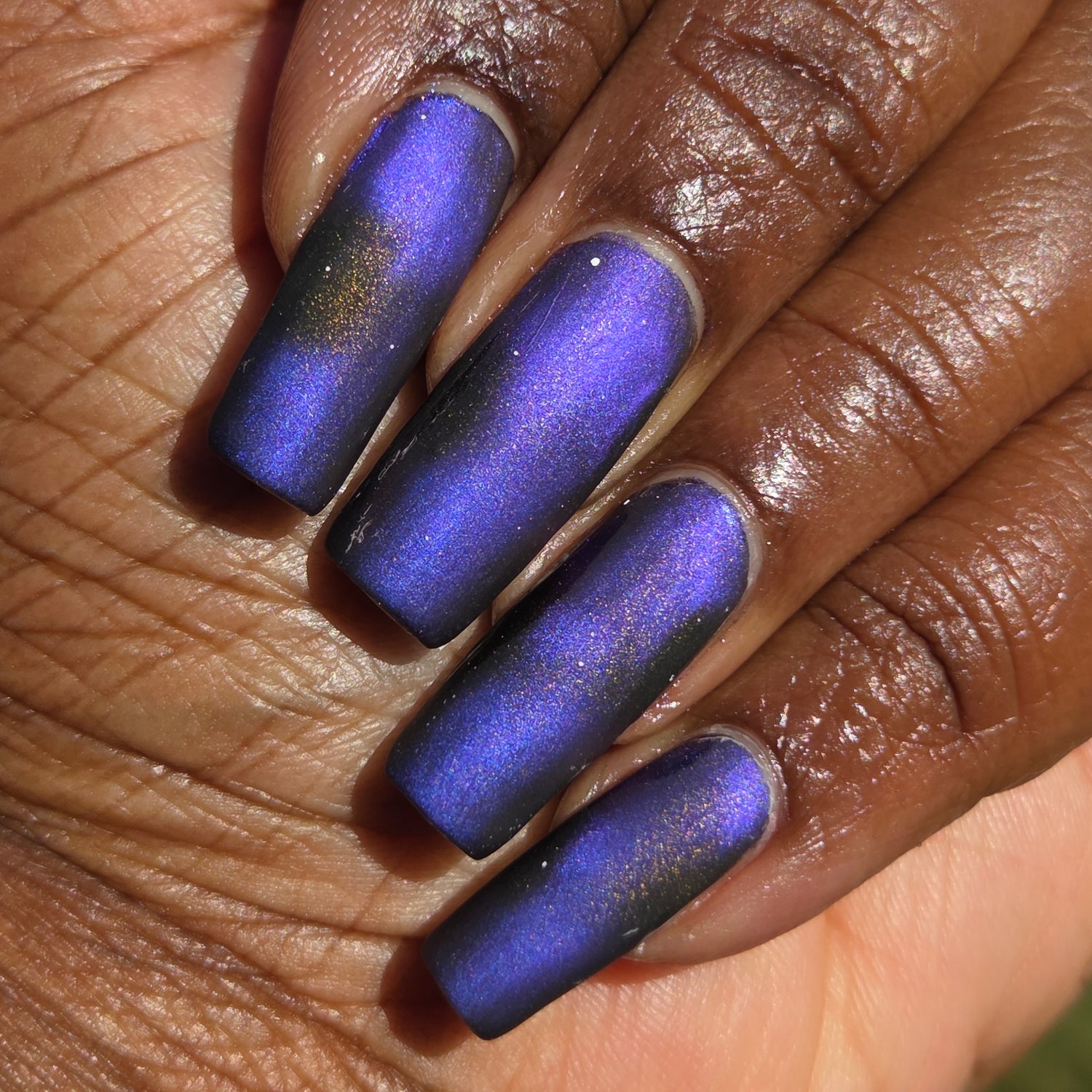 There’s No Devil In The Craft - *MAGNETIC*: A black jelly base with a purple/blue multichrome pull and gold shifting shimmer.