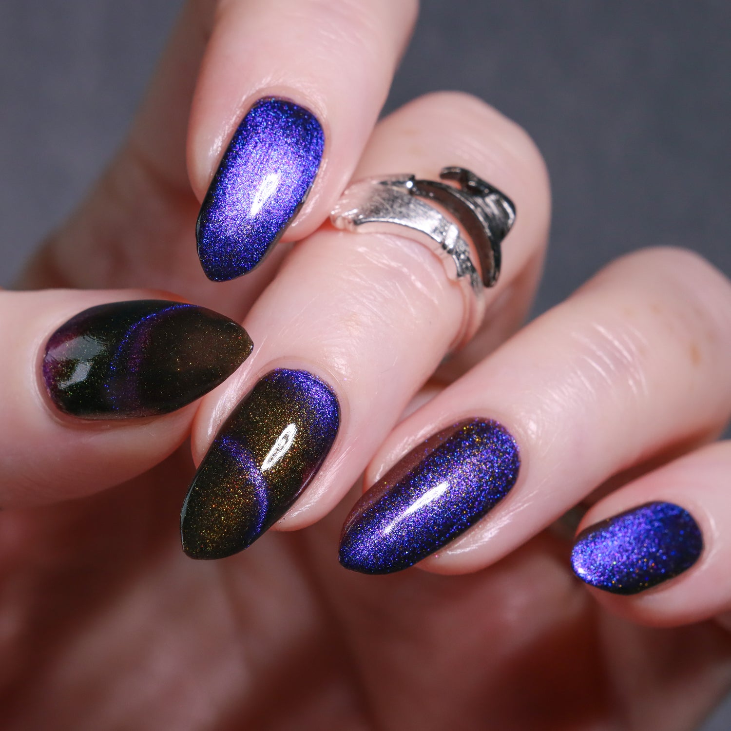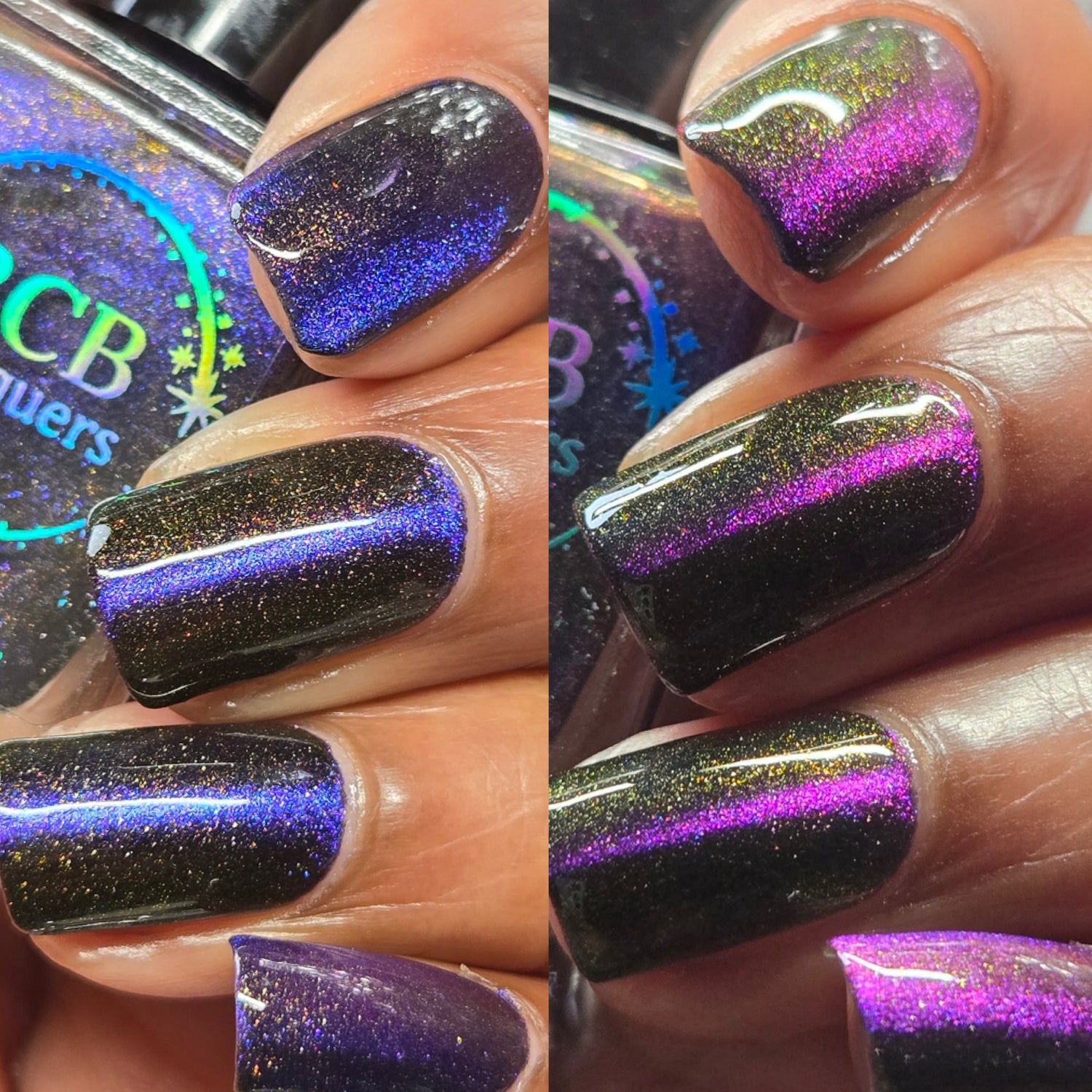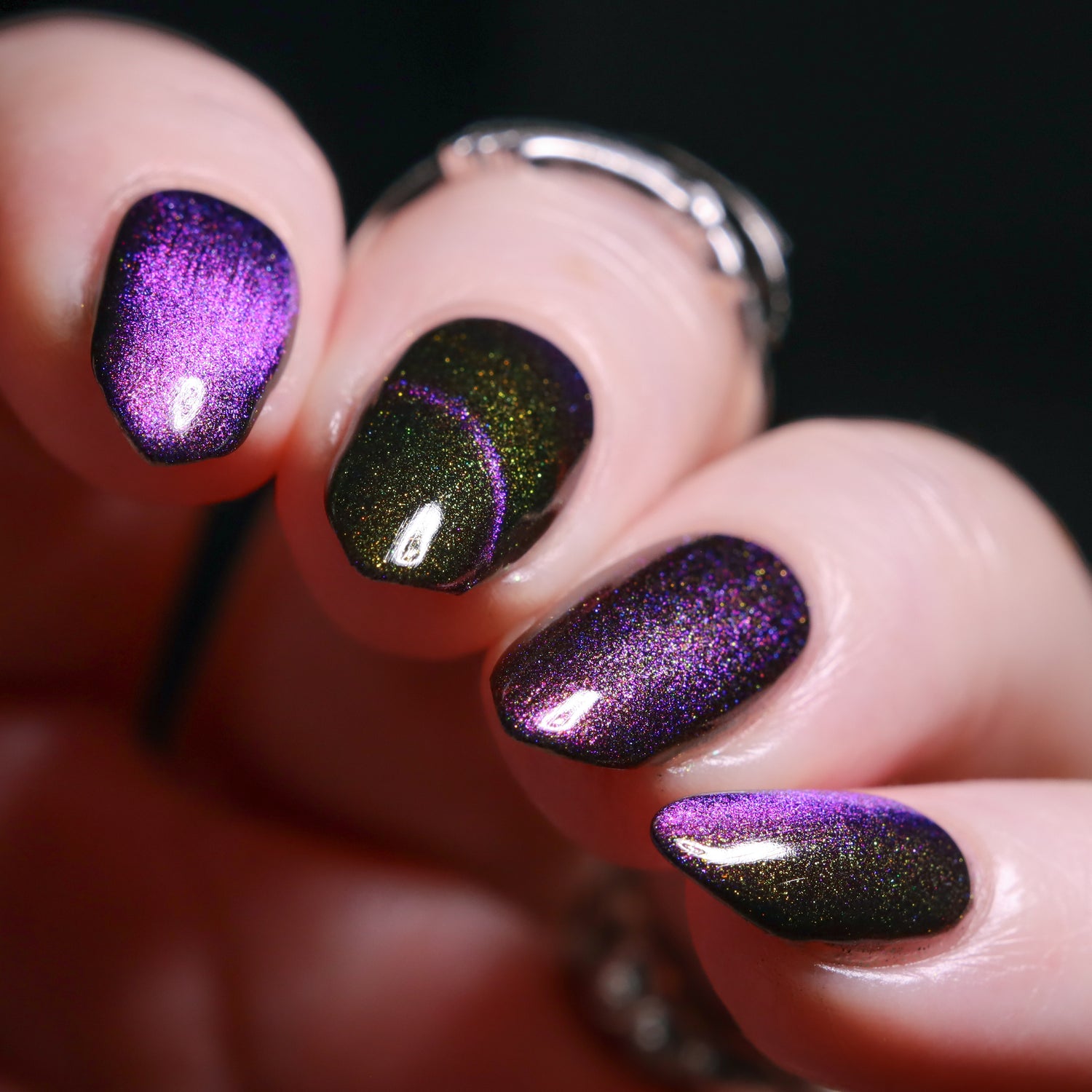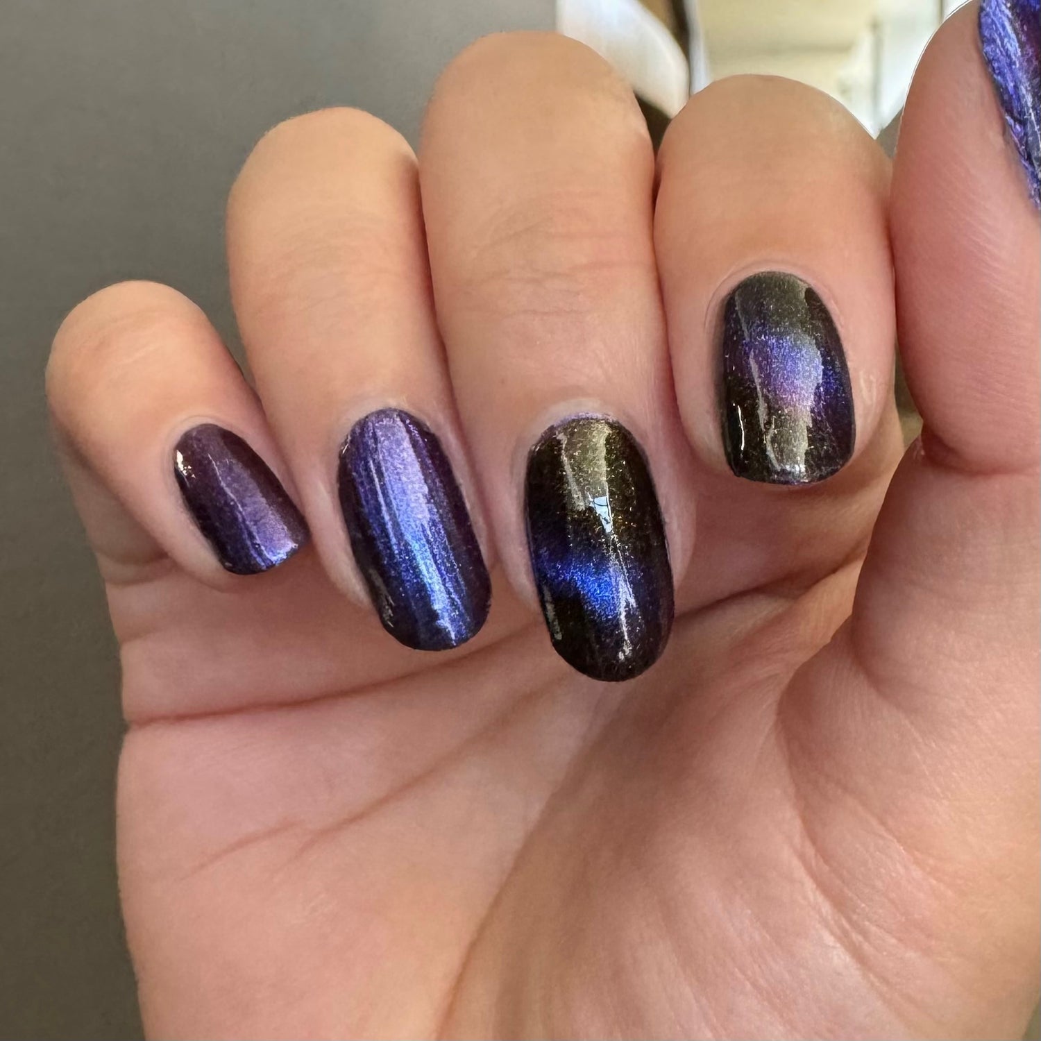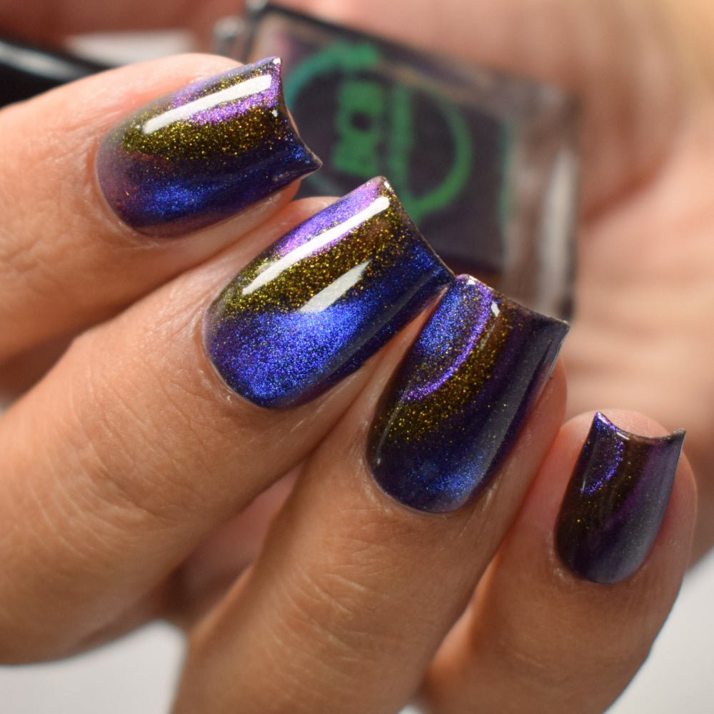 There’s No Devil In The Craft - *MAGNETIC*: A black jelly base with a purple/blue multichrome pull and gold shifting shimmer.